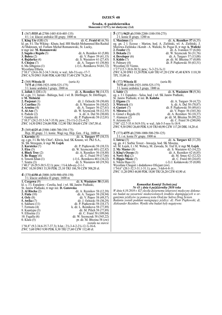 DZIEÑ 48 Œroda, 6 paŸdziernika S³onecznie (+12°C), tor elastyczny (3,4) 1 (367) 5535 z³ (2700-1485-810-405-135) 5 (371) 9625 z³ (5500-2200-1100-550-275) 2 (368) Witezia II 6 (372) Witezia II 4 l. i st. klacze arabskie III grupy. 1800 m 1. King Ute (GB) (3) d¿. C. Fraisl 61 (6,76) kl. gn. 4 l. The Wiking - Khute, hod. HH Sheikh Mohammed Bin Rashid Al Maktoum, w³. Fortum Micha³ Romanowski, St. Lucky, tr mgr in¿. M. Romanowski 2. Sagala z Regu³a (5) d¿. A. Reznikov 61 (5,88) 3. Bobra (2) d¿. V. Popov 59 (41,15) 4. Bajdarka (4) d¿. S. Wasiutow 61 (27,43) 5. Chojna (7) d¿. A. Turgaev 61 (30,86) 6. Ma Albigowa (1) (-1) L. Reznikova 54 (61,72) Wycofana Elfuria. 2’10.1” (24.6-36.2-34.7-34.6); w wal.; ³eb-3½-szy.-17-7. ZWC 6,70 DWJ 19,00 PDK 6,80 TRJ 57,40 CZW 78,20 z³. (seria A) 7175 z³ (3500-1925-1050-525-175) 3 l. konie arabskie I grupy. 1800 m 1. Jallah 1 (DE) (3) d¿. A. Reznikov 56 (14,53) kl. c.gn. 3 l. Jaman - Bahiega, hod. i w³. B. Dörflinger, St. Dörflinger, tr M. Me³nicki 2. Pasjonat (1) d¿. J. Ochocki 58 (30,68) 3. Czarlina (5) d¿. S. Wasiutow 56 (10,62) 4. Armina (4) d¿. A. Turgaev 56 (27,61) 5. Al-Am (7) d¿. W. Szymczuk 58 (12,55) 6. Padede (2) k. d¿. A. Dul 56 (30,68) 7. Gardan (6) d¿. P. Pi¹tkowski 58 (12,01) 2’10.3” (24.2-35.5-34.7-35.9); pew.; 2½-1½-2-2½-4-23. ZWC 14,50 DWJ 234,00 PDK 112,90 TRJ 384,60 CZW 1367,50 z³. 3 (369) 6125 z³ (3500-1400-700-350-175) Hcp. III grupy. 3 l. konie. Wagi wg. Hcp. Gen. -9 kg. 1600 m 1. Karmin (4) d¿. A. Turgaev 57 (10,33) og. c.gn. 3 l. Be My Chief - Kliwia, hod. SK Krasne, w³. PKI S.A., St. SK Strzegom, tr mgr M. £ojek 2. Karateka (7) d¿. P. Pi¹tkowski 58 (10,33) 3. Elza (5) d¿. W. Szymczuk 60½ (22,82) 4. Black Troy (2) d¿. A. Reznikov 56 (18,88) 5. Be Happy (6) d¿. C. Fraisl 59 (17,66) 6. Tenszin Khan (1) (-1) L. Reznikova 46½ (34,22) 7. Szatra (3) d¿. S. Wasiutow 60 (19,56) 1’40.1” (8-29.5-30.5-32.1); pew.; 1½-k.³eb-szy.-2-1-1. ZWC 10,30 DWJ 33,50 PDK 23,10 TRJ 186,70 CZW 508,20 z³. 4 (370) 6150 z³ (3000-1650-900-450-150) 3 l. klacze arabskie II grupy. 1600 m 1. Cergowa (9) d¿. S. Wasiutow 58 (5,68) kl. s. 3 l. Espadero - Cerelia, hod. i w³. SK Janów Podlaski, St. Janów Podlaski, tr mgr in¿. D. Gutowska 2. Al Rischa (2) d¿. A. Reznikov 58 (12,39) 3. Fiala (10) d¿. A. Turgaev 58 (38,94) 4. Orly (8) d¿. V. Popov 58 (49,57) 5. Awika (7) d¿. J. Ochocki 58 (30,29) 6. Sakhara (11) d¿. P. Pi¹tkowski 58 (18,17) 7. Fermata (4) k. d¿. L. Reznikova 58 (77,89) 8. Ksantypa (3) d¿. M. Pilich 58 (77,89) 9. Elliseina (1) d¿. C. Fraisl 58 (109,04) 10. Fagalla (6) d¿. W. Szymczuk 58 (545,22) 0. Klara (5) pr. d¿. M. Bøezina 58 (zw) zosta³a na starcie 1’56.8” (9.2-34.6-35.7-37.3); b.³at.; 2½-3-4-2-2½-12-½-16-6. ZWC 5,60 DWJ 9,90 PDK 8,30 TRJ 27,60 CZW 112,40 z³. 2 l. konie II grupy. 1200 m 1. Maximus (1) d¿. A. Reznikov 57 (6,35) og. gn. 2 l. Ecosse - Marion, hod. A. Zieliñski, w³. A. Zieliñski, J. Mierzwa Zieliñska i Korab - A. Walicki, St. Pegaz II, tr mgr A. Walicki 2. Feodor (5) d¿. A. Ivanskoi 57 (6,84) 3. Dekada (3) d¿. W. Szymczuk 56 (31,76) 4. Developer (6) d¿. A. Turgaev 57 (13,08) 5. Kiddo (7) pr. d¿. M. Bøezina 57 (0,00) 6. Palmary (4) d¿. P. Pi¹tkowski 58 (63,51) Wycofany El Viento. 1’17”(15.7-30.8-30.5); pew.; ¾-3-2½-¾-11 ZWC 6,30 DWJ 13,20 PDK 6,60 TRJ 47,20 CZW 45,40 KWN 1110,30 TPL 53,00 z³. (seria B) 7175 z³ (3500-1925-1050-525-175) 3 l. konie arabskie I grupy. 1800 m 1. Sabir (3) d¿. S. Wasiutow 58 (9,36) og. s. 3 l. Espadero - Salsa, hod. i w³. SK Janów Podlaski, St. Janów Podlaski, tr in¿. D. Ka³uba 2. Elgana (5) d¿. A. Turgaev 56 (4,72) 3. Wietrzyk (1) k. d¿. A. Dul 58 (70,87) 4. Gustaw (7) d¿. P. Pi¹tkowski 58 (49,61) 5. Mirawa (4) d¿. V. Popov 56 (165,36) 6. Gimel z Regu³a (8) d¿. A. Reznikov 56 (18,37) 7. Alamayn (2) pr. d¿. M. Bøezina 58 (99,22) 8. Arizona (6) d¿. C. Fraisl 56 (248,04) 2’08” (22.7-35.4-34.9-35); w wal.; ³eb-5-5-nos-¾-18-9. ZWC 9,30 DWJ 26,60 PDK 8,10 TRJ 60,90 CZW 117,20 DBL 14,20 z³. 7 (373) 4375 z³ (2500-1000-500-250-125) 3 l. i st. konie IV grupy. 1800 m 1. Intruz (5) d¿. A. Turgaev 62 (11,20) og. gn. 4 l. Sorbie Tower - Inwazja, hod. SK Moszna, w³. M. £ojek, I. i M. Wolscy, M. Zawada, St. Traf II, tr mgr M. £ojek 2. My Master (8) d¿. S. Wasiutow 62 (14,22) 3. King's Ocean (3) d¿. A. Reznikov 62 (6,85) 4. Nowy Raj (2) d¿. M. Srnec 62 (12,32) 5. Hippo Music (7) d¿. C. Fraisl 60 (24,65) 6. Nikita Haas (1) (-3) J. Ko³akowski 55 (0,00) Wycofane Chogori i dodatkowo Oficjant (zw). 1’54.6” (20.1-32.3-31.1-31.1); pew.; 3-³eb-6-8-11. ZWC 11,20 DWJ 44,80 PDK 18,00 TRJ 26,20 CZW 63,90 z³. Komunikat Komisji Technicznej Nr 43 z dnia 6 paŸdziernika 2010 roku W dniu 6.10.2010 r. KT zleci³a dy¿urnemu lekarzowi medycyny dokonanie badañ na zawartoœæ niedozwolonych œrodków dopinguj¹cych w organizmie jeŸdŸców za pomoc¹ testu OraLine Saliva Drug Screen. Badaniu zostali poddani nastêpuj¹cy jeŸdŸcy: d¿. Piotr Pi¹tkowski, d¿. Aleksander Reznikov. Wyniki obu badañ by³y negatywne.