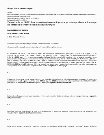 Urząd Gminy Gaworzyce Źródło: http://bip.gaworzyce.com.pl/gg/zarzadzenia-wojta/rok-2016/9887,Zarzadzenie-nr-212016-w-sprawie-ogloszenia-II-przetarguustnego-nieograniczonego.html Wygenerowano: Środa, 8 marca 2017, 13:54 Data publikacji 09.03.2016 Zarządzenie nr 21/2016- w sprawie ogłoszenia II przetargu ustnego nieograniczonego na sprzedaż nieruchomości niezabudowanych ZARZĄDZENIE NR 21/2016 WÓJTA GMINY GAWORZYCE z dnia 8 marca 2016r. w sprawie ogłoszenia II przetargu ustnego nieograniczonego na sprzedaż nieruchomości niezabudowanych stanowiących własność Gminy Gaworzyce. Na podstawie art. 30 ust. 2 pkt. 3 ustawy z dnia 8 marca 1990 r. o samorządzie gminnym (t. j. Dz. U. z 2015, poz. 1515 ze zm.), art. 28, art. 37 ust. 1, art. 38 i art. 67 ust. 2 pkt. 2 ustawy z dnia 21 sierpnia 1997 r. o gospodarce nieruchomościami (t. j. Dz. U. z 2015, poz. 1774 ze zm.), rozporządzenia Rady Ministrów z dnia 14 września 2004 w sprawie sposobu i trybu przeprowadzania przetargów oraz rokowań na zbycie nieruchomości (t. j. Dz. U. z 2004 Nr 207 poz. 2108 ze zm.), §6 ust. 1 pkt. 3 Uchwały Rady Gminy Nr XXV/143/2009 z dnia 25 czerwca 2009 r. w sprawie zasad nabywania, zbywania i obciążania nieruchomości Gminy Gaworzyce oraz ich wydzierżawiania lub wynajmowania, Uchwały Rady Gminy Gaworzyce Nr XXVII/162/2009 z dnia 27 listopada 2009r. w sprawie wyrażenia zgody na zbycie nieruchomości w drodze przetargu oraz Zarządzeniem nr 61/2015 z dnia 16 października 2015r. zarządzam co następuje: § 1. Ogłaszam II przetarg ustny nieograniczony na sprzedaż nieruchomości niezabudowanych oznaczonych numerem geodezyjnym 344/9 o pow. 1169 m2 oraz 344/10 o pow. 1056 m2 zapisanych w Księdze Wieczystej LE1G/00031350/5 położonych w miejscowości Kłobuczyn gmina Gaworzyce - zgodnie z załącznikiem nr 1. § 2. Zatwierdzam Regulamin dotyczący sprzedaży w/w nieruchomości w drodze przetargu ustnego nieograniczonego – zgodnie załącznikiem nr 2 § 3. Powołuję Komisję przetargową w celu przeprowadzenia II przetargu ustnego nieograniczonego na sprzedaż w/w nieruchomości – zgodnie z załącznikiem nr 3. § 4. Załącznik o którym mowa w § 1 podlega podaniu do publicznej wiadomości na tablicy ogłoszeń Urzędu Gminy w Gaworzycach przez okres 30 dni od dnia podpisania, a informację o wywieszeniu wykazu podaje się do publicznej wiadomości przez ogłoszenie w prasie lokalnej, we wszystkich miejscowościach gminy oraz w Biuletynie Informacji Publicznej Gminy Gaworzyce, bip.gaworzyce.com.pl § 5. Wykonanie zarządzenia powierzam Zastępcy Wójta Gminy. § 6. Zarządzenie wchodzi w życie z dniem podpisania. Wójt (-) Jacek Szwagrzyk Załącznik Nr 1 do Zarządzenia Nr 21/2016 Wójta Gminy Gaworzyce z dnia 8 marca 2016r. OGŁOSZENIE I przetarg ustny nieograniczony przeprowadzono w dniu 21.01.2016r. zapraszam do wzięcia udziału w II przetargu ustnym nieograniczonym na sprzedaż niżej wymienionych nieruchomości niezabudowanych stanowiących własność Gminy Gaworzyce zapisanych w Księdze Wieczystej LE1G/00031350/5 położonych w Kłobuczynie (w MPZP wsi Kłobuczyn oznaczonych symbolem 7 MR/MN/UC zabudowa zagrodowa, zabudowa mieszkaniowa jednorodzinna z dopuszczeniem nieuciążliwych usług komercyjnych, usługi komercyjne). Położenie nr działki Kłobuczyn działka nr 344/9 Kłobuczyn działka nr 344/10 Cena wywoławcza (w zł netto) Wadium (zł) 1169 29.000,00 2.900,00 1056 26.000,00 2.600,00 Powierzchnia w m 2 Do wylicytowanej kwoty netto doliczony będzie podatek VAT. Postąpienie – o wysokości postąpienia decydują uczestnicy przetargu, z tym że postąpienie nie może wynosić mniej niż 1% ceny wywoławczej, z zaokrągleniem w górę do pełnych dziesiątek złotych. Na działce nr 344/9 znajduje się studzienka kanalizacyjna, sieć wodociągowa oraz istnieje możliwość doprowadzenia instalacji elektrycznej. Kształt działki jest regularny teren płaski. Dojazd i dostęp do nieruchomości dobry, droga o nawierzchni utwardzonej. Do działki nr 344/10 jest możliwość doprowadzenia instalacji elektrycznej oraz wodno - kanalizacyjnej. Kształt działki jest regularny teren płaski. Dojazd i dostęp do nieruchomości dobry, droga o nawierzchni utwardzonej. Przetarg ustny nieograniczony odbędzie się dnia 12 kwietnia 2016r. o godz. 10 Gaworzycach, 59-180 Gaworzyce, ul. Okrężna 85. 00 w Sali Nr 21 Urzędu Gminy w Warunkiem uczestnictwa w przetargu jest wpłata wadium w podanych wyżej wysokościach na konto Urzędu Gminy w BS Przemków Filia w Gaworzycach nr 28 8653 0004 0000 0093 4507 0010 najpóźniej do dnia 7 kwietnia 2016r. Dowód wpłaty wadium należy okazać przed przystąpieniem do licytacji. Wadium wpłacone przez uczestnika, który wygra przetarg zostanie zaliczone na poczet ceny nabycia nieruchomości. Wadium przepada na rzecz sprzedawcy w przypadku gdy osoba wygrywająca uchyli się od zawarcia aktu notarialnego. Zastrzega się odwołanie przetargu bez podania przyczyny. Dodatkowe informacje można uzyskać w Urzędzie Gminy w Gaworzycach, ul. Okrężna 85, 59-180 Gaworzyce (pokój nr 9, tel. (076) 8316-285 w. 46). Wójt (-) Jacek Szwagrzyk Załącznik nr 2 do Zarządzenia Nr 21/2016 Wójta Gminy Gaworzyce z dnia 8 marca 2016r. REGULAMIN DOTYCZĄCY TRYBU SPRZEDAŻY NIERUCHOMOŚCI NIEZABUDOWANYCH NUMER 344/9 ORAZ 344/10 POŁOŻONYCH W KŁOBUCZYNIE GM. GAWORZYCE W DRODZE II PRZETARGU USTNEGO NIEOGRANICZONEGO. 1. Przetarg odbywa się na podstawie art. 38, 42, 67 ustawy z dnia 21.08.1997 r. o gospodarce nieruchomościami (t. j. Dz. U. z 2015, poz. 1515 ze zm.) oraz Rozporządzenia Rady Ministrów z dnia 14 września 2004r. w sprawie sposobu i trybu przeprowadzania przetargów oraz rokowań na zbycie nieruchomości (Dz. U. z 2004 Nr 207 poz. 2108 z późn. zm.). 2. Zgodnie z załącznikiem nr 1 do Zarządzenia Wójta Gminy Gaworzyce nr 21/2016 z dnia 8 marca 2016r. nieruchomości przeznaczone są do sprzedaży w drodze przetargu ustnego nieograniczonego. 3.