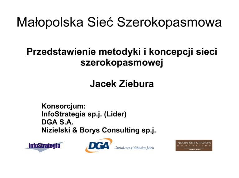 Małopolska Sieć Szerokopasmowa Przedstawienie metodyki i koncepcji sieci szerokopasmowej Jacek Ziebura Konsorcjum: InfoStrategia sp.j. (Lider) DGA S.A. Nizielski & Borys Consulting sp.j. Metodyka - Agenda Struktura ruchu w globalnej sieci IP Prawo Nielsena Analiza zapotrzebowania pasma Oczekiwana przepustowość pętli abonenckiej Stan obecny sieci szerokopasmowych na świecie Wnioski z inwentaryzacji 23.06.2008 Metodyka i Koncepcja Sieci 2 Koncepcja Sieci - Agenda Możliwe topologie sieci Zastosowanie teorii grafów Koncepcja regionalnej sieci szkieletowej Koncepcja sieci powiatowej Wybór terenów do interwencji Przykłady sieci powiatowych 23.06.2008 Metodyka i Koncepcja Sieci 3 Analiza ruchu w globalnej sieci IP Firma Ipoque analizowała poziom wykorzystania niektórych serwisów internetowych w pięciu regionach świata, w okresie od sierpnia do września 2007 roku. Okazało się, że największym zainteresowaniem cieszą się: usługa transferu plików typu P2P (Peer to Peer), usługi VoIP, Skype, strumieniowanie przekazu video, usługi czatowe (Instant Messaging), szyfrowany przekaz za pośrednictwem protokołu P2P. Analiza ruchu - rozkład 23.06.2008 Metodyka i Koncepcja Sieci 5 Analiza ruchu - wnioski 74% ruchu to P2P P2P - ruch pomiędzy użytkownikami końcowymi sieci zatem wymagane są łącza SYMETRYCZNE, także do użytkownika końcowego 23.06.2008 Metodyka i Koncepcja Sieci 6 Prawo Nielsena Przepustowość kanałów dostępowych do Internetu rządzi się prawem, które w roku 1998 zostało sformułowane przez Jakoba Nielsena. Prawo to zostało powtórnie zweryfikowane przez Nielsena w lutym 2008 roku i w ostatecznej wersji mówi że: (Nielsen Jakob, Nielsen’s Law of Internet Bandwidth. Alertbox for April 5, 1998, retrieved on 2008) przepustowość łączy dostępowych w sieci Internet przyrasta każdego roku średnio o około 50 %; nie udaje się wykorzystać w pełni zwiększonej przepustowości łącza dostępowego dla efektywnego korzystania ze stron WWW. Przepustowość łącza dostępowego wg Prawa Nielsena 23.06.2008 Metodyka i Koncepcja Sieci 8 Prawo Nielsena - c.d. Dokładniej prawo Nielsena mówi, co następuje: przepustowość łączy dostępowych dla najbardziej świadomych użytkowników przyrasta średnio około 50% na rok rynek masowy jest opóźniony w stosunku do tych najbardziej świadomych użytkowników o około 2 do 3 lat Prawo Nielsena - c.d. Zgodnie z prawem Nielsena usługi łączy dostępowych o przepustowości 100 Mb/s, dla końcowych użytkowników Internetu będą osiągnięte, w poszczególnych krajach europejskich (pomijając Szwecję gdzie ten poziom został osiągnięty w 2004 roku), w latach: we Francji - w roku 2008, w Polsce i Hiszpanii - w roku 2012, w Wielkiej Brytanii - w roku 2015. Prawo Nielsena - wnioski Łącza dostępowe o przepustowości 100 Mb/s udostępnia obecnie jedynie technologia FITL (Fiber In The Loop). Zatem rozważanie budowy sieci szkieletowej w innej technologii niż światłowodowa nie zaspokoi potrzeb wielu użytkowników już za kilka lat. Łącza szerokopasmowe na świecie 23.06.2008 Metodyka i Koncepcja Sieci 12 Prawo Nielsena w Polsce - wnioski trend wzrostu - w pełni zgodny z prawem Nielsena istnieje bardzo dobrze rozwinięta sieć telewizji kablowej działa około 700.000 sieci lokalnych zbudowanych na bazie Ethernetu są to tzw. “sieci osiedlowe” lub “trzepakowe” sieci te jednak często nie są podłączone światłowodem sytuacja ta nie ma miejsca w dużych miastach bardzo duża różnica miasto-wieś prawo Nielsena dotyczy najbardziej zaawansowanych użytkowników Internetu 23.06.2008 Metodyka i Koncepcja Sieci 13 Inwentaryzacja 335 tysięcy gospodarstw domowych w Małopolsce nie ma i nie będzie mieć możliwości uzyskania szerokopasmowego dostępu do sieci. Wykluczenie cyfrowe grozi co trzeciemu gospodarstwu domowemu. Ok. 600 miejscowości z możliwością dostępu szerokopasmowego (w zasięgu węzłów nie znajduje się 100% mieszkańców) 23.06.2008 Metodyka i Koncepcja Sieci 14 Inwentaryzacja - węzły 6 Mb/s 23.06.2008 Metodyka i Koncepcja Sieci 15 Koncepcja Sieci - Agenda Możliwe topologie sieci Zastosowanie teorii grafów Koncepcja regionalnej sieci szkieletowej Koncepcja sieci powiatowej Wybór terenów do interwencji Przykłady sieci powiatowych 23.06.2008 Metodyka i Koncepcja Sieci 16 Topologia sieci Budując dostępową infrastrukturę kablową wykorzystywać można cztery możliwe, następujące struktury topologiczne sieci (grafy): strukturę gwiazdy, strukturę drzewa o minimalnej długości MST (Minimal Spanning Tree), strukturę drzewa Steinera, strukturę pierścieniową, w niektórych rozwiązaniach, np. w Danii sugeruje się budowę warstwy dostępowej z wykorzystaniem dwóch pierścieni. Topologia gwiazdy Sieć składa się z punktu centralnego, do którego podłączone są pozostałe punkty Zalety: − prostota − niska cena Wady. − brak redundancji (bardzo niska niezawodność sieci) − ograniczone możliwości zarządzania ruchem 23.06.2008 Metodyka i Koncepcja Sieci 18 Topologia kraty W topologii pełnej kraty każdy punkt sieci ma dostęp do pozostałych. Zalety − bardzo wysoka niezawodność sieci − duża liczba alternatywnych ścieżek Wady − wysoki koszt realizacji 23.06.2008 Metodyka i Koncepcja Sieci 19 Topologia pierścienia Zalety − tańsza od topologii kraty Wady − ma nieco niższą niezawodność 23.06.2008 Metodyka i Koncepcja Sieci 20 Kluczowe parametry Przepływność − minimalna gwarantowana przepływność zapewniającą realizacje obecnych i przyszłych usług Zasięg działania − maksymalny wymagany zasięg działania sieci − wpływ zakłóceń na działanie określonego medium transmisyjnego Funkcjonalność − wybór platformy czy rozwiązania softwarowego. Skalowalność − możliwość łatwej rozbudowy umożliwiającej dodanie nowego urządzenia czy wprowadzenie nowej usługi − sieć dostępowa musi podołać rozbudowie sie