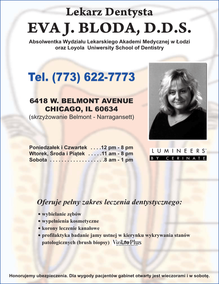 Lekarz Dentysta EVA J. BLODA, D.D.S. Absolwentka Wydziału Lekarskiego Akademi Medycznej w Łodzi oraz Loyola Uniwersity School of Dentistry Tel. (773) 622-7773 6418 W. BELMONT AVENUE CHICAGO, IL 60634 (skrzyżowanie Belmont - Narragansett) Poniedzałek i Czwartek . . . .12 pm - 8 pm Wtorek, Środa i Piątek . . . . .11 am - 8 pm Sobota . . . . . . . . . . . . . . . . . . .8 am - 1 pm Oferuje pełny zakres leczenia dentystycznego: ● wybielanie zębów ● wypełnienia kosmetyczne ● korony leczenie kanałowe ● profilaktyka badanie jamy ustnej w kierynku wykrywania stanów patologicznych (brush biopsy) Honorujemy ubezpieczenia. Dla wygody pacjentów gabinet otwarty jest wieczorami i w sobotę.