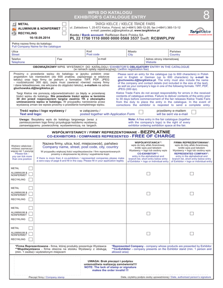 8 WPIS DO KATALOGU EXHIBITOR’S CATALOGUE ENTRY TARGI KIELCE / KIELCE TRADE FAIRS METAL ALUMINIUM & NONFERMET RECYKLING ul. Zak³adowa 1, 25-672 Kielce, Poland, tel.(+4841) 365-12-20, fax (+4841) 365-13-12 e-mail: [email protected], www.targikielce.pl Konto / Bank account: Raiffeisen Bank Polska SA 16-18.09.2014 PL 22 1750 1110 0000 0000 0568 3537 Swift: RCBWPLPW Pe³na nazwa firmy do katalogu Full Company Name for the catalogue Kod Post code Ulica Street e-mail Fax Telefon Telephone Miasto City Pañstwo Country Adres strony internetowej Website OBOWI¥ZKOWY WPIS WYSTAWCY DO KATALOGU / EXHIBITOR’S OBLIGATORY ENTRY IN THE CATALOGUE (w ramach op³aty rejestracyjnej) / (within registration fee) Prosimy o przes³anie wpisu do katalogu w jêzyku polskim oraz angielskim lub niemieckim (do 600 znaków, zapisanego w edytorze tekstu) oraz logo firmy (w jednym z formatów: TIFF, PDF, JPEG - rozdzielczoœæ 300 dpi), (wpis musi zawieraæ równie¿ nazwê firmy i dane teleadresowe, nie wliczane do objêtoœci tekstu), e-mailem na adres [email protected]. Targi Kielce nie ponosz¹ odpowiedzialnoœci za b³êdy w przes³anej treœci wpisu do katalogu. Nie przes³anie treœci wpisu w terminie 30 dni przed rozpoczêciem targów zwalnia TK z obowi¹zku umieszczenia wpisu w katalogu. W przypadku naniesienia przez wystawcê zmian we wpisie prosimy o przes³anie kompletnego wpisu. Treœæ wpisu i logo wystawcy / Text and logo: Please send an entry for the catalogue (up to 600 characters) in Polish and in English or German (up to 600 characters) by e-mail to [email protected]. The entry must also include the name of the company and contact details (not included in the size of the text), as well as your company’s logo in one of the following formats: TIFF, PDF, JPEG (300 dpi). Kielce Trade Fairs do not accept responsibility for errors in the received contents of catalogue entries. Failure to deliver contents of the entry prior to 30 days before commencement of the fair releases Kielce Trade Fairs from the duty to place the entry in the catalogue. In the event of corrections the exhibitor is reqested to send a complete entry. w za³¹czeniu / posted together with Application Form przeœlemy e-mailem will be sent via e-mail Note: A free entry in the fair catalogue (together with the company’s logo) is the right of every exhibitor ordering exhibition space at the fair. Uwaga: Bezp³atny wpis do katalogu targowego (wraz z zamieszczeniem logo firmy) przys³uguje ka¿demu wystawcy, zamawiaj¹cemu powierzchniê wystawiennicz¹ na targach. WSPÓ£WYSTAWCY / FIRMY REPREZENTOWANE - BEZP£ATNIE CO-EXHIBITORS / COMPANIES REPRESENTED - FREE OF CHARGE Wybierz w³aœciwe mo¿esz zaznaczyæ wiêcej ni¿ 1 pozycjê Please tick yoy can tick more than one position Nazwa firmy, ulica, kod, miejscowoœæ, pañstwo Company name, street, post code, city, country W przypadku wiêkszej iloœci wspó³wystawców / firm reprezentowanych prosimy o skopiowanie tej strony i wype³nienie kopii. If there is more than 4 co-exhibitors / represented companies please make a xero-copy of page 8 and fill in the copy. Please fill in your application legibly. WSPÓ£WYSTAWCA**: FIRMA REPREZENTOWANA*: wpis do listy alfab./bran¿owej, wpis do listy alfab./bran¿owej, krótki wpis pod tekstem krótki wpis pod tekstem Wystawcy + logo lub osobny wpis Wystawcy + logo lub osobny wpis CO-EXHIBITOR**: REPRESENTED COMPANY*: entry in the alphabetical and entry in the alphabetical and branch list, short entry below entry branch list, short entry below entry of Exhibitor + logo or individual entry of Exhibitor + logo or individual entry METAL ALUMINIUM & NONFERMET RECYKLING METAL ALUMINIUM & NONFERMET RECYKLING METAL ALUMINIUM & NONFERMET RECYKLING METAL ALUMINIUM & NONFERMET RECYKLING *Firma Reprezentowana - firma, której produkty prezentuje Wystawca **Wspó³wystawca - firma obecna na stoisku Wystawcy z obs³ug¹ (min. 1 osoba) i wydzielonym miejscem *Represented Company - company whose products are presented by Exhibitor **Co-Exhibitor - company presents on the Exhibitor stand (min. 1 person and allowed area) UWAGA: Brak pieczêci i podpisu uniemo¿liwia realizacjê zamówienia!!!/ NOTE: The lack of stamp or signature makes the order invalid !!! Pieczêæ firmy / Company stamp Data, czytelny podpis osoby upowa¿nionej / Date, authorised person’s signature