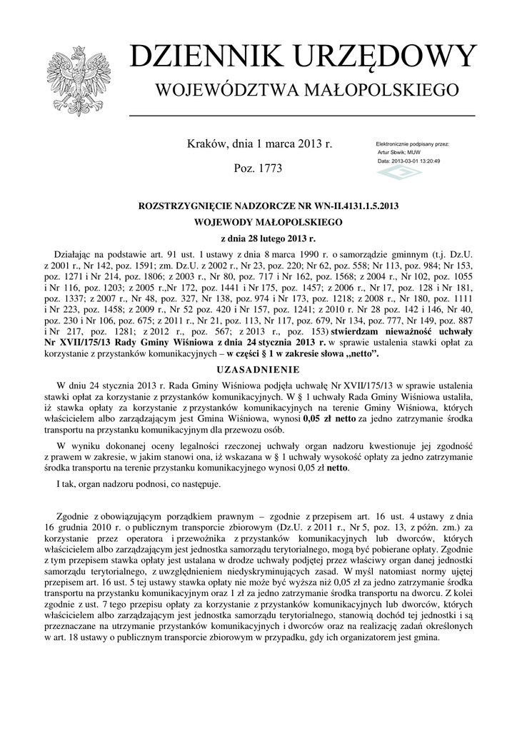 DZIENNIK URZĘDOWY WOJEWÓDZTWA MAŁOPOLSKIEGO Kraków, dnia 1 marca 2013 r. Elektronicznie podpisany przez: Artur Słowik; MUW Poz. 1773 Data: 2013-03-01 13:20:49 ROZSTRZYGNIĘCIE NADZORCZE NR WN-II.4131.1.5.2013 WOJEWODY MAŁOPOLSKIEGO z dnia 28 lutego 2013 r. Działając na podstawie art. 91 ust. 1 ustawy z dnia 8 marca 1990 r. o samorządzie gminnym (t.j. Dz.U. z 2001 r., Nr 142, poz. 1591; zm. Dz.U. z 2002 r., Nr 23, poz. 220; Nr 62, poz. 558; Nr 113, poz. 984; Nr 153, poz. 1271 i Nr 214, poz. 1806; z 2003 r., Nr 80, poz. 717 i Nr 162, poz. 1568; z 2004 r., Nr 102, poz. 1055 i Nr 116, poz. 1203; z 2005 r.,Nr 172, poz. 1441 i Nr 175, poz. 1457; z 2006 r., Nr 17, poz. 128 i Nr 181, poz. 1337; z 2007 r., Nr 48, poz. 327, Nr 138, poz. 974 i Nr 173, poz. 1218; z 2008 r., Nr 180, poz. 1111 i Nr 223, poz. 1458; z 2009 r., Nr 52 poz. 420 i Nr 157, poz. 1241; z 2010 r. Nr 28 poz. 142 i 146, Nr 40, poz. 230 i Nr 106, poz. 675; z 2011 r., Nr 21, poz. 113, Nr 117, poz. 679, Nr 134, poz. 777, Nr 149, poz. 887 i Nr 217, poz. 1281; z 2012 r., poz. 567; z 2013 r., poz. 153) stwierdzam nieważność uchwały Nr XVII/175/13 Rady Gminy Wiśniowa z dnia 24 stycznia 2013 r. w sprawie ustalenia stawki opłat za korzystanie z przystanków komunikacyjnych – w części § 1 w zakresie słowa „netto”. UZASADNI ENIE W dniu 24 stycznia 2013 r. Rada Gminy Wiśniowa podjęła uchwałę Nr XVII/175/13 w sprawie ustalenia stawki opłat za korzystanie z przystanków komunikacyjnych. W § 1 uchwały Rada Gminy Wiśniowa ustaliła, iż stawka opłaty za korzystanie z przystanków komunikacyjnych na terenie Gminy Wiśniowa, których właścicielem albo zarządzającym jest Gmina Wiśniowa, wynosi 0,05 zł netto za jedno zatrzymanie środka transportu na przystanku komunikacyjnym dla przewozu osób. W wyniku dokonanej oceny legalności rzeczonej uchwały organ nadzoru kwestionuje jej zgodność z prawem w zakresie, w jakim stanowi ona, iż wskazana w § 1 uchwały wysokość opłaty za jedno zatrzymanie środka transportu na terenie przystanku komunikacyjnego wynosi 0,05 zł netto. I tak, organ nadzoru podnosi, co następuje. Zgodnie z obowiązującym porządkiem prawnym – zgodnie z przepisem art. 16 ust. 4 ustawy z dnia 16 grudnia 2010 r. o publicznym transporcie zbiorowym (Dz.U. z 2011 r., Nr 5, poz. 13, z późn. zm.) za korzystanie przez operatora i przewoźnika z przystanków komunikacyjnych lub dworców, których właścicielem albo zarządzającym jest jednostka samorządu terytorialnego, mogą być pobierane opłaty. Zgodnie z tym przepisem stawka opłaty jest ustalana w drodze uchwały podjętej przez właściwy organ danej jednostki samorządu terytorialnego, z uwzględnieniem niedyskryminujących zasad. W myśl natomiast normy ujętej przepisem art. 16 ust. 5 tej ustawy stawka opłaty nie może być wyższa niż 0,05 zł za jedno zatrzymanie środka transportu na przystanku komunikacyjnym oraz 1 zł za jedno zatrzymanie środka transportu na dworcu. Z kolei zgodnie z ust. 7 tego przepisu opłaty za korzystanie z przystanków komunikacyjnych lub dworców, których właścicielem albo zarządzającym jest jednostka samorządu terytorialnego, stanowią dochód tej jednostki i są przeznaczane na utrzymanie przystanków komunikacyjnych i dworców oraz na realizację zadań określonych w art. 18 ustawy o publicznym transporcie zbiorowym w przypadku, gdy ich organizatorem jest gmina. Dziennik Urzędowy Województwa Małopolskiego –2– Poz. 1773 Jak wynika z wyżej przywołanych unormowań, stawka opłaty za jedno zatrzymanie środka transportu na przystanku komunikacyjnym nie może wynieść więcej niż 0,05 zł. Ustawa o publicznym transporcie zbiorowym w przepisie art. 16 ust. 5 nie precyzuje, czy wymienione w niej stawki opłat odpowiednio 0,05 zł oraz 1 zł są stawkami brutto czy netto, niemniej jednak wskazane w niej stawki opłat są stawkami najwyższymi maksymalnymi, jakie mogą być pobierane za jedno zatrzymanie środka transportu. Powyższe oznacza, iż niezależnie od tego, czy pobierana opłata zawiera w sobie podatek od towarów i usług, to i tak może być ona pobrana w wysokości nie wyższej niż wskazana w przepisie art. 16 ust. 5 ustawy o publicznym transporcie zbiorowym. W ocenie organu nadzoru użycie przez Radę Gminy Wiśniowa sformułowania, iż stawka opłaty za jedno zatrzymanie wynosi 0,05 zł netto sugeruje, iż do stawki tej należy doliczyć odpowiednią wartość podatku, co z kolei spowoduje, iż stawka opłaty za jedno zatrzymanie będzie wyższa niż wynikająca z przepisu art. 16 ust. 5 wyżej przywołanej ustawy. Taki sposób uregulowania wysokości stawki opłaty jak w kwestionowanej uchwale rażąco narusza w ocenie organu nadzoru przepis art. 16 ust. 5 ustawy o publicznym transporcie zbiorowym, a zatem sformułowanie sugerujące w rzeczywistości wyższą stawkę aniżeli wskazana w przepisach prawa, winno zostać wyeliminowane z obowiązującego porządku prawnego. Także w sytuacji, kiedy stawka opłaty wskazana w wyżej przywołanym przepisie ustawy o publicznym transporcie zbiorowym nie podlegałaby opodatkowaniu podatkiem od towarów i usług, to także wówczas sformułowanie użyte w kwestionowanej uchwale, iż stawka opłaty wynosi 0,05 zł netto skutkowałoby tym, iż użycie słowa „netto” byłoby w takiej sytuacji bezprzedmiotowe. Organ nadzoru wskazuje w tym miejscu, iż w orzecznictwie sądowoadministracyjnym rozważane było zagadnienie, czy wskazana w art. 16 ust. 5 ustawy o publicznym transporcie zbiorowym stawka opłaty jest opłatą wchodzącą w zakres władztwa publicznego wykonywanego przez organ władzy publicznej, a zatem mającą charakter publicznoprawny, co wyklucza opodatkowanie podatkiem od towarów i usług, czy też jest opłatą o charakterze cywilnoprawnym i podlega opodatkowaniu tym podatkiem. I tak, w myśl poglądu wyrażonego w uzasadnieniu do wyroku Wojewódzkiego Sądu Administracyjnego w Krakowie z dnia 25 stycznia 20