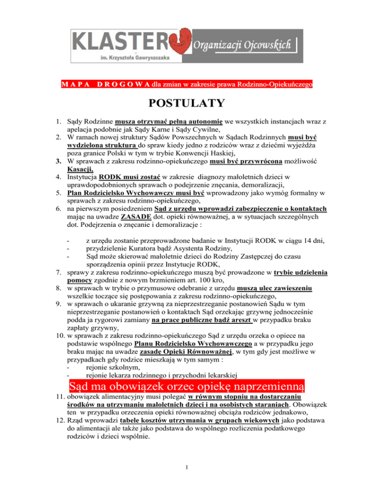 M A P A D R O G O W A dla zmian w zakresie prawa Rodzinno-Opiekuńczego POSTULATY 1. Sądy Rodzinne musza otrzymać pełną autonomię we wszystkich instancjach wraz z apelacja podobnie jak Sądy Karne i Sądy Cywilne, 2. W ramach nowej struktury Sądów Powszechnych w Sądach Rodzinnych musi być wydzielona struktura do spraw kiedy jedno z rodziców wraz z dziećmi wyjeżdża poza granice Polski w tym w trybie Konwencji Haskiej, 3. W sprawach z zakresu rodzinno-opiekuńczego musi być przywrócona możliwość Kasacji, 4. Instytucja RODK musi zostać w zakresie diagnozy małoletnich dzieci w uprawdopodobnionych sprawach o podejrzenie znęcania, demoralizacji, 5. Plan Rodzicielsko Wychowawczy musi być wprowadzony jako wymóg formalny w sprawach z zakresu rodzinno-opiekuńczego, 6. na pierwszym posiedzeniem Sąd z urzędu wprowadzi zabezpieczenie o kontaktach mając na uwadze ZASADE dot. opieki równoważnej, a w sytuacjach szczególnych dot. Podejrzenia o znęcanie i demoralizacje : z urzędu zostanie przeprowadzone badanie w Instytucji RODK w ciągu 14 dni, przydzielenie Kuratora bądź Asystenta Rodziny, Sąd może skierować małoletnie dzieci do Rodziny Zastępczej do czasu sporządzenia opinii przez Instytucje RODK, 7. sprawy z zakresu rodzinno-opiekuńczego muszą być prowadzone w trybie udzielenia pomocy zgodnie z nowym brzmieniem art. 100 kro, 8. w sprawach w trybie o przymusowe odebranie z urzędu muszą ulec zawieszeniu wszelkie toczące się postępowania z zakresu rodzinno-opiekuńczego, 9. w sprawach o ukaranie grzywną za nieprzestrzeganie postanowień Sądu w tym nieprzestrzeganie postanowień o kontaktach Sąd orzekając grzywnę jednocześnie podda ja rygorowi zamiany na prace publiczne bądź areszt w przypadku braku zapłaty grzywny, 10. w sprawach z zakresu rodzinno-opiekuńczego Sąd z urzędu orzeka o opiece na podstawie wspólnego Planu Rodzicielsko Wychowawczego a w przypadku jego braku mając na uwadze zasadę Opieki Równoważnej, w tym gdy jest możliwe w przypadkach gdy rodzice mieszkają w tym samym : rejonie szkolnym, rejonie lekarza rodzinnego i przychodni lekarskiej - Sąd ma obowiązek orzec opiekę naprzemienną 11. obowiązek alimentacyjny musi polegać w równym stopniu na dostarczaniu środków na utrzymaniu małoletnich dzieci i na osobistych staraniach. Obowiązek ten w przypadku orzeczenia opieki równoważnej obciąża rodziców jednakowo, 12. Rząd wprowadzi tabele kosztów utrzymania w grupach wiekowych jako podstawa do alimentacji ale także jako podstawa do wspólnego rozliczenia podatkowego rodziców i dzieci wspólnie. 1 UZASADNIENIE Kodeks Rodzinny i Opiekuńczy funkcjonuje od 1964 roku wprowadzony Ustawą z dnia 25 lutego 1964 roku (Dz. U. Nr 9, poz. 59 z późn. zmianami). Do dnia dzisiejszego najpoważniejsze zmiany nastąpiły 13.06.2008 roku. Wielokroć szczególnie środowiska ojcowskie domagały się głębokich zmian w prawie rodzinnym. Również przypadki patologii życia rodzinnego wielokroć wskazywały na potrzebę zmian. Polska po wejściu do Unii również musiała się poddać wprowadzeniu wielu nowych regulacji ale także dostosowania już istniejącego prawa z zakresu Rodzinno-Opiekuńczego do przepisów Unii Europejskiej. Niestety wiele z tych nowych regulacji nie tylko nie rozwiązały wielu starych problemów ale stworzyły nowe a w niektórych stare problemy zostały wzmocnione. Główne obszary prawa z zakresu rodzinno-opiekuńczego, które należy znowelizować to : 1. Jasne sformułowania prawne mające na celu pomoc rodzinie, dziecku jak i poszczególnym rodzicom z osobna poprzez działania pierwszoplanowe w sytuacjach konfliktu rodziców jak i patologii w rodzinie i dysfunkcji rodziny. 2. traktowanie rodziców w sposób równoprawny wobec prawa mając na uwadze szczególnie dobro dziecka ale także obowiązek rodzicielski rodziców wobec własnych dzieci przy zastosowaniu z urzędu opieki równoważnej, 3. szybkość podejmowania decyzji przez wymiar sprawiedliwość przy zachowaniu pełnej ostrożności dla bezpieczeństwa i dobra dziecka , 4. wykonalność ale także skuteczność wyroków/postanowień zachowując z jednej strony dobro dziecka ale z drugiej strony zachowując nieuchronność i dotkliwość konsekwencji z nie respektowania wyroków/postanowień. Jasne sformułowania prawne mające na celu pomoc rodzinie, dziecku jak i poszczególnym rodzicom z osobna poprzez działania pierwszoplanowe w sytuacjach konfliktu rodziców jak i patologii w rodzinie. W sprawach przed sądem w sytuacji konfliktu rodziców w obecnym stanie prawnym stroną uprzywilejowaną jest kobieta. W sprawach o powierzenie władzy rodzicielskiej Sądy rozstrzygają w oparciu o art. 58 kro, art.107 kro ,art.109 kro lub art. 111 kro Władza rodzicielska jako władza nie jest fortunnym sformułowaniem, gdyż jako władza stwarza nie tylko wrażenie ale wręcz prowadzi do relacji zwierzchności człowieka nad człowiekiem typu pan-niewolnik. Tym bardziej niedopuszczalne jest użycie tego zwrotu w relacjach ludzkich czyli sprowadzania do władzy człowieka nad człowiekiem a w tym przypadku do władzy dorosłego nad dzieckiem małoletnim. Czy dodanie do władzy wyrazu rodzicielska zmienia charakter władzy ? Wydaje się, że lepszym terminem byłby jednak termin opieka rodzicielska. Odrzucając dywagacje zasadności używania terminu władza rodzicielska w kontekście relacji rodzice-dzieci małoletnie można przyjąć , iż intencją ustawodawcy nie jest wprost znaczenie tego terminu jako podległość rodzic-dziecko typu pan-niewolnik a wyrażenie odpowiedzialności za los dziecka przez rodziców zgodnie z art. 96 kro. 2 W konfliktach rodziców gdzie Sąd musi rozstrzygnąć o władzy rodzicielskiej stosuje odpowiednio przepisy art. 58 kro, art.107 kro , art.109 kro lub art. 111 kro. Rolą tych zapisów jest właśnie rozstrzygnięcie o wykonywaniu władzy rodzicielskiej, ograniczeniu władzy rodzicielskiej bądź pozbawieniu władzy r