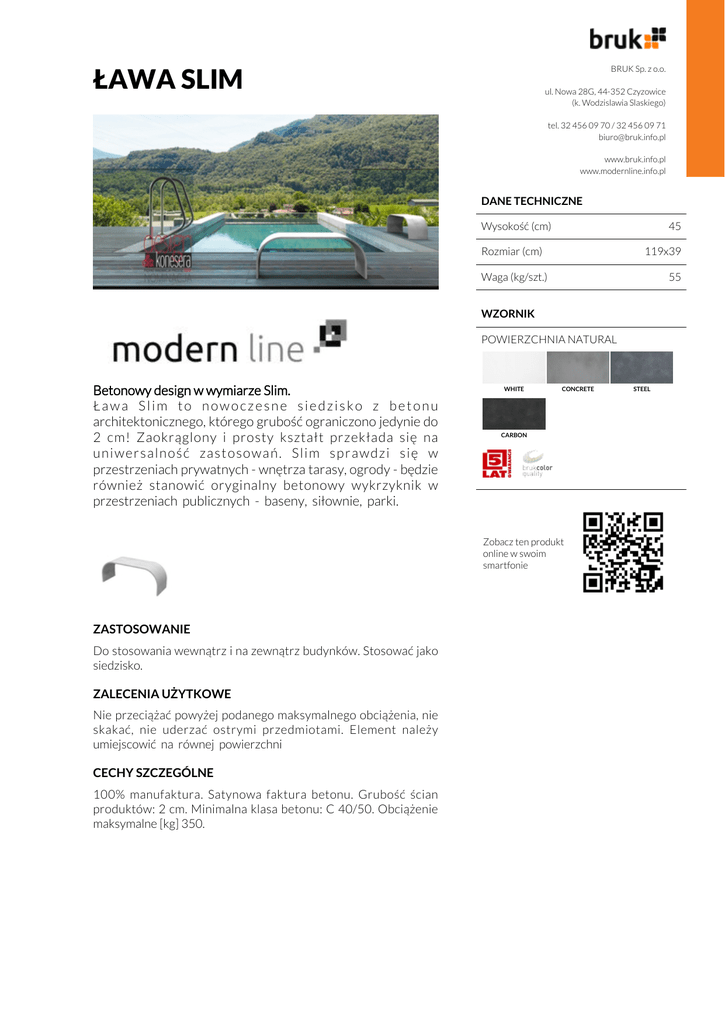 ŁAWA SLIM BRUK Sp. z o.o. ul. Nowa 28G, 44-352 Czyzowice (k. Wodzislawia Slaskiego) tel. 32 456 09 70 / 32 456 09 71 [email protected] www.bruk.info.pl www.modernline.info.pl DANE TECHNICZNE Wysokość (cm) 45 Rozmiar (cm) 119x39 55 Waga (kg/szt.) WZORNIK POWIERZCHNIA NATURAL Betonowy design w wymiarze Slim. Ława Slim to nowoczesne siedzisko z betonu architektonicznego, którego grubość ograniczono jedynie do 2 cm! Zaokrąglony i prosty kształt przekłada się na uniwersalność zastosowań. Slim sprawdzi się w przestrzeniach prywatnych - wnętrza tarasy, ogrody - będzie również stanowić oryginalny betonowy wykrzyknik w przestrzeniach publicznych - baseny, siłownie, parki. WHITE CONCRETE CARBON Zobacz ten produkt online w swoim smartfonie ZASTOSOWANIE Do stosowania wewnątrz i na zewnątrz budynków. Stosować jako siedzisko. ZALECENIA UŻYTKOWE Nie przeciążać powyżej podanego maksymalnego obciążenia, nie skakać, nie uderzać ostrymi przedmiotami. Element należy umiejscowić na równej powierzchni CECHY SZCZEGÓLNE 100% manufaktura. Satynowa faktura betonu. Grubość ścian produktów: 2 cm. Minimalna klasa betonu: C 40/50. Obciążenie maksymalne [kg] 350. STEEL