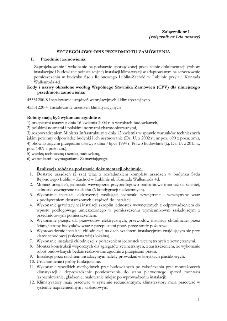 Załącznik nr 1 (załącznik nr 1 do umowy) SZCZEGÓŁOWY OPIS PRZEDMIOTU ZAMÓWIENIA I. Przedmiot zamówienia: Zaprojektowanie i wykonanie na podstawie sporządzonej przez siebie dokumentacji (roboty instalacyjne i budowlane poinstalacyjne) instalacji klimatyzacji w adaptowanym na serwerownię pomieszczeniu w budynku Sądu Rejonowego Lublin-Zachód w Lublinie przy ul. Konrada Wallenroda 4d. Kody i nazwy określone według Wspólnego Słownika Zamówień (CPV) dla niniejszego przedmiotu zamówienia: 45331200-8 Instalowanie urządzeń wentylacyjnych i klimatyzacyjnych 45331220-4 Instalowanie urządzeń klimatyzacyjnych Roboty mają być wykonane zgodnie z: 1) przepisami ustawy z dnia 16 kwietnia 2004 r. o wyrobach budowlanych, 2) polskimi normami i polskimi normami zharmonizowanymi, 3) rozporządzeniem Ministra Infrastruktury z dnia 12 kwietnia w sprawie warunków technicznych jakim powinny odpowiadać budynki i ich usytuowanie (Dz. U. z 2002 r., nr poz. 690 z późn. zm.), 4) obowiązującymi przepisami ustawy z dnia 7 lipca 1994 r. Prawo budowlane (t.j. Dz. U. z 2013 r., poz. 1409 z poźn.zm.), 5) wiedzą techniczną i sztuką budowlaną, 6) warunkami i wymaganiami Zamawiającego. 1. 2. 3. 4. 5. 6. 7. 8. 9. 10. 11. 12. Realizacja robót na podstawie dokumentacji obejmuje: Dostawę urządzeń (2 szt.) wraz z rozładunkiem kompletu urządzeń w budynku Sądu Rejonowego Lublin – Zachód w Lublinie ul. Konrada Wallenroda 4d. Montaż urządzeń, jednostki wewnętrzne przypodłogowo-podsufitowe (montaż na ścianie), jednostki zewnętrzne na dachu (6 kondygnacji nadziemnych). Wykonanie instalacji elektrycznej zasilającej jednostki zewnętrzne i wewnętrzne wraz z podłączeniem dostarczonych urządzeń do instalacji. Wykonanie grawitacyjnej instalacji skroplin jednostek wewnętrznych z odprowadzeniem do wpustu podłogowego umieszczonego w pomieszczeniu wymiennikowni sąsiadującym z przedmiotowym pomieszczeniem. Wykonanie przejść dla przewodów elektrycznych, przewodów instalacji chłodniczej przez ściany/stropy budynków wraz z przepustami ppoż. przez strefy pożarowe. Wyprowadzenie instalacji chłodniczej na dach szachtem instalacyjnym znajdującym się przy klatce schodowej (zalecana wizja lokalna). Wykonanie instalacji chłodniczej z połączeniem jednostek wewnętrznych z zewnętrznymi. Montaż konstrukcji wsporczych dla agregatów zewnętrznych, z zastrzeżeniem, że wykonanie robót budowlanych będzie realizowane zgodnie z przepisami prawa. Instalacje poza szachtem instalacyjnym należy prowadzić w korytkach plastikowych. Uruchomienie i próby funkcjonalne. Wykonanie wszelkich niezbędnych prac budowlanych po zakończeniu prac montażowych klimatyzacji i doprowadzenie pomieszczenia do stanu pierwotnego sprzed montażu (szpachlowanie, gładzenie, malowanie miejsc po wprowadzeniu instalacji). Klimatyzatory mają pracować w systemie redundantnym, klimatyzatory mają pracować w systemie naprzemiennym i kaskadowym. 1 13. Regulacja urządzeń klimatyzatorów przed przekazaniem Zamawiającemu oraz przekazanie Zamawiającemu sprawnej instalacji. 14. Przeszkolenie użytkowników urządzeń. 15. Przekazanie dokumentacji powykonawczej (dostarczenie dokumentacji urządzeń klimatyzacji w tym instrukcji obsługi urządzeń, warunków gwarancji, deklaracji zgodności, poświadczeń, atestów itp.) Uwaga: Do ofert należy dołączyć kartę katalogową proponowanego urządzenia spełniającego poniżej wymienione parametry. Wymagania dla urządzenia (2 szt) 1. Urządzenia mają być od jednego producenta. 2. Urządzenie fabrycznie nowe, wyprodukowane nie wcześniej niż 12 miesięcy przed datą oferty. 3. Minimalne wymagania techniczne urządzenia: • Jednostki wewnętrzne przypodłogowo-podsufitowe, • klasa energetyczna urządzenia minimum „A”, • płynna regulacja wydajności chłodniczej poprzez zastosowanie sprężarki inwerterowej, • wydajność - moc chłodnicza nie mniej niż 13 kW, • poziom ciśnienia akustycznego nie większy niż 58 db na najwyższym biegu i nie większy niż 52 dB na najniższym biegu wg. Karty katalogowej urządzenia, • pobór mocy (dla chłodzenia) nie więcej niż 5,05 kW, • długość instalacji nie mniej niż 50 m, • długość przewyższenia nie mniej niż 30 m • zakres temperatur pracy od -15oC, • funkcja kaskady, rotacji, redundancji • ekologiczny czynnik chłodniczy, • certyfikat PHZ, • gwarancja producenta na urządzenia 3 lat II. III. Pozostałe obowiązki wykonawcy 1. Gwarancja na wykonaną instalację – 3 lata od daty podpisania protokołu odbioru końcowego 2. Serwisowanie instalacji i urządzeń w ramach gwarancji przez okres 3 lat od daty podpisania protokołu odbioru końcowego, niezależnie od gwarancji. Serwis będzie obejmował wszystkie czynności wymagane gwarancją, wymianę filtrów oraz inne niezbędne czynności serwisowe zapewniające sprawne funkcjonowanie. Serwis będzie wykonywany min. 2 razy w roku, z czego raz przed sezonem letnim tj. przed 1 maja. 3. Zagospodarowania we własnym zakresie powstałych odpadów. 4. Przestrzeganie przepisów bhp i przeciwpożarowych. 5. Zapewnienie sprzętu spełniającego wymagania norm technicznych. 6. Utrzymanie porządku w czasie realizacji robót. Maksymalny termin realizacji zamówienia Maksymalny termin realizacji zamówienia – do dnia 19.12.2014 r. IV. Charakterystyka pomieszczenia Ilość pomieszczeń, w których będzie wykonana instalacja klimatyzacji – 1 2 Pomieszczenie o wymiarach 3,43x3,21 m i wysokości 3,10 m. Przedmiotowe pomieszczenie jedną ścianą graniczy z pomieszczeniem węzła cieplnego, w pomieszczeniu jest wentylacja mechaniczna. Rzut pomieszczenia serwerowni w załączniku. UWAGA: Zaleca się dokonanie wizji lokalnej, po uzgodnieniu telefonicznym terminu, w celu sporządzenia rzetelnej oferty. V. Kryterium wyboru oferty: CENA: 100 % 3