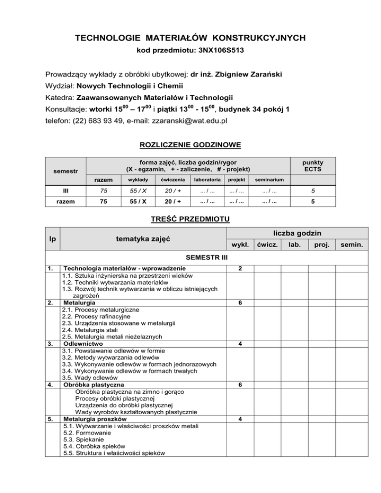 TECHNOLOGIE MATERIAŁÓW KONSTRUKCYJNYCH kod przedmiotu: 3NX106S513 Prowadzący wykłady z obróbki ubytkowej: dr inż. Zbigniew Zarański Wydział: Nowych Technologii i Chemii Katedra: Zaawansowanych Materiałów i Technologii Konsultacje: wtorki 1500 – 1700 i piątki 1300 - 1500, budynek 34 pokój 1 telefon: (22) 683 93 49, e-mail: [email protected] ROZLICZENIE GODZINOWE forma zajęć, liczba godzin/rygor (X - egzamin, + - zaliczenie, # - projekt) semestr punkty ECTS razem wykłady ćwiczenia laboratoria projekt seminarium III 75 55 / X 20 / + ... / ... ... / ... ... / ... 5 razem 75 55 / X 20 / + ... / ... ... / ... ... / ... 5 TREŚĆ PRZEDMIOTU lp liczba godzin tematyka zajęć wykł. SEMESTR III 1. 2. 3. 4. 5. Technologia materiałów - wprowadzenie 1.1. Sztuka inżynierska na przestrzeni wieków 1.2. Techniki wytwarzania materiałów 1.3. Rozwój technik wytwarzania w obliczu istniejących zagrożeń Metalurgia 2.1. Procesy metalurgiczne 2.2. Procesy rafinacyjne 2.3. Urządzenia stosowane w metalurgii 2.4. Metalurgia stali 2.5. Metalurgia metali nieżelaznych Odlewnictwo 3.1. Powstawanie odlewów w formie 3.2. Metody wytwarzania odlewów 3.3. Wykonywanie odlewów w formach jednorazowych 3.4. Wykonywanie odlewów w formach trwałych 3.5. Wady odlewów Obróbka plastyczna Obróbka plastyczna na zimno i gorąco Procesy obróbki plastycznej Urządzenia do obróbki plastycznej Wady wyrobów kształtowanych plastycznie Metalurgia proszków 5.1. Wytwarzanie i właściwości proszków metali 5.2. Formowanie 5.3. Spiekanie 5.4. Obróbka spieków 5.5. Struktura i właściwości spieków 2 6 4 6 4 ćwicz. lab. proj. semin. 2 6. Spajalnictwo 6.1. Budowa i właściwości złącza spawanego 6.2. Charakterystyka metod spawania 6.3. Projektowanie połączeń spawanych 6.4. Wady złączy spawanych 6.5. Metody kontroli jakości złączy spawanych 6.6. Zgrzewanie i lutowanie 7. Technologia inżynierii powierzchni 7.1. Budowa i właściwości warstw powierzchniowych 7.2. Techniki wytwarzania warstw wierzchnich 7.3. Techniki wytwarzania powłok 7.4. Badanie jakości warstw powierzchniowych 8. Wytwarzanie i obróbka materiałów ceramicznych i szkła 8.1. Wytwarzanie proszków ceramicznych 8.2 Techniki formowania wyrobów 8.3. Metody wypalania 8.4. Obróbka ubytkowa 8.5. Metody łączenia 9. Wytwarzanie i przetwórstwo tworzyw polimerowych 9.1. Otrzymywanie tworzyw sztucznych 9.2. Przetwórstwo tworzyw sztucznych 9.3. Metody łączenia 10. Wytwarzanie materiałów kompozytowych 10.1. Odlewane kompozyty metalowe 10.2. Spiekane kompozyty z osnową metalową 10.3. Piany metaliczne 10.4. Kompozyty na osnowie ceramicznej 10.5. Kompozyty na osnowie polimerowej 11. Obróbka ubytkowa 11.1. Podstawy skrawania metali 11.2. Narzędzia skrawające 11.3. Sposoby obróbki skrawaniem 11.4. Obróbka ścierna 11.5. Obróbka elektroerozyjna 12. Metody wytwarzania i projektowanie 12.1. Cechy metody wytwarzania 12.2. Procedura wyboru metody wytwarzania 12.3. Koszty metod wytwarzania 12.4. Dopasowanie materiałów 12.5. Proekologiczne projektowanie i wytwarzanie Praca kontrolna 4 4 3 3 4 10 3 2 ĆWICZENIA AUDYTORYJNE 1. 2. 3. 4. 5. 6. Dobór technik wytwarzania w projektowaniu inżynierskim Komputerowe modelowanie procesów obróbki plastycznej Dobór parametrów w spawaniu łukowym Zużycie i trwałość ostrza Dokumentacja technologiczna obróbki ubytkowej Dobór narzędzi i parametrów skrawania Razem w semestrze III 55 4 4 2 4 4 20 Łącznie w przedmiocie: 55 20 Razem: 2 75 3 LITERATURA M. Szweycer D. Nagolska Metalurgia i odlewnictwo, Wyd. Pol. Poznańskiej, Poznań, 2002 M. Cholewa i in. Podstawy procesów metalurgicznych, Wyd. Pol. Śląskiej, Gliwice 2004 S. Koerbel i in. Obróbka plastyczna na zimno, PWN, Warszawa 1975 M. Morawiec i in. Przeróbka plastyczna – podstawy teoretyczne, Wyd. Śląsk, Katowice, 1986 J. Nowicki Spiekane metale i kompozyty z osnową metaliczną, WNT, W-wa, 2005 J. Sobieszczański Spajanie, Wyd. Pol. Warszawskiej, 2004 K. Ferenc i in. Spawalnictwo, Wyd. Pol. Warszawskiej, 1999 I. Gruin Materiały polimerowe, PWN, W-wa, 2003 A. R. Olszyna Ceramika supertwarda, Wyd. Pol. Warszawskiej, 1999 T. Burakowski T. Wierzchoń Inżynieria powierzchni metali, WNT, W-wa 1995 A. Błędzkiego i in. Recykling materiałów polimerowych, WNT, W-wa 1997 M. Gabrylewski i in. MTM. Materiały do ćwiczeń laboratoryjnych. Wyd. WAT, 1994 M. Gabrylewski i in. MTM. Wybrane materiały do PSI. Wyd. WAT, 1994 Pr. zbiorowa Podstawy skrawania materiałów metalowych. WNT, 1998 M. Wysiecki Nowoczesne materiały narzędziowe stosowane w obróbce skrawaniem. WNT, 1997 - EdgeCAM - komputerowe wspomaganie obróbki skrawaniem. Wyd. Helion, 2002 R. Filipowski M. Marciniak M. Mięciel, G. Kaszkiel Techniki obróbki mechanicznej i erozyjnej. Wyd. Pol. Warsz., 2000 M.F. Ashby Dobór materiałów w projektowaniu inżynierskim. WNT, 1998 W. Przybylski Technologia obróbki nagniataniem. WNT, 1987 Komputerowe wspomaganie wytwarzania CAM. Wyd. MICOM, 1999 ZASADY ZALICZANIA Kolokwia - z zagadnień będących przedmiotem wykładów, Ćwiczenia – z zadania realizowanego w ramach każdego ćwiczenia, Egzamin - pisemny, można przystąpić pod warunkiem zaliczenia kolokwiów oraz ćwiczeń.