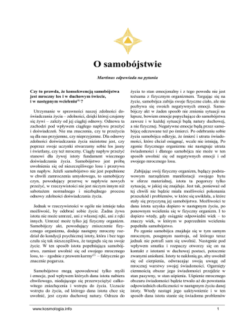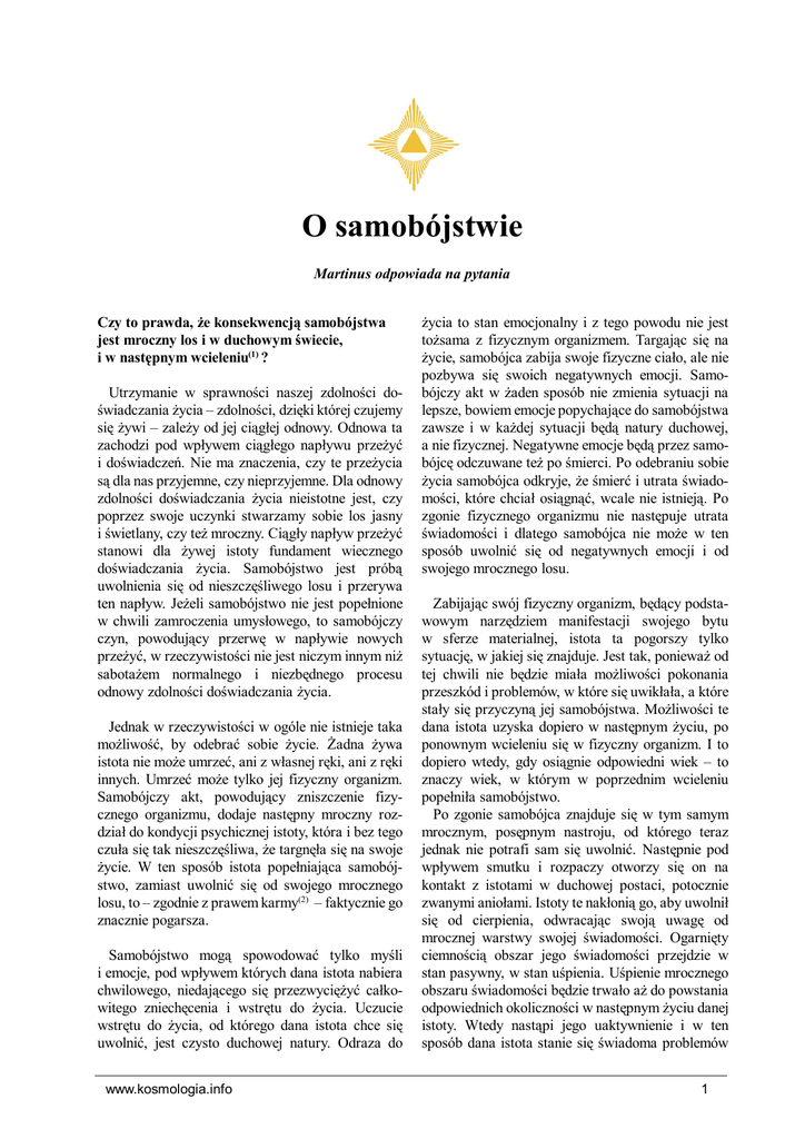 O samobójstwie O samobójstwie Martinus odpowiada na pytania Czy to prawda, że konsekwencją samobójstwa jest mroczny los i w duchowym świecie, i w następnym wcieleniu(1) ? Utrzymanie w sprawności naszej zdolności doświadczania życia – zdolności, dzięki której czujemy się żywi – zależy od jej ciągłej odnowy. Odnowa ta zachodzi pod wpływem ciągłego napływu przeżyć i doświadczeń. Nie ma znaczenia, czy te przeżycia są dla nas przyjemne, czy nieprzyjemne. Dla odnowy zdolności doświadczania życia nieistotne jest, czy poprzez swoje uczynki stwarzamy sobie los jasny i świetlany, czy też mroczny. Ciągły napływ przeżyć stanowi dla żywej istoty fundament wiecznego doświadczania życia. Samobójstwo jest próbą uwolnienia się od nieszczęśliwego losu i przerywa ten napływ. Jeżeli samobójstwo nie jest popełnione w chwili zamroczenia umysłowego, to samobójczy czyn, powodujący przerwę w napływie nowych przeżyć, w rzeczywistości nie jest niczym innym niż sabotażem normalnego i niezbędnego procesu odnowy zdolności doświadczania życia. Jednak w rzeczywistości w ogóle nie istnieje taka możliwość, by odebrać sobie życie. Żadna żywa istota nie może umrzeć, ani z własnej ręki, ani z ręki innych. Umrzeć może tylko jej fizyczny organizm. Samobójczy akt, powodujący zniszczenie fizycznego organizmu, dodaje następny mroczny rozdział do kondycji psychicznej istoty, która i bez tego czuła się tak nieszczęśliwa, że targnęła się na swoje życie. W ten sposób istota popełniająca samobójstwo, zamiast uwolnić się od swojego mrocznego losu, to – zgodnie z prawem karmy(2) – faktycznie go znacznie pogarsza. Samobójstwo mogą spowodować tylko myśli i emocje, pod wpływem których dana istota nabiera chwilowego, niedającego się przezwyciężyć całkowitego zniechęcenia i wstrętu do życia. Uczucie wstrętu do życia, od którego dana istota chce się uwolnić, jest czysto duchowej natury. Odraza do www.kosmologia.info życia to stan emocjonalny i z tego powodu nie jest tożsama z fizycznym organizmem. Targając się na życie, samobójca zabija swoje fizyczne ciało, ale nie pozbywa się swoich negatywnych emocji. Samobójczy akt w żaden sposób nie zmienia sytuacji na lepsze, bowiem emocje popychające do samobójstwa zawsze i w każdej sytuacji będą natury duchowej, a nie fizycznej. Negatywne emocje będą przez samobójcę odczuwane też po śmierci. Po odebraniu sobie życia samobójca odkryje, że śmierć i utrata świadomości, które chciał osiągnąć, wcale nie istnieją. Po zgonie fizycznego organizmu nie następuje utrata świadomości i dlatego samobójca nie może w ten sposób uwolnić się od negatywnych emocji i od swojego mrocznego losu. Zabijając swój fizyczny organizm, będący podstawowym narzędziem manifestacji swojego bytu w sferze materialnej, istota ta pogorszy tylko sytuację, w jakiej się znajduje. Jest tak, ponieważ od tej chwili nie będzie miała możliwości pokonania przeszkód i problemów, w które się uwikłała, a które stały się przyczyną jej samobójstwa. Możliwości te dana istota uzyska dopiero w następnym życiu, po ponownym wcieleniu się w fizyczny organizm. I to dopiero wtedy, gdy osiągnie odpowiedni wiek – to znaczy wiek, w którym w poprzednim wcieleniu popełniła samobójstwo. Po zgonie samobójca znajduje się w tym samym mrocznym, posępnym nastroju, od którego teraz jednak nie potrafi sam się uwolnić. Następnie pod wpływem smutku i rozpaczy otworzy się on na kontakt z istotami w duchowej postaci, potocznie zwanymi aniołami. Istoty te nakłonią go, aby uwolnił się od cierpienia, odwracając swoją uwagę od mrocznej warstwy swojej świadomości. Ogarnięty ciemnością obszar jego świadomości przejdzie w stan pasywny, w stan uśpienia. Uśpienie mrocznego obszaru świadomości będzie trwało aż do powstania odpowiednich okoliczności w następnym życiu danej istoty. Wtedy nastąpi jego uaktywnienie i w ten sposób dana istota stanie się świadoma problemów 1 O samobójstwie stwarzających ten mrok. Dzięki temu uzyska ona możliwość, by je przezwyciężyć, co jest możliwe za życia w sferze fizycznej. W pierwszym okresie obecności w sferze duchowej świadomość samobójcy spowita jest mrokiem. Z tego powodu nie ma on możliwości doznania normalnego, świetlistego bytu w duchowych sferach. Każda nowo przybyła do sfer duchowych istota, która umiera zgonem naturalnym i nie znajduje się w stanie depresji, przygnębienia, ma jasny, świetlisty byt. Okres przejściowy w duchowym świecie, w którym świadomość danej istoty spowita jest mrokiem rzucającym cień na doznawanie duchowego bytu, znany jest jako pobyt w „czyśćcu”. Targnięcie się na życie niechybnie prowadzi do czyśćca, jednak sam pobyt w czyśćcu nigdy i w żadnym przypadku nie oznacza całkowitego uwolnienia od mroku, który był powodem popełnienia samobójstwa. Prawa karmy i reinkarnacji powodują, że wszystkie fizyczne koleje losu można przeżyć i zmienić wyłącznie w fizycznej, materialnej sferze bytu. Ktoś, kto ma jakieś problemy, które pozostaną nierozwiązane, nieprzezwyciężone za tego życia, zanim nastąpi zgon w tym wcieleniu, spotka je i będzie musiał się z nimi skonfrontować w następnym wcieleniu. Dotyczy to zarówno problemów cielesnej, jak i mentalnej natury. I w ten sposób mroczny los proporcjonalnie do stopnia mroku stanie się mniejszą lub większą przeszkodą w kreowaniu przez żywą istotę jej świetlanego, duchowego bytu. Autor: Martinus. Tytuł oryginału: „Bevirker selvmord en moerk… Spoergsaaml nr 29”. Publikacja w biuletynie „Kontaktbrev” w 1951 r. © Martinus Institut 1981. Przekład: Tadeusz Hynek. Przypisy tłumacza (1) Reinkarnacja jest zasadą, według której żywa istota po śmierci organizmu może wcielić się w nowy byt fizyczny. Egzystencja żywych istot trwa wiecznie. Po zakończeniu 
