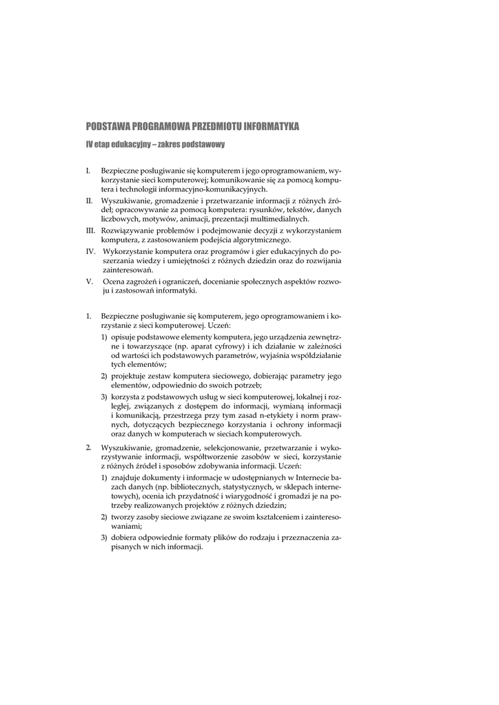 PODSTAWA PROGRAMOWA PRZEDMIOTU INFORMATYKA IV etap edukacyjny – zakres podstawowy I. Bezpieczne posługiwanie się komputerem i jego oprogramowaniem, wykorzystanie sieci komputerowej; komunikowanie się za pomocą komputera i technologii informacyjno-komunikacyjnych. II. Wyszukiwanie, gromadzenie i przetwarzanie informacji z różnych źródeł; opracowywanie za pomocą komputera: rysunków, tekstów, danych liczbowych, motywów, animacji, prezentacji multimedialnych. III. Rozwiązywanie problemów i podejmowanie decyzji z wykorzystaniem komputera, z zastosowaniem podejścia algorytmicznego. IV. Wykorzystanie komputera oraz programów i gier edukacyjnych do poszerzania wiedzy i umiejętności z różnych dziedzin oraz do rozwijania zainteresowań. V. Ocena zagrożeń i ograniczeń, docenianie społecznych aspektów rozwoju i zastosowań informatyki. 1. Bezpieczne posługiwanie się komputerem, jego oprogramowaniem i korzystanie z sieci komputerowej. Uczeń: 1) opisuje podstawowe elementy komputera, jego urządzenia zewnętrzne i towarzyszące (np. aparat cyfrowy) i ich działanie w zależności od wartości ich podstawowych parametrów, wyjaśnia współdziałanie tych elementów; 2) projektuje zestaw komputera sieciowego, dobierając parametry jego elementów, odpowiednio do swoich potrzeb; 3) korzysta z podstawowych usług w sieci komputerowej, lokalnej i rozległej, związanych z dostępem do informacji, wymianą informacji i komunikacją, przestrzega przy tym zasad n-etykiety i norm prawnych, dotyczących bezpiecznego korzystania i ochrony informacji oraz danych w komputerach w sieciach komputerowych. 2. Wyszukiwanie, gromadzenie, selekcjonowanie, przetwarzanie i wykorzystywanie informacji, współtworzenie zasobów w sieci, korzystanie z różnych źródeł i sposobów zdobywania informacji. Uczeń: 1) znajduje dokumenty i informacje w udostępnianych w Internecie bazach danych (np. bibliotecznych, statystycznych, w sklepach internetowych), ocenia ich przydatność i wiarygodność i gromadzi je na potrzeby realizowanych projektów z różnych dziedzin; 2) tworzy zasoby sieciowe związane ze swoim kształceniem i zainteresowaniami; 3) dobiera odpowiednie formaty plików do rodzaju i przeznaczenia zapisanych w nich informacji. 3. Uczeń wykorzystuje technologie komunikacyjno-informacyjne do komunikacji i współpracy z nauczycielami i innymi uczniami, a także z innymi osobami, jak również w swoich działaniach kreatywnych. 4. Opracowywanie informacji za pomocą komputera, w tym: rysunków, tekstów, danych liczbowych, animacji, prezentacji multimedialnych i filmów. Uczeń: 1) edytuje obrazy w grafice rastrowej i wektorowej, dostrzega i wykorzystuje różnice między tymi typami obrazów; 2) przekształca pliki graficzne, z uwzględnieniem wielkości plików i ewentualnej utraty jakości obrazów; 3) opracowuje obrazy i filmy pochodzące z różnych źródeł, tworzy albumy zdjęć; 4) opracowuje wielostronicowe dokumenty o rozbudowanej strukturze, stosuje style i szablony, tworzy spis treści; 5) gromadzi w tabeli arkusza kalkulacyjnego dane pochodzące np. z Internetu, stosuje zaawansowane formatowanie tabeli arkusza, dobiera odpowiednie wykresy do zaprezentowania danych; 6) tworzy bazę danych, posługuje się formularzami, porządkuje dane, wyszukuje informacje, stosując filtrowanie; 7) wykonuje podstawowe operacje modyfikowania i wyszukiwania informacji na relacyjnej bazie danych; 8) tworzy rozbudowaną prezentację multimedialną na podstawie konspektu i przygotowuje ją do pokazu, przenosi prezentację do dokumentu i na stronę internetową, prowadzi wystąpienie wspomagane prezentacją; 9) projektuje i tworzy stronę internetową, posługując się stylami, szablonami i elementami programowania. 5. Rozwiązywanie problemów i podejmowanie decyzji z wykorzystaniem komputera, stosowanie podejścia algorytmicznego. Uczeń: 1) prowadzi dyskusje nad sytuacjami problemowymi; 2) formułuje specyfikacje dla wybranych sytuacji problemowych; 3) projektuje rozwiązanie: wybiera metodę rozwiązania, odpowiednio dobiera narzędzia komputerowe, tworzy projekt rozwiązania; 4) realizuje rozwiązanie na komputerze za pomocą oprogramowania aplikacyjnego lub języka programowania; 5) testuje otrzymane rozwiązanie, ocenia jego własności, w tym efektywność działania oraz zgodność ze specyfikacją; 6) przeprowadza prezentację i omawia zastosowania rozwiązania. 6. Wykorzystywanie komputera oraz programów edukacyjnych do poszerzania wiedzy i umiejętności z różnych dziedzin. Uczeń: 1) wykorzystuje oprogramowanie dydaktyczne i technologie informacyjno-komunikacyjne w pracy twórczej i przy rozwiązywaniu zadań i problemów szkolnych; 2) korzysta, odpowiednio do swoich zainteresowań i potrzeb, z zasobów edukacyjnych udostępnianych na portalach przeznaczonych do kształcenia na odległość. 7. Wykorzystywanie komputera i technologii informacyjno-komunikacyjnych do rozwijania zainteresowań, opisywanie zastosowań informatyki, ocena zagrożeń i ograniczeń, aspekty społeczne rozwoju i zastosowań informatyki. Uczeń: 1) opisuje szanse i zagrożenia dla rozwoju społeczeństwa, wynikające z rozwoju technologii informacyjno-komunikacyjnych; 2) omawia normy prawne odnoszące się do stosowania technologii informacyjno-komunikacyjnych, dotyczące m.in. rozpowszechniania programów komputerowych, przestępczości komputerowej, poufności, bezpieczeństwa i ochrony danych oraz informacji w komputerze i w sieciach komputerowych; 3) zapoznaje się z możliwościami nowych urządzeń i programów związanych z technologiami informacyjno-komunikacyjnymi, zgodnie ze swoimi zainteresowaniami i potrzebami edukacyjnymi.