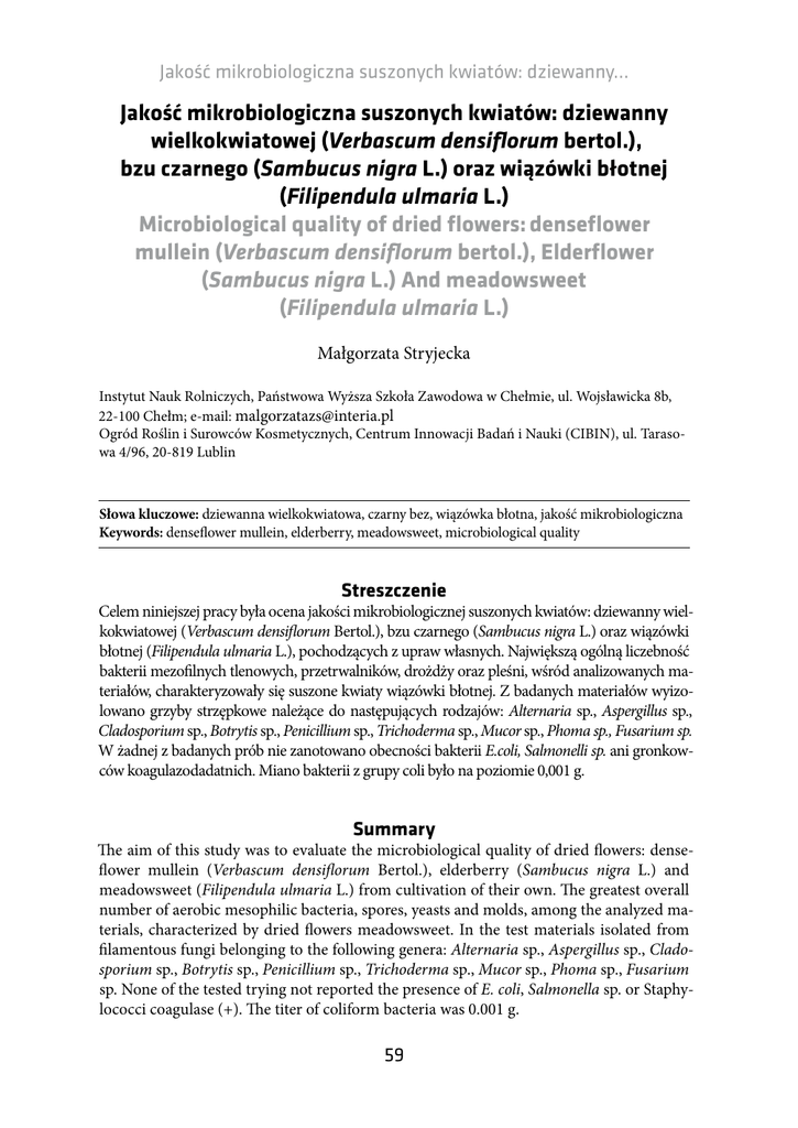 Jakość mikrobiologiczna suszonych kwiatów: dziewanny... Jakość mikrobiologiczna suszonych kwiatów: dziewanny wielkokwiatowej (Verbascum densiflorum bertol.), bzu czarnego (Sambucus nigra L.) oraz wiązówki błotnej (Filipendula ulmaria L.) Microbiological quality of dried flowers: denseflower mullein (Verbascum densiflorum bertol.), Elderflower (Sambucus nigra L.) And meadowsweet (Filipendula ulmaria L.) Małgorzata Stryjecka Instytut Nauk Rolniczych, Państwowa Wyższa Szkoła Zawodowa w Chełmie, ul. Wojsławicka 8b, 22-100 Chełm; e-mail: [email protected] Ogród Roślin i Surowców Kosmetycznych, Centrum Innowacji Badań i Nauki (CIBIN), ul. Tarasowa 4/96, 20-819 Lublin Słowa kluczowe: dziewanna wielkokwiatowa, czarny bez, wiązówka błotna, jakość mikrobiologiczna Keywords: denseflower mullein, elderberry, meadowsweet, microbiological quality Streszczenie Celem niniejszej pracy była ocena jakości mikrobiologicznej suszonych kwiatów: dziewanny wielkokwiatowej (Verbascum densiflorum Bertol.), bzu czarnego (Sambucus nigra L.) oraz wiązówki błotnej (Filipendula ulmaria L.), pochodzących z upraw własnych. Największą ogólną liczebność bakterii mezofilnych tlenowych, przetrwalników, drożdży oraz pleśni, wśród analizowanych materiałów, charakteryzowały się suszone kwiaty wiązówki błotnej. Z badanych materiałów wyizolowano grzyby strzępkowe należące do następujących rodzajów: Alternaria sp., Aspergillus sp., Cladosporium sp., Botrytis sp., Penicillium sp., Trichoderma sp., Mucor sp., Phoma sp., Fusarium sp. W żadnej z badanych prób nie zanotowano obecności bakterii E.coli, Salmonelli sp. ani gronkowców koagulazodadatnich. Miano bakterii z grupy coli było na poziomie 0,001 g. Summary The aim of this study was to evaluate the microbiological quality of dried flowers: denseflower mullein (Verbascum densiflorum Bertol.), elderberry (Sambucus nigra L.) and meadowsweet (Filipendula ulmaria L.) from cultivation of their own. The greatest overall number of aerobic mesophilic bacteria, spores, yeasts and molds, among the analyzed materials, characterized by dried flowers meadowsweet. In the test materials isolated from filamentous fungi belonging to the following genera: Alternaria sp., Aspergillus sp., Cladosporium sp., Botrytis sp., Penicillium sp., Trichoderma sp., Mucor sp., Phoma sp., Fusarium sp. None of the tested trying not reported the presence of E. coli, Salmonella sp. or Staphylococci coagulase (+). The titer of coliform bacteria was 0.001 g. 59