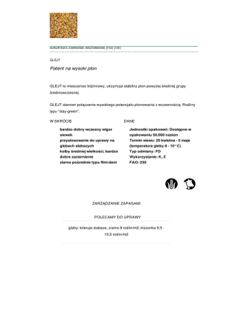 KUKURYDZA ZIARNOWA /KISZONKOWA [FAO 230] GLEJT Patent na wysoki plon GLEJT to mieszaniec trójliniowy, utrzymuje stabilny plon powyżej średniej grupy średniowczesnej. GLEJT stanowi połączenie wysokiego potencjału plonowania z wczesnością. Rośliny typu "stay-green". W SKRÓCIE DANE bardzo dobry wczesny wigor Jednostki opakowań: Dostępne w siewek opakowaniu 50.000 nasion przystosowanie do uprawy na Termin siewu: 20 kwietna - 5 maja glebach słabszych (temperatura gleby 8 - 10°C) kolby średniej wielkości, bardzo Typ odmiany: FD dobre zaziarnienie Wykorzystanie: K, Z ziarno pośrednie typu flint-dent FAO: 230 ZARZĄDZANIE ZAPASAMI POLECAMY DO UPRAWY gleby: toleruje słabsze, ziarno 8 roślin/m2; kiszonka 9,5 10,5 roślin/m2