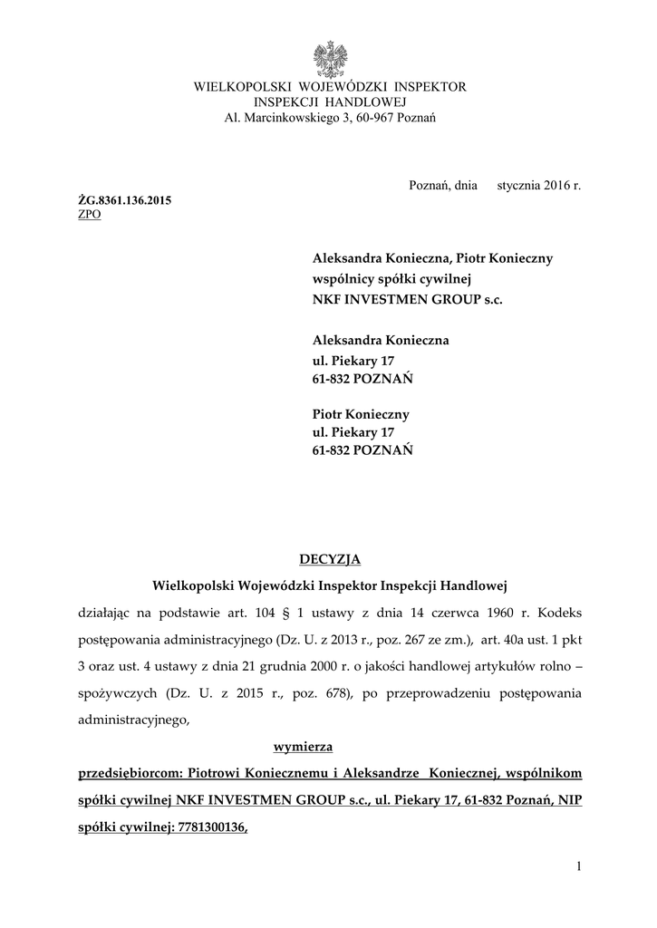 WIELKOPOLSKI WOJEWÓDZKI INSPEKTOR INSPEKCJI HANDLOWEJ Al. Marcinkowskiego 3, 60-967 Poznań Poznań, dnia stycznia 2016 r. ŻG.8361.136.2015 ZPO Aleksandra Konieczna, Piotr Konieczny wspólnicy spółki cywilnej NKF INVESTMEN GROUP s.c. Aleksandra Konieczna ul. Piekary 17 61-832 POZNAŃ Piotr Konieczny ul. Piekary 17 61-832 POZNAŃ DECYZJA Wielkopolski Wojewódzki Inspektor Inspekcji Handlowej działając na podstawie art. 104 § 1 ustawy z dnia 14 czerwca 1960 r. Kodeks postępowania administracyjnego (Dz. U. z 2013 r., poz. 267 ze zm.), art. 40a ust. 1 pkt 3 oraz ust. 4 ustawy z dnia 21 grudnia 2000 r. o jakości handlowej artykułów rolno – spożywczych (Dz. U. z 2015 r., poz. 678), po przeprowadzeniu postępowania administracyjnego, wymierza przedsiębiorcom: Piotrowi Koniecznemu i Aleksandrze Koniecznej, wspólnikom spółki cywilnej NKF INVESTMEN GROUP s.c., ul. Piekary 17, 61-832 Poznań, NIP spółki cywilnej: 7781300136, 1 karę pieniężną w wysokości 500,00 zł (słownie: piećset złotych 00/100), wynikającą z art. 40 a ust. 1 pkt 3 ustawy z dnia 21 grudnia 2000 r. o jakości handlowej artykułów rolno-spożywczych, z tytułu wprowadzenia do obrotu handlowego w dniu kontroli tj. w dniu 24 sierpnia 2015 roku, w restauracji „Czerwone Sombrero”, Stary Rynek 2, 61-772 Poznań, przedsiębiorcy: Piotr Konieczny, Aleksandra Konieczna, wspólnicy spółki cywilnej NKF INVESTMEN GROUP s.c., ul. Piekary 17, 61-832 Poznań, artykułu rolno - spożywczego nieodpowiadającego jakości handlowej określonej w przepisach o jakości handlowej, tj. wyrobu gastronomicznego, o wartości 18,90 zł. Kontrolowany przedsiębiorca wprowadził do obrotu artykuły rolno- spożywcze nieodpowiadające jakości handlowej określonej w przepisach o jakości handlowej co skutkuje zastosowaniem w przedmiotowej sprawie art. 40a ust. 1 pkt 3 ustawy o jakości handlowej artykułów rolno - spożywczych. „Kto wprowadza do obrotu artykuły rolno-spożywcze nieodpowiadające jakości handlowej określonej w przepisach o jakości handlowej lub deklarowanej przez producenta w oznakowaniu tych artykułów, podlega karze pieniężnej majątkowej w uzyskanej wysokości lub do która pięciokrotnej mogłaby zostać wartości korzyści uzyskana przez wprowadzenie tych artykułów rolno-spożywczych do obrotu, nie niższej jednak niż 500 zł.”. Uzasadnienie Podczas Kontroli przeprowadzonej przez Wielkopolskiego Wojewódzkiego Inspektora Inspekcji Handlowej, w dniach od 24 sierpnia do 2 września 2015 r., w restauracji „Czerwone Sombrero”, Stary Rynek 2, 61-772 Poznań, przedsiębiorcy: 2 Piotr Konieczny, Aleksandra Konieczna, wspólnicy spółki cywilnej NKF INVESTMEN GROUP s.c., ul. Piekary 17, 61-832 Poznań. W toku kontroli, pobrano do badań laboratoryjnych 1 porcję (1 próbkę) produktu pod nazwą - sałatka ENSALAD DEL DIABLO (sałata ,papryka, pomidor suszony, sos balsamic) z polędwiczką 350g, w cenie 18,90 zł/porcja, udokumentowując powyższą czynność w protokole pobrania próbki produktu nr 093580, z dnia 24.08.2015 r. Laboratorium Kontrolno-Analityczne w Poznaniu Urzędu Ochrony Konkurencji i Konsumentów w Warszawie, wykonało badanie próbki produktu i sporządziło Sprawozdanie z badań nr 238/2015 z dnia 25.08.2015 r. Przeprowadzone badania laboratoryjne wykazały, że poddany ocenie jakościowej produkt, należy zakwestionować z uwagi na niewłaściwe cechy organoleptyczne, czyli brak w rzeczywistym składzie produktu papryki zadeklarowanej w menu. Wobec powyższego należy uznać, że kontrolowani wprowadzili do obrotu artykuły rolno-spożywcze nieodpowiadające jakości handlowej określonej w przepisach o jakości handlowej co skutkuje zastosowaniem art. 40 a ust. 1 pkt 3 ustawy o jakości handlowej artykułów rolno-spożywczych. „Kto wprowadza do obrotu artykuły rolno-spożywcze nieodpowiadające jakości handlowej określonej w przepisach o jakości handlowej lub deklarowanej przez producenta w oznakowaniu tych artykułów, podlega karze pieniężnej w wysokości do pięciokrotnej wartości korzyści majątkowej uzyskanej lub która mogłaby zostać uzyskana przez wprowadzenie tych artykułów rolno-spożywczych do obrotu, nie niższej jednak niż 500 zł.”. 3 Zgodnie z art. 3 pkt 5 ustawy o jakości handlowej artykułów rolno-spożywczych jakość handlowa to cechy artykułu rolno-spożywczego dotyczące jego właściwości organoleptycznych, fizykochemicznych i mikrobiologicznych w zakresie technologii, produkcji, wielkości lub masy oraz wymagania wynikające ze sposobu produkcji, opakowania, prezentacji i oznakowania, nieobjęte wymaganiami sanitarnymi, weterynaryjnymi lub fitosanitarnymi. Celem prawa żywnościowego jest szeroko rozumiana ochrona interesów konsumentów. Art. 8 rozporządzenia (WE) nr 178/2002 Parlamentu Europejskiego i Rady ustanawiającego ogólne zasady i wymagania prawa żywnościowego, powołującego Europejski Urząd ds. Bezpieczeństwa Żywności i ustanawiającego procedury w zakresie bezpieczeństwa żywności (Dz. Urz. UE L 31 z 01.02.2002 r. ze zm.) precyzuje, że celem tego prawa jest ochrona interesów konsumentów i umożliwienie im świadomego wyboru związanego ze spożywaną przez nich żywnością. Prawo żywnościowe ma przeciwdziałać oszukańczym lub podstępnym praktykom, fałszowaniu żywności oraz wszelkim innym praktykom mogącym wprowadzić konsumentów w błąd. Zgodnie z art. 17 wyżej wskazywanego rozporządzenia odpowiedzialność za naruszenie prawa żywnościowego ponoszą wszyscy przedsiębiorcy, na każdym etapie produkcji, przetwarzania i dystrybucji w przedsiębiorstwach będących pod ich kontrolą, oraz zapewniają zgodność tej żywności lub pasz z wymogami prawa żywnościowego właściwymi dla ich działalności a także zapewniają kontrolowanie przestrzegania tych wymogów. W kontekście powyższego Wielkopolski Wojewódzki Inspektor Inspekcji Handlowej uznał, iż zgodnie z art. 17 rozporządze