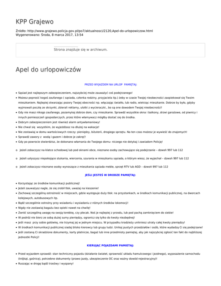 KPP Grajewo Źródło: http://www.grajewo.policja.gov.pl/po7/aktualnosci/2120,Apel-do-urlopowiczow.html Wygenerowano: Środa, 8 marca 2017, 13:54 Strona znajduje się w archiwum. Apel do urlopowiczów PRZED WYJAZDEM NA URLOP PAMIĘTAJ: ● Sąsiad jest najlepszym zabezpieczeniem, najszybciej może zauważyć coś podejrzanego! ● Możesz poprosić kogoś zaufanego ( sąsiada, członka rodziny, przyjaciela itp.) żeby w czasie Twojej nieobecności zaopiekował się Twoim mieszkaniem. Najlepiej stwarzając pozory Twojej obecności np. włączając światło, lub radio, wietrząc mieszkanie. Dobrze by było, gdyby wyjmowali pocztę ze skrzynki, zbierali reklamy, ulotki z wycieraczki., bo są one dowodem Twojej nieobecności! ● Gdy nie masz nikogo zaufanego, pozamykaj dobrze dom, czy mieszkanie. Sprawdź wszystkie okna i balkony, drzwi garażowe, od piwnicy i innych pomieszczeń gospodarczych, przez które włamywacz mógłby dostać się do środka. ● Dobrym zabezpieczeniem jest również alarm antywłamaniowy! ● Nie chwal się wszystkim, że wyjeżdżasz na dłużej na wakacje! ● Nie zostawiaj w domu wartościowych rzeczy: pieniędzy, biżuterii, drogiego sprzętu. Na ten czas możesz je wywieść do znajomych! ● Sprawdź zawory z wodą i gazem i dobrze je zakręć! ● Gdy po powrocie stwierdzisz, że dokonano włamania do Twojego domu- niczego nie dotykaj i zawiadom Policję! o Jeżeli zobaczysz na klatce schodowej lub pod oknami obce, nieznane osoby zachowujące się podejrzanie – dzwoń 997 lub 112 o Jeżeli usłyszysz niepokojące stukania, wiercenia, szurania w mieszkaniu sąsiada, o którym wiesz, że wyjechał – dzwoń 997 lub 112 o Jeżeli zobaczysz nieznane osoby wynoszące z mieszkania sąsiada meble, sprzęt RTV lub AGD – dzwoń 997 lub 112 JEŚLI JESTEŚ W DRODZE PAMIĘTAJ: ● Korzystając ze środków komunikacji publicznej! ● Jeżeli zauważysz nagle, że się zrobił tłok, uważaj na kieszenie! ● Zachowaj szczególną ostrożność w miejscach, gdzie występuje duży tłok: na przystankach, w środkach komunikacji publicznej, na dworcach kolejowych, autobusowych itp. ● Bądź szczególnie ostrożny przy wsiadaniu i wysiadaniu z różnych środków lokomocji! ● Nigdy nie zostawiaj bagażu bez opieki nawet na chwilę! ● Zwróć szczególną uwagę na swoją torebkę, czy plecak. Noś je najlepiej z przodu, lub pod pachą zamknięciem do siebie! ● W podróż nie bierz ze sobą dużej sumy pieniędzy, ogranicz się tylko do kwoty niezbędnej! ● Jeśli masz przy sobie gotówkę, nie trzymaj jej w jednym miejscu. W przypadku kradzieży unikniesz utraty całej kwoty pieniędzy! ● W środkach komunikacji publicznej siadaj blisko kierowcy lub grupy ludzi. Unikaj pustych przedziałów i osób, które wydadzą Ci się podejrzane! ● Jeśli zostaną Ci skradzione dokumenty, karty płatnicze, bagaż lub inne przedmioty pamiętaj, aby jak najszybciej zgłosić ten fakt do najbliższej jednostki Policji! KIERUJĄC POJAZDAMI PAMIETAJ: ● Przed wyjazdem sprawdź: stan techniczny pojazdu (działanie świateł, sprawność układu hamulcowego i jezdnego), wyposażenie samochodu (trójkąt, gaśnicę), potrzebne dokumenty (prawo jazdy, ubezpieczenie OC oraz ważny dowód rejestracyjny)! ● Ruszając w drogę bądź trzeźwy i wyspany! ● Dokładnie zaplanuj trasę podróży, wszystkie postoje i odpoczynki! ● Korzystaj z pasów bezpieczeństwa i fotelików dla dzieci- będziecie bezpieczni! ● Dostosuj prędkość jazdy do warunków panujących na drodze. Zachowaj odpowiedni odstęp od pojazdu poprzedzającego! ● Wyraźnie i odpowiednio wcześniej, w sposób widoczny i zrozumiały dla innych uczestników ruchu sygnalizuj swoje zamiary na drodze (takie jak manewry wyprzedzania i omijania, zmiany kierunku lub pasa ruchu oraz zatrzymanie i postój)! ● Zwróć szczególną uwagę na pieszych i kierujących jednośladami. Mogą być niewidoczni na drodze! ZABEZPIECZAJĄC SAMOCHÓD PAMIĘTAJ: ● Parkuj go zawsze w miejscach publicznych, dobrze oświetlonych! ● Na dłuższy okres czasu samochód parkuj najlepiej na parkingu strzeżonym, pamiętając o pozamykaniu okien i drzwi! ● Nie zostawiaj w samochodzie cennych przedmiotów ( telefonu, torebki, portfela itp.) i zakupów. Szybciej skusi to potencjalnego złodzieja! WYPOCZYWAJĄC PAMIĘTAJ: ZAGROŻENIA WYNIKAJĄCE ZE SPOŻYWANIA ALKOHOLU: ● Zdecydowanie odmawiaj spożycia alkoholu.. Pamiętaj, że alkohol opóźnia reakcję i ogranicza świadomość! ● Osoby pod wpływem alkoholu szybciej popełniają przestępstwa, lub stają się ich ofiarami! ● Będąc na dyskotece, czy „imprezie” nie zostawiaj swego drinka i miej go zawsze na oku. Nie przyjmuj napoi od osób nieznanych gdyż mogły zostać do niego dosypane substancje psychoaktywne, w różnym stopniu ograniczające świadomość! ● Sprzedaż, częstowanie oraz kupno alkoholu dla dzieci jest przestępstwem PODCZAS POBYTU NAD WODĄ PAMIĘTAJ: Najbezpieczniejsze są kąpieliska oznakowane i pod nadzorem ratowników! ● Zawsze stosuj się do regulaminu kąpieliska, słuchaj się ratowników, opiekunów, policji! ● Nie zakłócaj spokoju innych, nie krzycz, nie udawaj, że się topisz! ● Nie skacz do wody w miejscach, w których nie znasz głębokości ani budowy dna, gdyż może się to skończyć kalectwem lub śmiercią! ● Pilnuj dzieci, które są w wodzie, nawet zwykłe zachłyśnięcie może skończyć się tragedią! ● Nie zostawiaj cennych rzeczy na brzegu bez opieki, lepiej zostaw je w domu, lub oddaj do przechowalni! ● Korzystając ze sprzętu wodnego zakładaj zawsze kamizelkę ratunkową! ● Nie pływaj łódkami, kajakami, rowerami czy motorówkami zbyt blisko kąpiących się! ● Nie odpływaj zbyt daleko na materacu! Pamiętaj! Większość utonięć jest rezultatem braku wyobraźni: korzystania z kąpieli po spożyciu alkoholu, w miejscach zabronionych czy skakania do wody bezpośrednio po opalaniu Ocena: 0/5
