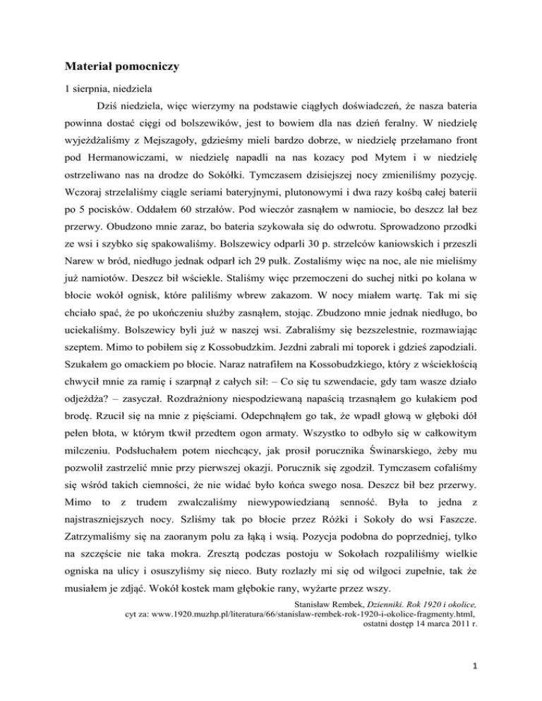 Materiał pomocniczy 1 sierpnia, niedziela Dziś niedziela, więc wierzymy na podstawie ciągłych doświadczeń, że nasza bateria powinna dostać cięgi od bolszewików, jest to bowiem dla nas dzień feralny. W niedzielę wyjeżdżaliśmy z Mejszagoły, gdzieśmy mieli bardzo dobrze, w niedzielę przełamano front pod Hermanowiczami, w niedzielę napadli na nas kozacy pod Mytem i w niedzielę ostrzeliwano nas na drodze do Sokółki. Tymczasem dzisiejszej nocy zmieniliśmy pozycję. Wczoraj strzelaliśmy ciągle seriami bateryjnymi, plutonowymi i dwa razy kośbą całej baterii po 5 pocisków. Oddałem 60 strzałów. Pod wieczór zasnąłem w namiocie, bo deszcz lał bez przerwy. Obudzono mnie zaraz, bo bateria szykowała się do odwrotu. Sprowadzono przodki ze wsi i szybko się spakowaliśmy. Bolszewicy odparli 30 p. strzelców kaniowskich i przeszli Narew w bród, niedługo jednak odparł ich 29 pułk. Zostaliśmy więc na noc, ale nie mieliśmy już namiotów. Deszcz bił wściekle. Staliśmy więc przemoczeni do suchej nitki po kolana w błocie wokół ognisk, które paliliśmy wbrew zakazom. W nocy miałem wartę. Tak mi się chciało spać, że po ukończeniu służby zasnąłem, stojąc. Zbudzono mnie jednak niedługo, bo uciekaliśmy. Bolszewicy byli już w naszej wsi. Zabraliśmy się bezszelestnie, rozmawiając szeptem. Mimo to pobiłem się z Kossobudzkim. Jezdni zabrali mi toporek i gdzieś zapodziali. Szukałem go omackiem po błocie. Naraz natrafiłem na Kossobudzkiego, który z wściekłością chwycił mnie za ramię i szarpnął z całych sił: – Co się tu szwendacie, gdy tam wasze działo odjeżdża? – zasyczał. Rozdrażniony niespodziewaną napaścią trzasnąłem go kułakiem pod brodę. Rzucił się na mnie z pięściami. Odepchnąłem go tak, że wpadł głową w głęboki dół pełen błota, w którym tkwił przedtem ogon armaty. Wszystko to odbyło się w całkowitym milczeniu. Podsłuchałem potem niechcący, jak prosił porucznika Świnarskiego, żeby mu pozwolił zastrzelić mnie przy pierwszej okazji. Porucznik się zgodził. Tymczasem cofaliśmy się wśród takich ciemności, że nie widać było końca swego nosa. Deszcz bił bez przerwy. Mimo to z trudem zwalczaliśmy niewypowiedzianą senność. Była to jedna z najstraszniejszych nocy. Szliśmy tak po błocie przez Różki i Sokoły do wsi Faszcze. Zatrzymaliśmy się na zaoranym polu za łąką i wsią. Pozycja podobna do poprzedniej, tylko na szczęście nie taka mokra. Zresztą podczas postoju w Sokołach rozpaliliśmy wielkie ogniska na ulicy i osuszyliśmy się nieco. Buty rozlazły mi się od wilgoci zupełnie, tak że musiałem je zdjąć. Wokół kostek mam głębokie rany, wyżarte przez wszy. Stanisław Rembek, Dzienniki. Rok 1920 i okolice, cyt za: www.1920.muzhp.pl/literatura/66/stanislaw-rembek-rok-1920-i-okolice-fragmenty.html, ostatni dostęp 14 marca 2011 r. 1 Pytania do analizy i interpretacji tekstu: 1. Opowiedz, jak wyglądało codzienne życie polskiego żołnierza. 2. Powiedz, czego doświadcza autor dziennika ze strony współtowarzyszy. 3. Wyjaśnij, z jakimi problemami musi zmagać się autor tekstu. 2