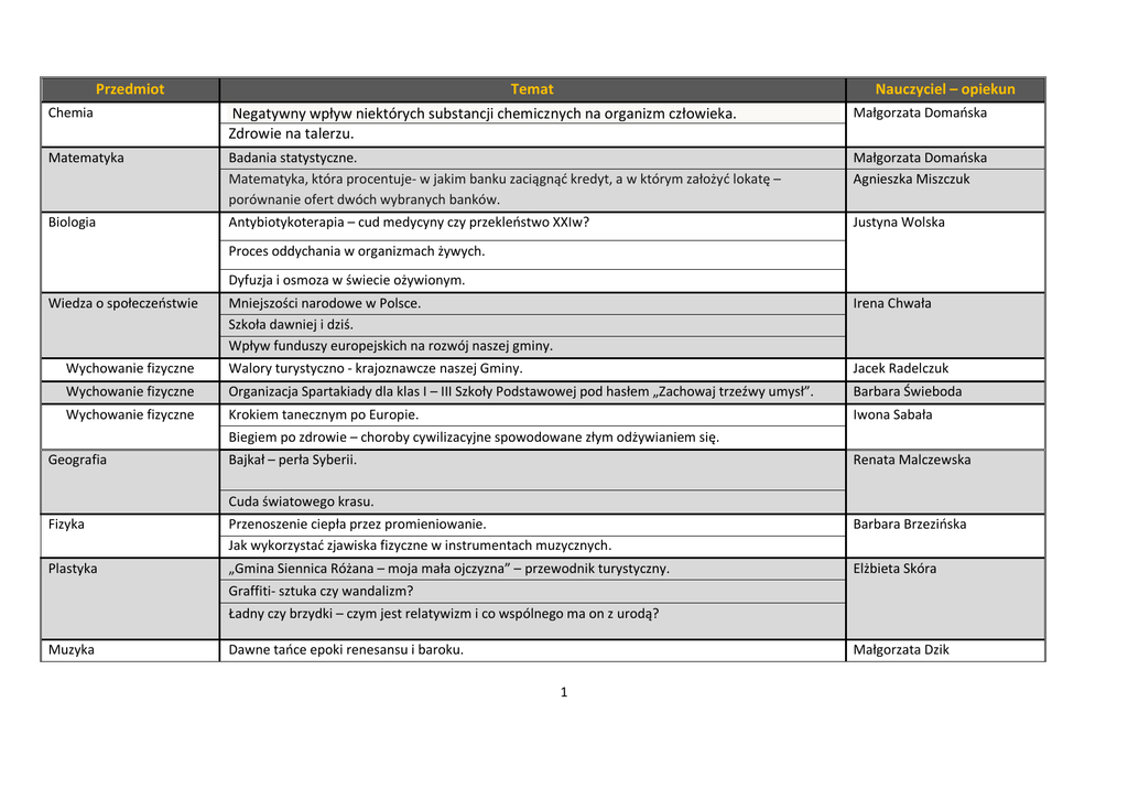 Przedmiot Temat Nauczyciel – opiekun Chemia Negatywny wpływ niektórych substancji chemicznych na organizm człowieka. Zdrowie na talerzu. Małgorzata Domaoska Matematyka Badania statystyczne. Matematyka, która procentuje- w jakim banku zaciągnąd kredyt, a w którym założyd lokatę – porównanie ofert dwóch wybranych banków. Małgorzata Domaoska Agnieszka Miszczuk Biologia Antybiotykoterapia – cud medycyny czy przekleostwo XXIw? Justyna Wolska Proces oddychania w organizmach żywych. Dyfuzja i osmoza w świecie ożywionym. Wiedza o społeczeostwie Mniejszości narodowe w Polsce. Szkoła dawniej i dziś. Wpływ funduszy europejskich na rozwój naszej gminy. Irena Chwała Wychowanie fizyczne Walory turystyczno - krajoznawcze naszej Gminy. Jacek Radelczuk Wychowanie fizyczne Organizacja Spartakiady dla klas I – III Szkoły Podstawowej pod hasłem „Zachowaj trzeźwy umysł”. Barbara Świeboda Wychowanie fizyczne Krokiem tanecznym po Europie. Iwona Sabała Biegiem po zdrowie – choroby cywilizacyjne spowodowane złym odżywianiem się. Geografia Bajkał – perła Syberii. Renata Malczewska Cuda światowego krasu. Fizyka Przenoszenie ciepła przez promieniowanie. Jak wykorzystad zjawiska fizyczne w instrumentach muzycznych. Barbara Brzezioska Plastyka „Gmina Siennica Różana – moja mała ojczyzna” – przewodnik turystyczny. Elżbieta Skóra Graffiti- sztuka czy wandalizm? Ładny czy brzydki – czym jest relatywizm i co wspólnego ma on z urodą? Muzyka Dawne taoce epoki renesansu i baroku. Małgorzata Dzik 1 Muzyka na dużym ekranie. Język angielski Język angielski w piosence- czyli czego słucha angielska młodzież? Żaneta Marciniak Jak uczyd się języka angielskiego przez film i muzykę? Discover London- Londyn i jego tajemnice. Czy używasz języka angielskiego na co dzieo? Słowa angielskie w języku polskim. Tradycje i zwyczaje w krajach anglojęzycznych. English can be fun – korzyści płynące z nauki języka angielskiego. Język angielski … i właśnie dlatego warto uczyd się języka angielskiego! - film zachęcający innych uczniów do nauki języka angielskiego. Jaka jest znajomośd języków obcych w naszej gminie? - praca badawcza. Anna Proskura Język niemiecki Trzydniowa wycieczka do jednego z krajów niemieckojęzycznych – prezentacja atrakcji turystycznych. Prezentacja miejscowości, w której mieszkam w języku niemieckim. Zabytki dwóch stolic Rosji,Moskwy i Sankt-Petersburga. Rosyjskie tradycje świąteczne. Poczet władców Rosji , od Ruryka do Miedwiediewa. Z elektroniką na ty. Dominika Chmiel – Lewkowicz Język rosyjski Zajęcia techniczne Ewa Michalak Paweł Dołhan Motoryzacja moje hobby. Projekt i budowa gokarta. Przeprowadzamy renowacje naszego zabytku. Informatyka Tworzenie filmów dydaktycznych do wybranego działu z podręcznika. Jak za pomocą komputera zaplanowad i wyliczyd koszt wycieczki klasowej? 2 Tomasz Malczewski Język polski ABC wiedzy o epokach literackich. Przewodnik dla gimnazjalisty w formie map mentalnych. Maryla Rudzka Od średniowiecznego rycerza do współczesnego dżentelmena . Dziennik z podróży po krajach egzotycznych. Historia Sarmatyzm - kultura szlachecka w okresie baroku. Odkrywamy świat. Nieznany kolorowy świat. Elżbieta Kufel Religia Towarzystwo Przyjaciół Metropolitalnego Seminarium Duchownego w Lublinie. Jezus wskazuje drogowskazy do szczęścia – błogosławieostwa prawem Królestwa Bożego. Anna Popek Edukacja czytelnicza i medialna Od książki do Internetu – historia druku. Joanna Włodarczyk Gazetka szkolna – wydanie specjalne. Najciekawsze miejsca we Francji – przewodnik turystyczny. Pedagog szkolny Palenie jest słabe. Dorota Koguciuk 3
