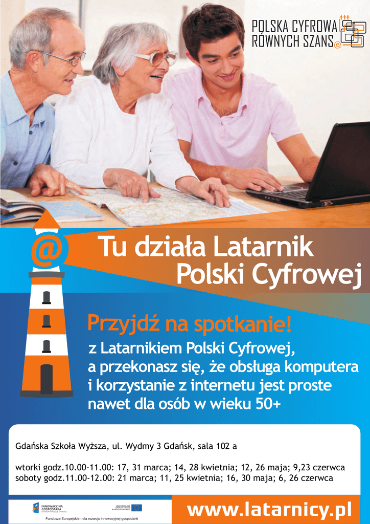 Tu dzia³a Latarnik Polski Cyfrowej PrzyjdŸ na spotkanie! z Latarnikiem Polski Cyfrowej, a przekonasz siê, ¿e obs³uga komputera i korzystanie z internetu jest proste nawet dla osób w wieku 50+ Gdańska Szkoła Wyższa, ul. Wydmy 3 Gdańsk, sala 102 a wtorki godz.10.00-11.00: 17, 31 marca; 14, 28 kwietnia; 12, 26 maja; 9,23 czerwca soboty godz.11.00-12.00: 21 marca; 11, 25 kwietnia; 16, 30 maja; 6, 26 czerwca