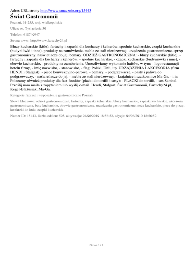Adres URL strony http://www.smacznie.org/15443 Świat Gastronomii Poznań, 61-255, woj. wielkopolskie Ulica: os. Tysiąclecia 30 Telefon: 618740947 Strona www: http://www.fartuchy24.pl Bluzy kucharskie (kitle), fartuchy i zapaski dla kucharzy i kelnerów, spodnie kucharskie, czapki kucharskie (budyniówki i inne), produkty na zamówienie, meble ze stali nierdzewnej, urządzenia gastronomiczne, sprzęt gastronomiczny, naświetlacze do jaj, bemary. ODZIEŻ GASTRONOMICZNA: - bluzy kucharskie (kitle), fartuchy i zapaski dla kucharzy i kelnerów, - spodnie kucharskie, - czapki kucharskie (budyniówki i inne), obuwie kucharskie, - produkty na zamówienie. Umożliwiamy wykonanie haftów, w tym: - logo restauracji hotelu firmy, - imię nazwisko, - stanowisko, - flagi Polski, Unii, itp. URZĄDZENIA I AKCESORIA (firm HENDI i Stalgast): - piece konwekcyjno-parowe, - bemary, - podgrzewacze, - pasty i paliwa do podgrzewaczy, - naświetlacze do jaj, - meble ze stali nierdzewnej, - krajalnice i szatkownice Ma-Ga, - i in Polecamy również produkty dla fast-foodów (placki do tortilli i sosy): - PLACKI do tortilli, - sos Sambal. Prześlij nam maila z zapytaniem lub wyślij e-mail. Hendi, Stalgast, Świat Gastronomii, Fartuchy24.pl, Kegel-Błażusiak, Ma-Ga. Kategorie: Sprzęt i wyposażenie gastronomiczne Poznań Słowa kluczowe: odzież gastronomiczna, fartuchy, zapaski kelnerskie, bluzy kucharskie, zapaski kucharskie, akcesoria gastronomiczne, buty kucharskie, obuwie gastronomiczne, urządzenia gastronomiczne, noże kucharskie, piece do pizzy, kostkarki do lodu, czapki kucharskie Numer ID: 15443, liczba odsłon: 505, aktywacja: 04/06/2010 18:56:52, edycja: 04/06/2010 18:56:52 Strona 1 / 1