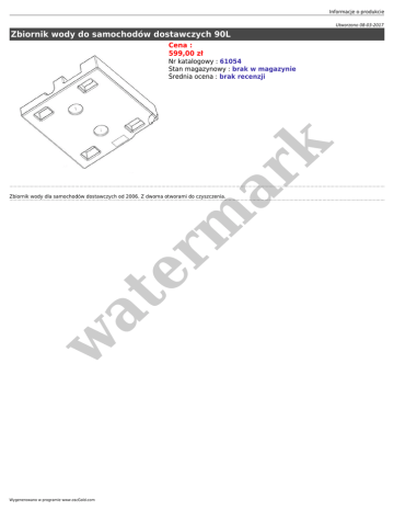 Informacje o produkcie Utworzono 08-03-2017 Zbiornik wody do samochodów dostawczych 90L Cena : 599,00 zł er m ar k Nr katalogowy : 61054 Stan magazynowy : brak w magazynie Średnia ocena : brak recenzji w at Zbiornik wody dla samochodów dostawczych od 2006. Z dwoma otworami do czyszczenia. Wygenerowano w programie www.oscGold.com