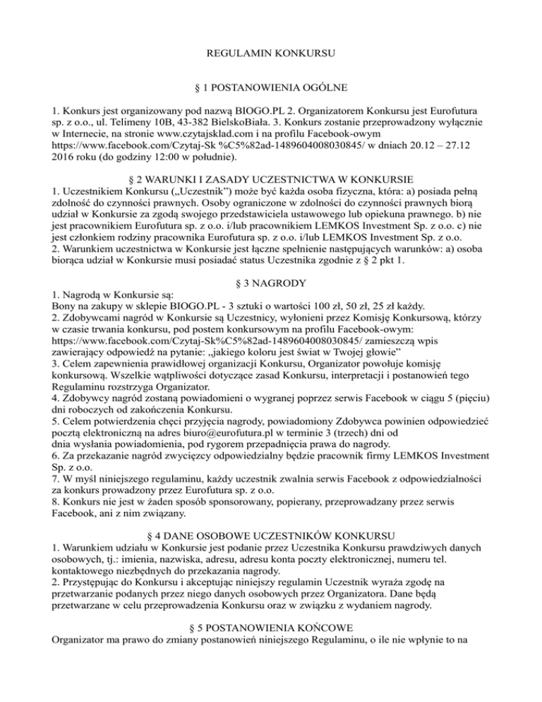 REGULAMIN KONKURSU § 1 POSTANOWIENIA OGÓLNE 1. Konkurs jest organizowany pod nazwą BIOGO.PL 2. Organizatorem Konkursu jest Eurofutura sp. z o.o., ul. Telimeny 10B, 43-382 BielskoBiała. 3. Konkurs zostanie przeprowadzony wyłącznie w Internecie, na stronie www.czytajsklad.com i na profilu Facebook-owym https://www.facebook.com/Czytaj-Sk %C5%82ad-1489604008030845/ w dniach 20.12 – 27.12 2016 roku (do godziny 12:00 w południe). § 2 WARUNKI I ZASADY UCZESTNICTWA W KONKURSIE 1. Uczestnikiem Konkursu („Uczestnik”) może być każda osoba fizyczna, która: a) posiada pełną zdolność do czynności prawnych. Osoby ograniczone w zdolności do czynności prawnych biorą udział w Konkursie za zgodą swojego przedstawiciela ustawowego lub opiekuna prawnego. b) nie jest pracownikiem Eurofutura sp. z o.o. i/lub pracownikiem LEMKOS Investment Sp. z o.o. c) nie jest członkiem rodziny pracownika Eurofutura sp. z o.o. i/lub LEMKOS Investment Sp. z o.o. 2. Warunkiem uczestnictwa w Konkursie jest łączne spełnienie następujących warunków: a) osoba biorąca udział w Konkursie musi posiadać status Uczestnika zgodnie z § 2 pkt 1. § 3 NAGRODY 1. Nagrodą w Konkursie są: Bony na zakupy w sklepie BIOGO.PL - 3 sztuki o wartości 100 zł, 50 zł, 25 zł każdy. 2. Zdobywcami nagród w Konkursie są Uczestnicy, wyłonieni przez Komisję Konkursową, którzy w czasie trwania konkursu, pod postem konkursowym na profilu Facebook-owym: https://www.facebook.com/Czytaj-Sk%C5%82ad-1489604008030845/ zamieszczą wpis zawierający odpowiedź na pytanie: „jakiego koloru jest świat w Twojej głowie” 3. Celem zapewnienia prawidłowej organizacji Konkursu, Organizator powołuje komisję konkursową. Wszelkie wątpliwości dotyczące zasad Konkursu, interpretacji i postanowień tego Regulaminu rozstrzyga Organizator. 4. Zdobywcy nagród zostaną powiadomieni o wygranej poprzez serwis Facebook w ciągu 5 (pięciu) dni roboczych od zakończenia Konkursu. 5. Celem potwierdzenia chęci przyjęcia nagrody, powiadomiony Zdobywca powinien odpowiedzieć pocztą elektroniczną na adres [email protected] w terminie 3 (trzech) dni od dnia wysłania powiadomienia, pod rygorem przepadnięcia prawa do nagrody. 6. Za przekazanie nagród zwycięzcy odpowiedzialny będzie pracownik firmy LEMKOS Investment Sp. z o.o. 7. W myśl niniejszego regulaminu, każdy uczestnik zwalnia serwis Facebook z odpowiedzialności za konkurs prowadzony przez Eurofutura sp. z o.o. 8. Konkurs nie jest w żaden sposób sponsorowany, popierany, przeprowadzany przez serwis Facebook, ani z nim związany. § 4 DANE OSOBOWE UCZESTNIKÓW KONKURSU 1. Warunkiem udziału w Konkursie jest podanie przez Uczestnika Konkursu prawdziwych danych osobowych, tj.: imienia, nazwiska, adresu, adresu konta poczty elektronicznej, numeru tel. kontaktowego niezbędnych do przekazania nagrody. 2. Przystępując do Konkursu i akceptując niniejszy regulamin Uczestnik wyraża zgodę na przetwarzanie podanych przez niego danych osobowych przez Organizatora. Dane będą przetwarzane w celu przeprowadzenia Konkursu oraz w związku z wydaniem nagrody. § 5 POSTANOWIENIA KOŃCOWE Organizator ma prawo do zmiany postanowień niniejszego Regulaminu, o ile nie wpłynie to na pogorszenie warunków uczestnictwa w Konkursie. Dotyczy to w szczególności zmian terminów poszczególnych czynności konkursowych. Zmieniony Regulamin obowiązuje od czasu opublikowania go na stronie www.czytajsklad.com