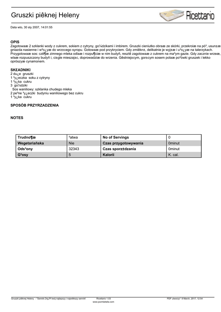 Gruszki piêknej Heleny Data wto, 30 sty 2007, 14:01:55 OPIS Zagotowaæ 2 szklanki wody z cukrem, sokiem z cytryny, go¼dzikami i imbirem. Gruszki cieniutko obraæ ze skórki, przekroiæ na pó³, usun±æ gniazda nasienne i w³o¿yæ do wrz±cego syropu. Gotowaæ pod przykryciem. Gdy zmiêkn±, delikatnie je wyj±æ i u³o¿yæ na talerzykach. Przygotowaæ sos: czê¶æ zimnego mleka odlaæ i rozpu¶ciæ w nim budyñ, resztê zagotowaæ z cukrem na ma³ym gazie. Gdy zacznie wrzeæ, wlaæ rozpuszczony budyñ i, ci±gle mieszaj±c, doprowadziæ do wrzenia. Gêstniej±cym, gor±cym sosem polaæ po³ówki gruszek i lekko oprószyæ cynamonem. SK£ADNIKI 2 du¿e gruszki 1 ³y¿eczka soku z cytryny 1 ³y¿ka cukru 3 go¼dziki Sos waniliowy: szklanka chudego mleka 2 pe³ne ³y¿eczki budyniu waniliowego bez cukru 1 ³y¿ka cukru SPOSÓB PRZYRZADZENIA NOTES Trudno¶æ ³atwa No of Servings 0 Wegetariañska Nie Czas przygotowywania 0minut Ods³ony 32343 Czas sporz±dzania 0minut G³osy 5 Kalorii K. cal. Gruszki piêknej Heleny - *Sennik.Org.Pl twój najlepszy i najwiêkszy sennik! Ricettario 1.03 www.joomlaitalia.com PDF utworzy³ 8 March, 2017, 12:54