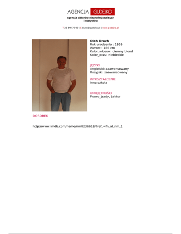T 22 840 76 00 | E [email protected] | www.gudejko.pl Oleh Drach Rok urodzenia : 1959 Wzrost : 186 cm Kolor_wlosow: ciemny blond Kolor_oczu: niebieskie JĘZYKI Angielski: zaawansowany Rosyjski: zaawansowany WYKSZTAŁCENIE Inna szkoła UMIEJĘTNOŚCI Prawo_jazdy, Lektor DOROBEK http://www.imdb.com/name/nm0236618/?ref_=fn_al_nm_1 Powered by TCPDF (www.tcpdf.org)