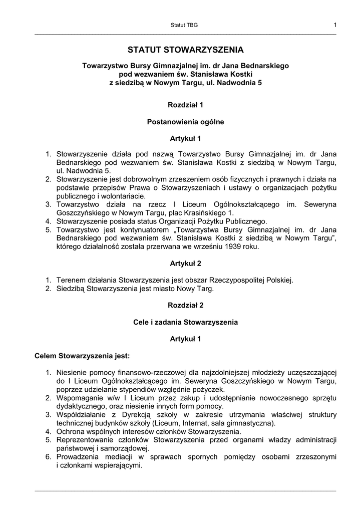 Statut TBG 1 ___________________________________________________________________________________________________ STATUT STOWARZYSZENIA Towarzystwo Bursy Gimnazjalnej im. dr Jana Bednarskiego pod wezwaniem św. Stanisława Kostki z siedzibą w Nowym Targu, ul. Nadwodnia 5 Rozdział 1 Postanowienia ogólne Artykuł 1 1. Stowarzyszenie działa pod nazwą Towarzystwo Bursy Gimnazjalnej im. dr Jana Bednarskiego pod wezwaniem św. Stanisława Kostki z siedzibą w Nowym Targu, ul. Nadwodnia 5. 2. Stowarzyszenie jest dobrowolnym zrzeszeniem osób fizycznych i prawnych i działa na podstawie przepisów Prawa o Stowarzyszeniach i ustawy o organizacjach pożytku publicznego i wolontariacie. 3. Towarzystwo działa na rzecz I Liceum Ogólnokształcącego im. Seweryna Goszczyńskiego w Nowym Targu, plac Krasińskiego 1. 4. Stowarzyszenie posiada status Organizacji Pożytku Publicznego. 5. Towarzystwo jest kontynuatorem „Towarzystwa Bursy Gimnazjalnej im. dr Jana Bednarskiego pod wezwaniem św. Stanisława Kostki z siedzibą w Nowym Targu”, którego działalność została przerwana we wrześniu 1939 roku. Artykuł 2 1. Terenem działania Stowarzyszenia jest obszar Rzeczypospolitej Polskiej. 2. Siedzibą Stowarzyszenia jest miasto Nowy Targ. Rozdział 2 Cele i zadania Stowarzyszenia Artykuł 1 Celem Stowarzyszenia jest: 1. Niesienie pomocy finansowo-rzeczowej dla najzdolniejszej młodzieży uczęszczającej do I Liceum Ogólnokształcącego im. Seweryna Goszczyńskiego w Nowym Targu, poprzez udzielanie stypendiów względnie pożyczek. 2. Wspomaganie w/w I Liceum przez zakup i udostępnianie nowoczesnego sprzętu dydaktycznego, oraz niesienie innych form pomocy. 3. Współdziałanie z Dyrekcją szkoły w zakresie utrzymania właściwej struktury technicznej budynków szkoły (Liceum, Internat, sala gimnastyczna). 4. Ochrona wspólnych interesów członków Stowarzyszenia. 5. Reprezentowanie członków Stowarzyszenia przed organami władzy administracji państwowej i samorządowej. 6. Prowadzenia mediacji w sprawach spornych pomiędzy osobami zrzeszonymi i członkami wspierającymi. ___________________________________________________________________________________________________ 2 Statut TBG ___________________________________________________________________________________________________ Artykuł 2 Towarzystwo urzeczywistnia swoje cele między innymi poprzez: 1. Współdziałanie z organami administracji państwowej i samorządowej we wszystkich sprawach mających znaczenie dla Towarzystwa. 2. Wyrażanie opinii w istotnych sprawach dla osób zrzeszonych w Stowarzyszeniu oraz świadczenie usług consultingowych, prawnych i organizacyjnych. 3. Pozyskiwanie sponsorów, przyjmowanie darowizn i składek. 4. Prowadzenie działalności dydaktyczno – oświatowej. 5. Prowadzenie działalności reklamowej i wydawniczej. 6. Inicjowanie, wspieranie i nawiązywanie współpracy członków Towarzystwa z podmiotami zagranicznymi. 7. Prowadzenie działalności gospodarczej według ogólnych zasad określonych w ustawie o „Działalności pożytku publicznego i wolontariacie”. Artykuł 3 1. Członkiem Stowarzyszenia może być osoba fizyczna zainteresowana celami Stowarzyszenia. 2. Osoba prawna oraz osoba fizyczna prowadząca działalność gospodarczą może być członkiem wspierającym. Artykuł 4 Członkom Stowarzyszenia przysługują prawa do: 1. 2. 3. 4. Uczestniczenia w Walnym Zgromadzeniu. Czynnego i biernego prawa wyborczego do władz Stowarzyszenia. Zgłaszanie wniosków i postulatów na Walnym Zgromadzeniu. Korzystanie z uczestnictwa w szkoleniach organizowanych przez Stowarzyszenie. Członkowie Stowarzyszenia zobowiązani są do: 1. Przestrzegania postanowień Statutu oraz uchwał władz Stowarzyszenia. 2. Uczestniczenia w realizowaniu zadań statutowych Stowarzyszenia. 3. Regularnego opłacania składek członkowskich. Artykuł 5 1. Członkostwo Stowarzyszenia uzyskuje się na mocy uchwały Zarządu Stowarzyszenia podjętej większością głosów na pisemny wniosek osoby zainteresowanej, przy rekomendacji dwóch członków Zarządu. 2. Osobie zainteresowanej służy prawo do odwołania się od uchwały Zarządu Stowarzyszenia odmawiającej przyjęcia na członka Stowarzyszenia do Walnego Zgromadzenia. 3. Odwołanie wnosi się w terminie 14 dni od dnia otrzymania uchwały wraz z uzasadnieniem za pośrednictwem Zarządu. ___________________________________________________________________________________________________ Statut TBG 3 ___________________________________________________________________________________________________ Artykuł 6 1. Członkostwo Stowarzyszenia ustaje na skutek: - wystąpienia członka, - wykreślenia członka, - wykluczenia członka. 2. Wystąpienie następuje poprzez złożenie na piśmie oświadczenia przez członka Zarządowi Stowarzyszenia. Za datę wystąpienia uważa się ostatni dzień miesiąca, w którym złożone zostało oświadczenie o wystąpieniu. 3. Wykreślenie członka następuje na skutek: - śmierci, - niezawinionego przez członka niewykonania obowiązków statutu. 4. Wykluczenie członka następuje na skutek: - działania na szkodę Stowarzyszenia, - uporczywego uchylania się od wykonywania obowiązków statutowych, - popełnienia czynu hańbiącego, a w szczególności naruszenia zasad współżycia społecznego. 5. Wykreślenie i wykluczenie następuje na mocy uchwały Zarządu Stowarzyszenia. Zainteresowanemu przysługuje prawo złożenia pisemnych i ustnych wyjaśnień na posiedzeniu Zarządu w sprawie wykreślenia lub wykluczenia. 6. Od uchwały Zarządu w przedmiocie wykreślenia lub wykluczenia zainteresowanemu przysługuje prawo odwołania do Walnego Zgromadzenia. 7. Odwołanie wnosi się w terminie 14 dni od otrzymania uchwały Zarządu wraz z uzasadnieniem za pośrednictwem Zarządu Stowarzyszenia. 8. Uchwała Walnego Zgromadzenia jest ostateczna. Rozdział 3 Władze Stowarzyszenia Artykuł 1 Władzami Stowarzyszenia są: 1. Walne Zgrom