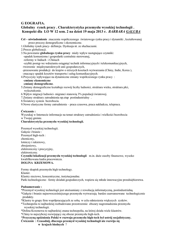 G EOGRAFIA. Globalny rynek pracy . Charakterystyka przemysłu wysokiej technologii . Konspekt dla LO W 12 sem. 2 na dzień 19 maja 2013 r. BARBARA GALUBA Cel – uświadomienie znaczenia współczesnego światowego rynku pracy i dynamiki , kształtowanej przez procesy demograficzne i ekonomiczne. 1.Globalny rynek pracy- definicja. Dyskusja nt. ze słuchaczami. 2.Proces globalizacji. 3.Na powstanie globalnego rynku pracy miały wpływ następujące czynniki: -upadek komunizmu i gospodarki centralnie sterowanej, -reformy w Indiach i Chinach -szybki postęp we wdrażaniu osiągnięć technik informacyjnych i telekomunikacyjnych, -tworzenie międzynarodowych unii gospodarczych, -przesuwanie produkcji do krajów o niższych kosztach wytwarzania (Chiny, Indie, Korea ), -znaczący spadek kosztów transportu i usług komunikacyjnych. 4.Przyczyny wpływające na dynamiczne zmiany współczesnego rynku pracy : -zmiany ekonomiczne -zmiany demograficzne. 5.Zmiany demograficzne kształtuje rozwój liczby ludności, struktura wieku, struktura płci, wykształcenie. 6.Wpływ migracji ludności- migranci stanowią 3% populacji światowej. 7.Zmiany struktury zatrudnienia np.etap postindustrialny . 8.Światowy system bezrobocia. 9.Nowe elastyczne formy zatrudnienia – praca czasowa, praca nakładcza, telepraca. Ćwiczenie : Wyszukaj w Internecie informacje na temat struktury zatrudnienia i wielkości bezrobocia w Twojej gminie. Charakterystyka przemysłu wysokiej technologii. Przemysł wysokiej technologii. Gałęzie i branże : Przemysł high-tech : chemiczny, lotniczy i rakietowy, zbrojeniowy, elektroniczny i precyzyjny, elektroniczny. Czynniki lokalizacji przemysłu wysokiej technologii m.in. duże zasoby finansowe, wysoko kwalifikowana kadra pracownicza. DOLINA KRZEMOWA. Formy skupisk przemysłu high technology. Klaster. Klastry sieciowe, koncentryczne, instytucjonalne. Parki technologiczne– formy działań gospodarczych, wspiera się młode innowacyjne przedsiębiorstwa. Podsumowanie : *Przemysł wysokiej technologii jest utożsamiany z rewolucją informatyczną, postindustrialną. *Gałęzie i branże najnowocześniejszego przemysłu wytwarzają bardzo zaawansowane technologicznie produkty. *Klastry to grupy firm współpracujących ze sobą w celu odniesienia większych zysków. *Technopolia to najbardziej rozbudowane przestrzennie obszary nagromadzenia przemysłu wysokiej technologii. *Dolina Krzemowa to najbardziej znana technopolia, na której działa wiele klastrów. *Chiny to najszybciej rozwijający się obszar przemysłu high-tech. *Przyczyną opóźnienia Polski w rozwoju przemysłu high-tech był ustrój socjalistyczny. Ćwiczenie : Uzasadnij, dlaczego przemysł wysokiej technologii nie rozwija się w krajach biednych ?