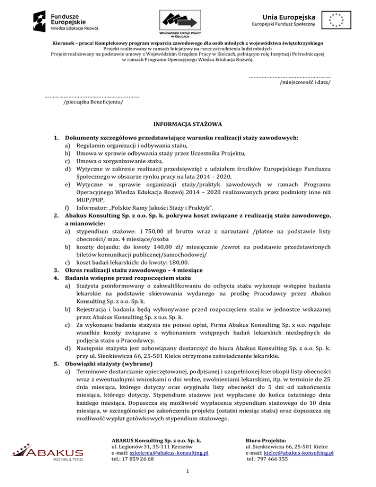 Kierunek – praca! Kompleksowy program wsparcia zawodowego dla osób młodych z województwa świętokrzyskiego Projekt realizowany w ramach Inicjatywy na rzecz zatrudnienia ludzi młodych Projekt realizowany na podstawie umowy z Wojewódzkim Urzędem Pracy w Kielcach, pełniącym rolę Instytucji Pośredniczącej w ramach Programu Operacyjnego Wiedza Edukacja Rozwój. ……………………………………………. /miejscowość i data/ …………………………………………………… /pieczątka Beneficjenta/ INFORMACJA STAŻOWA 1. Dokumenty szczegółowo przedstawiające warunku realizacji staży zawodowych: a) Regulamin organizacji i odbywania stażu, b) Umowa w sprawie odbywania staży przez Uczestnika Projektu, c) Umowa o zorganizowanie stażu, d) Wytyczne w zakresie realizacji przedsięwzięć z udziałem środków Europejskiego Funduszu Społecznego w obszarze rynku pracy na lata 2014 – 2020, e) Wytyczne w sprawie organizacji staży/praktyk zawodowych w ramach Programu Operacyjnego Wiedza Edukacja Rozwój 2014 – 2020 realizowanych przez podmioty inne niż MUP/PUP, f) Informator: „Polskie Ramy Jakości Staży i Praktyk”. 2. Abakus Konsulting Sp. z o.o. Sp. k. pokrywa koszt związane z realizacją stażu zawodowego, a mianowicie: a) stypendium stażowe: 1 750,00 zł brutto wraz z narzutami /płatne na podstawie listy obecności/ max. 4 miesiące/osoba b) koszty dojazdu: do kwoty 140,00 zł/ miesięcznie /zwrot na podstawie przedstawionych biletów komunikacji publicznej/samochodowej/ c) koszt badań lekarskich: do kwoty: 180,00. 3. Okres realizacji stażu zawodowego – 4 miesiące 4. Badania wstępne przed rozpoczęciem stażu a) Stażysta poinformowany o zakwalifikowaniu do odbycia stażu wykonuje wstępne badania lekarskie na podstawie skierowania wydanego na prośbę Pracodawcy przez Abakus Konsulting Sp. z o.o. Sp. k. b) Rejestracja i badania będą wykonywane przed rozpoczęciem stażu w jednostce wskazanej przez Abakus Konsulting Sp. z o.o. Sp. k. c) Za wykonane badania stażysta nie ponosi opłat, Firma Abakus Konsulting Sp. z o.o. reguluje wszelkie koszty związane z wykonaniem wstępnych badań lekarskich niezbędnych do podjęcia stażu u Pracodawcy. d) Następnie stażysta jest zobowiązany dostarczyć do biura Abakus Konsulting Sp. z o.o. Sp. k. przy ul. Sienkiewicza 66, 25-501 Kielce otrzymane zaświadczenie lekarskie. 5. Obowiązki stażysty (wybrane) a) Terminowe dostarczanie opieczętowanej, podpisanej i uzupełnionej kserokopii listy obecności wraz z ewentualnymi wnioskami o dni wolne, zwolnieniami lekarskimi, itp. w terminie do 25 dnia miesiąca, którego dotyczy oraz oryginału listy obecności do 5 dni od zakończenia miesiąca, którego dotyczy. Stypendium stażowe jest wypłacane do końca ostatniego dnia każdego miesiąca. Dopuszcza się możliwość wypłacenia stypendium stażowego do 10 dnia miesiąca, w szczególności po zakończeniu projektu (ostatni miesiąc stażu) oraz dopuszcza się możliwość wypłat gotówkowych stypendium stażowego. ABAKUS Konsulting Sp. z o.o. Sp. k. ul. Legionów 31, 35-111 Rzeszów e-mail: [email protected] tel.: 17 859 26 68 1 Biuro Projektu: ul. Sienkiewicza 66, 25-501 Kielce e-mail: [email protected] tel.: 797 466 355 Kierunek – praca! Kompleksowy program wsparcia zawodowego dla osób młodych z województwa świętokrzyskiego Projekt realizowany w ramach Inicjatywy na rzecz zatrudnienia ludzi młodych Projekt realizowany na podstawie umowy z Wojewódzkim Urzędem Pracy w Kielcach, pełniącym rolę Instytucji Pośredniczącej w ramach Programu Operacyjnego Wiedza Edukacja Rozwój. b) Beneficjent może wstrzymać wypłatę stypendium w przypadku niedostarczenia listy obecności w wymaganym terminie, o którym mowa w ust. 2 c) Beneficjent zastrzega, iż w ostatnim miesiącu stażowym, UP ma obowiązek dostarczyć oryginał listy obecności do ostatniego dnia wskazanego miesiąca. 6. Wolne dni w trakcie trwania stażu d) Stażyście przysługuje w czasie odbywania stażu urlop wypoczynkowy, w wymiarze 2 dni robocze za każde 30 dni kalendarzowych odbytego stażu. /Dni wolne udziela się na pisemny wniosek stażysty/ e) Honorowemu dawcy Krwi (osobie, która bezpłatnie i dobrowolnie oddała krew) przysługuje zwolnienie z odbywania stażu w dniu oddania krwi z zachowaniem prawa do stypendium stażowego. /Stażysta po oddaniu krwi ma obowiązek przedstawienia zaświadczenia celem usprawiedliwienia nieobecności na stażu/ f) Stażyście nie przysługują dni wole z tytułu zwolnień lekarskich sanatoryjnych, z tytułu opieki nad dzieckiem, urlopu macierzyńskiego, urlopu wychowawczego, urlopu okolicznościowego itp. Jednocześnie pragniemy zaznaczyć, iż wszelkie formalności związane z podjęciem stażu regulowane będą przez firmę ABAKUS Konsulting Sp. z o.o. Sp. k. W przypadku szczegółowych informacji dotyczących obowiązków oraz warunków formalnych dla pracodawcy wynikających z organizacji stażu należy kontaktować się z biurem projektu. ……………….………………………………………………… /data i podpis Uczestnika Projektu/ ABAKUS Konsulting Sp. z o.o. Sp. k. ul. Legionów 31, 35-111 Rzeszów e-mail: [email protected] tel.: 17 859 26 68 2 Biuro Projektu: ul. Sienkiewicza 66, 25-501 Kielce e-mail: [email protected] tel.: 797 466 355