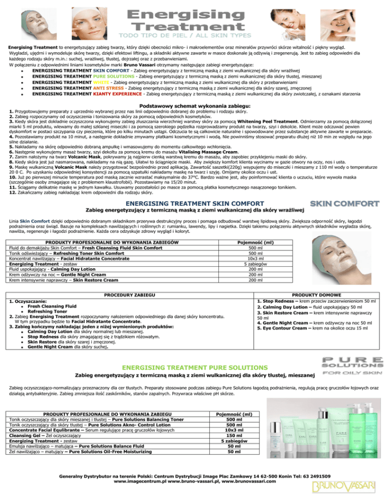 Energising Treatment to energetyzujący zabieg twarzy, który dzięki obecności mikro- i makroelementów oraz minerałów przywróci skórze witalność i piękny wygląd. Wygładzi, ujędrni i wymodeluje skórę twarzy, dzięki efektowi liftingu, a składniki aktywne zawarte w masce doskonale ją odżywią i zregenerują. Jest to zabieg odpowiedni dla każdego rodzaju skóry m.in.: suchej, wrażliwej, tłustej, dojrzałej oraz z przebarwieniami. W połączeniu z odpowiednimi liniami kosmetyków marki Bruno Vassari otrzymamy następujące zabiegi energetyzujące: ENERGISING TREATMENT SKIN COMFORT - Zabieg energetyzujący z termiczną maską z ziemi wulkanicznej dla skóry wrażliwej ENERGISING TREATMENT PURE SOLUTIONS - Zabieg energetyzujący z termiczną maską z ziemi wulkanicznej dla skóry tłustej, mieszanej ENERGISING TREATMENT WHITE - Zabieg energetyzujący z termiczną maską z ziemi wulkanicznej dla skóry z przebarwieniami ENERGISING TREATMENT ANTI STRESS - Zabieg energetyzujący z termiczną maską z ziemi wulkanicznej dla skóry szarej, zmęczonej ENERGISING TREATMENT KIANTY EXPERIENCE - Zabieg energetyzujący z termiczną maską z ziemi wulkanicznej dla skóry zwiotczałej, z oznakami starzenia Podstawowy schemat wykonania zabiegu: 1. Przygotowujemy preparaty z uprzednio wybranej przez nas linii odpowiednio dobranej do problemu i rodzaju skóry. 2. Zabieg rozpoczynamy od oczyszczenia i tonizowania skóry za pomocą odpowiednich kosmetyków. 3. Kiedy skóra jest dokładnie oczyszczona wykonujemy zabieg złuszczania wierzchniej warstwy skóry za pomocą Whitening Peel Treatment. Odmierzamy za pomocą dołączonej miarki 5 ml produktu, wlewamy do małej szklanej miseczki i za pomocą szerokiego pędzelka rozprowadzamy produkt na twarzy, szyi i dekolcie. Klient może odczuwać pewien dyskomfort w postaci szczypania czy pieczenia, które po kilku minutach ustąpi. Odczucia te są całkowicie naturalne i spowodowane przez substancje aktywne zawarte w preparacie. 4. Pozostawiamy produkt na 10 minut, a następnie dokładnie zmywamy płatkami kosmetycznymi i wodą. Nie powinniśmy stosować preparatu dłużej niż 10 min ze względu na jego silne działanie. 5. Nakładamy na skórę odpowiednio dobraną ampułkę i wmasowujemy do momentu całkowitego wchłonięcia. 6. Następnie wykonujemy masaż twarzy, szyi dekoltu za pomocą kremu do masażu Vitalising Massage Cream. 7. Zanim nałożymy na twarz Volcanic Mask, pokrywamy ją najpierw cienką warstwą kremu do masażu, aby zapobiec przyklejeniu maski do skóry. 8. Kiedy skóra jest już nasmarowana, nakładamy na nią gazę. Ułatwi to ściągnięcie maski. Aby zwiększy komfort klienta wycinamy w gazie otwory na oczy, nos i usta. 9. Maskę wulkaniczną Volcanic Mask należy przygotować bezpośrednio przed aplikacją. Zawartość saszetki(220g) wsypujemy do miseczki i mieszamy z 110 ml wody o temperaturze 20 0 C. Po uzyskaniu odpowiedniej konsystencji za pomocą szpatułki nakładamy maskę na twarz i szyję. Omijamy okolice oczu i ust. 10. Już po pierwszej minucie temperatura pod maską zacznie wzrastać maksymalnie do 37°C. Bardzo ważne jest, aby poinformować klienta o uczuciu, które wywoła maska (szczególnie osoby zmagające się z problemem klaustrofobii). Pozostawiamy na 15/20 minut. 11. Ściągamy delikatnie maskę w jednym kawałku. Usuwamy pozostałości po masce za pomocą płatka kosmetycznego nasączonego tonikiem. 12. Zakańczamy zabieg nakładając krem odpowiedni dla rodzaju skóry. ENERGISING TREATMENT SKIN COMFORT Zabieg energetyzujący z termiczną maską z ziemi wulkanicznej dla skóry wrażliwej Linia Skin Comfort dzięki odpowiednio dobranym składnikom przerywa destrukcyjny proces i pomaga odbudować warstwę lipidową skóry. Zwiększa odporność skóry, łagodzi podrażnienia oraz świąd. Bazuje na kompleksach nawilżających i roślinnych z: rumianku, lawendy, lipy i nagietka. Dzięki takiemu połączeniu aktywnych składników wygładza skórę, nawilża, regeneruje i łagodzi podrażnienie. Każda cera odzyskuje zdrowy wygląd i koloryt. PRODUKTY PROFESJONALNE DO WYKONANIA ZABIEGÓW Fluid do demakijażu Skin Comfort – Fresh Cleansing Fluid Skin Comfort Tonik odświeżający – Refreshing Toner Skin Comfort Koncentrat nawilżający – Facial Hidratante Concentrate Energizing Treatment - zestaw Fluid uspokajający - Calming Day Lotion Krem odżywczy na noc – Gentle Night Cream Krem intensywnie naprawczy – Skin Restore Cream Pojemność (ml) 500 ml 500 ml 10x3 ml 5 zabiegów 200 ml 200 ml 200 ml PROCEDURY ZABIEGU 1. Oczyszczanie: Fresh Cleansing Fluid Refreshing Toner 2. Zabieg Energising Treatment rozpoczynamy nałożeniem odpowiedniego dla danej skóry koncentratu. W tym przypadku będzie to Facial Hidratante Concentrate. 3. Zabieg kończymy nakładając jeden z niżej wymienionych produktów: Calming Day Lotion dla skóry normalnej lub mieszanej. Stop Redness dla skóry zmagającej się z trądzikiem różowatym. Skin Restore dla skóry szarej i zmęczonej. Gentle Night Cream dla skóry suchej. PRODUKTY DOMOWE 1. Stop Redness – krem przeciw zaczerwienieniom 50 ml 2. Calming Day Lotion – fluid uspokajający 50 ml 3. Skin Restore Cream – krem intensywnie naprawczy 50 ml 4. Gentle Night Cream – krem odżywczy na noc 50 ml 5. Eye Contour Cream – krem na okolice oczu 15 ml ENERGISING TREATMENT PURE SOLUTIONS Zabieg energetyzujący z termiczną maską z ziemi wulkanicznej dla skóry tłustej, mieszanej Zabieg oczyszczająco-normalizujący przeznaczony dla cer tłustych. Preparaty stosowane podczas zabiegu Pure Solutions łagodzą podrażnienia, regulują pracę gruczołów łojowych oraz działają antybakteryjnie. Zabieg zmniejsza ilość zaskórników, stanów zapalnych. Przywraca właściwe pH skórze. PRODUKTY PROFESJONALNE DO WYKONANIA ZABIEGU Tonik oczyszczający dla skóry mieszanej i tłustej – Pure Solutions Balancing Toner Tonik oczyszczający dla skóry tłustej – Pure 