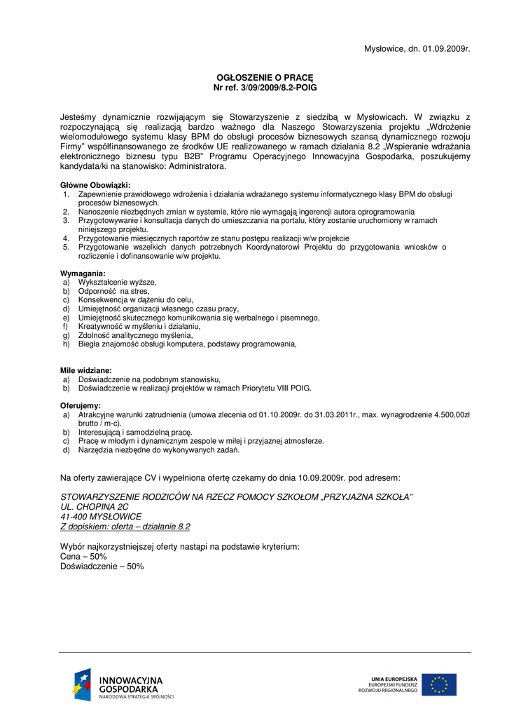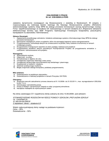 Mysłowice, dn. 01.09.2009r. OGŁOSZENIE O PRACĘ Nr ref. 3/09/2009/8.2-POIG Jesteśmy dynamicznie rozwijającym się Stowarzyszenie z siedzibą w Mysłowicach. W związku z rozpoczynającą się realizacją bardzo ważnego dla Naszego Stowarzyszenia projektu „Wdrożenie wielomodułowego systemu klasy BPM do obsługi procesów biznesowych szansą dynamicznego rozwoju Firmy” współfinansowanego ze środków UE realizowanego w ramach działania 8.2 „Wspieranie wdrażania elektronicznego biznesu typu B2B” Programu Operacyjnego Innowacyjna Gospodarka, poszukujemy kandydata/ki na stanowisko: Administratora. Główne Obowiązki: 1. Zapewnienie prawidłowego wdrożenia i działania wdrażanego systemu informatycznego klasy BPM do obsługi procesów biznesowych. 2. Nanoszenie niezbędnych zmian w systemie, które nie wymagają ingerencji autora oprogramowania 3. Przygotowywanie i konsultacja danych do umieszczania na portalu, który zostanie uruchomiony w ramach niniejszego projektu. 4. Przygotowanie miesięcznych raportów ze stanu postępu realizacji w/w projekcie 5. Przygotowanie wszelkich danych potrzebnych Koordynatorowi Projektu do przygotowania wniosków o rozliczenie i dofinansowanie w/w projektu. Wymagania: a) Wykształcenie wyższe, b) Odporność na stres, c) Konsekwencja w dążeniu do celu, d) Umiejętność organizacji własnego czasu pracy, e) Umiejętność skutecznego komunikowania się werbalnego i pisemnego, f) Kreatywność w myśleniu i działaniu, g) Zdolność analitycznego myślenia, h) Biegła znajomość obsługi komputera, podstawy programowania, Mile widziane: a) Doświadczenie na podobnym stanowisku, b) Doświadczenie w realizacji projektów w ramach Priorytetu VIII POIG. Oferujemy: a) Atrakcyjne warunki zatrudnienia (umowa zlecenia od 01.10.2009r. do 31.03.2011r., max. wynagrodzenie 4.500,00zł brutto / m-c). b) Interesującą i samodzielną pracę. c) Pracę w młodym i dynamicznym zespole w miłej i przyjaznej atmosferze. d) Narzędzia niezbędne do wykonywanych zadań. Na oferty zawierające CV i wypełniona ofertę czekamy do dnia 10.09.2009r. pod adresem: STOWARZYSZENIE RODZICÓW NA RZECZ POMOCY SZKOŁOM „PRZYJAZNA SZKOŁA” UL. CHOPINA 2C 41-400 MYSŁOWICE Z dopiskiem: oferta – działanie 8.2 Wybór najkorzystniejszej oferty nastąpi na podstawie kryterium: Cena – 50% Doświadczenie – 50%