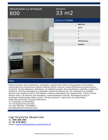 MIESZKANIE na WYNAJEM 800 Stargard 33 m2 20/2147/OMW 800 PLN 1970 1 2 1 WithWindow Asphalt Opis Ofertą wynajmu jest mieszkanie 1 pokojowe o powierzchni 33m2 w Stargardzie Szczecińskim mieszczące się na pierwszym piętrze budynku blisko centrum miasta.Mieszkanie po generalnym remoncie. Ściany gładzone, malowane, na podłodze panele, okna plastikowe. Łazienka w glazurze i terakocie. Kuchnia wyposażona w lodówkę i piekarnik elektryczny. Do mieszkania przynależy piwnica oraz wspólna pralnia. Pod blokiem miejsca parkingowe dla mieszkańców. Czynsz wynosi jedynie 100 zł. W budynku jest bezpłatny, bezprzewodowy internet. Wymagana kaucja w wysokości jednomiesięcznego czynszu. Gorąco polecam i zapraszam na prezentację. Świat Nieruchomości Krystyna Skworcow ul. Chrobrego 5a (Starówka) 73-110 Stargard Szczeciński Tel: 500 296 440 , 915780827 [email protected] mgr Krystyna Skworcow tel. 500 296 440 tel. 91 578 0827 email: [email protected] Świat Nieruchomości Krystyna Skworcow sp-ka z o.o. Świat Nieruchomości Krystyna Skworcow sp-ka z o.o. Powered by TCPDF (www.tcpdf.org)