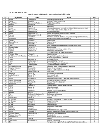 ZAŁACZNIK NR 4 do SIWZ Lista 60 pozycji książkowych z oferty wydawniczej z 2013 roku Lp. 1. 2. 3. 4. 5. 6. 7. 8. 9. 10. 11. 12. 13. 14. 15. 16. 17. 18. 19. 20. 21. 22. 23. 24. 25. 26. 27. 28. 29. 30. 31. 32. 33. 34. 35. 36. 37. 38. 39. 40. 41. 42. 43. 44. 45. 46. 47. 48. 49. 50. 51. 52. 53. 54. 55. 56. 57. 58. 59. 60. Wydawca Agora Agora Akapit Press Albatros Amber Amber Annapurna Arkady Aspra Astrum Bellona Buchmann Cyklady Czarna Owca Czarne Debit Drzewo Babel Edgard Egmont Elipsa Fabryka Słów G+J Gruner+Jahr Polska GWP Helion Helion Iskry Klin Krytyka Polityczna Książka i Wiedza LexisNexis LTW Mamania Media Rodzina MG Muza Nasza Księgarnia Nasza Księgarnia Prószyński PZWL PZWL Rebis Rebis Replika RM Skrzat Sonia Draga W Drodze W Drodze W.A.B. W.A.B. Wilga WNPWN WNPWN WN-T Wolters Kluwer Wydaw. Literackie Zielona Sowa Znak Zwierciadło Żak Autor Cegielski M. Bereś W. Czerwińska-Rydel A. Williams A. Steel D. Daniken E. Czerwińska A. Rettelbusch E. Gałczyński K.I. Jakimowicz-Klein B. Molenda J. Perrault C. Brooks G. Oskarsson L. Rejmer M. Gantzhirn R. Kelman S. Zachariasz K. Brzechwa J. Pilipiuk A. Pawlikowska B. Mendrala D. Walkenbach J. Urbanek M. Chmielewska J. Mason P. Grzesiuk S. Rakoczy B. Pawełczyńska A. Cozza G. Saenz B.A. Proust M. Murakami H. Kern L.J. Wawiłow D. King S. Delavier F. Jarosz M. Vanier N. Mahdavi I. Sykat J. Enderlen-Debuisson M. Montgomery L.M. Brown D. Hadjadj F. Tugwell S. Lapidus J. Kuczok W. Meloy C. Iwanek K. Kołodziejczyk A. Cygański A. Ruskin-Brown I. Munro A. Eben A. Mrowińska A. Tytuł Leksykon buntowników Andrzej Wajda podejrzany Mój brat czarodziej Zabić cara Zwycięzcy Nieprawdopodobne budowle cywilizacji śródziemnomorskiej GórFanka. Moje ABC w skale i lodzie Podręcznik stylów Dzikie wino i kilka innych wierszy o sobie Kuchnia diabetyków Krystyna Skarbek. Królowa antyniemieckiego podziemia czy... Kot w butach i inne baśnie Perrault Rok cudów Czarne tango Bukareszt Alpy. Najpiękniejsze wędrówki od Nicei po Wiedeń Zabić gołębia Jak założyć i rozwinąć własną firmę Wiersze z charakterem 1001 samochodów, o których marzysz Rzeźnik drzew Księga kodów podświadomości Kultura współczesna a zdrowie Windows 8.1 PL Excel 2013 PL. Formuły Tuwim. Wylękniony bluźnierca Życie (nie)całkiem spokojne Skąd ten bunt? Nowe światowe rewolucje Boso, ale w ostrogach Ustawa o odpadach. Komentarz Dary losu Przerwane oczekiwanie Inne zasady lata W stroną Swanna Bezbarwny Tsukuru T. i lata jego pielgrzymstwa Ludwik Jerzy Kern dzieciom Danuta Wawiłow dzieciom Doktor sen Trening mięśni ramion. Atlas ćwiczeń Choroby trzustki Bella i Sebastian Paryski szyk w twoim domu Jesteś tylko mój Dekoracje świąteczne Ania z Avonlea Inferno Kobieta i mężczyzna. O mistyce ciała Pasja Dominika Życie deluxe Obscenariusz Uroczysko. Podziemie Indie Naturalne związki organiczne Metody spektroskopowe w chemii analitycznej Skuteczna polityka cenowa Drogie życie Polscy poeci. Wiersze dla dzieci Dowód Magda, miłość i rak Kompetencje międzykultorowe jako kapitał społeczności ... Ilość 1 1 1 1 1 1 1 1 1 1 1 1 1 1 1 1 1 1 1 1 1 1 1 1 1 1 1 1 1 1 1 1 1 1 1 1 1 1 1 1 1 1 1 1 1 1 1 1 1 1 1 1 1 1 1 1 1 1 1 1