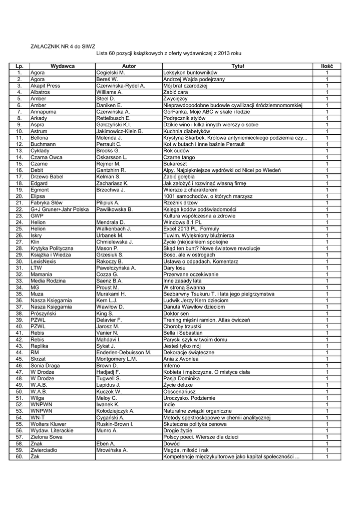 ZAŁACZNIK NR 4 do SIWZ Lista 60 pozycji książkowych z oferty