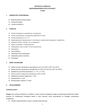 INSTRUKCJA OBSŁUGI BEZPRZEWODOWA STACJA POGODY 177509 1. 2. 3. 4. ZAWARTOŚC OPAKOWANIA Bezprzewodowa stacja pogody Instrukcja obsługi Czujnik zewnętrzny FUNKCJE Pomiar temperatury wewnętrznej i zewnętrznej Pomiar wewnętrznej i zewnętrznej wilgotności (% RH) Pomiar temperatury w oC i oF Zapamiętywanie maksymalnych i minimalnych wartości dla temperatury i wilgotności Kalendarz (dzień, miesiąc, rok, dni tygodnia) Zegar z budzikiem i funkcją drzemki Wyświetlany czas w trybie 12 lub 24 godzinnym. Pogodynka Fazy księżyca Tendencje zmian temperatury Wskaźnik poziomu komfortu Termoalert DANE TECHNICZNE Zakres pomiaru temperatury wewnętrznej: od 0 oC do 50 oC (32°F do 122°F) Zakres pomiaru temperatury zewnętrznej: od -40oC do 70oC (od -40°F do 158°F) Dokładność pomiarów temperatury: +/- 1oC (+/- 2°F) Zakres pomiaru wilgotności wewnętrznej: 20% do 99% Dokładność pomiaru wilgotności: +/-5% Rodzaj baterii: 2 x AA Rodzaj baterii czujnika: 2 x AAA URUCHOMIENIE Instalacja baterii Uwaga: Aby uniknąć problemów w działaniu, należy zwrócić szczególną uwagę na polaryzację alkalicznych baterii podczas ich instalowania (instalacja baterii w złym kierunku może doprowadzić do trwałego uszkodzenia urządzenia). Ustawić bezprzewodowy czujnik w pobliżu stacji bazowej 1 Za pomocą śrubokręta krzyżakowego odkręcić śrubę mocującą zamknięcie schowka baterii Bezprzewodowy czujnik ustawiony jest fabrycznie na kanale pierwszym, (w celu zmiany kanału należy przestawić przełącznik na pozycję 2 lub 3) Włożyć dwie baterie AAA (LR03) do bezprzewodowego czujnika. Nacisnąć przycisk C/F w celu zmiany jednostki wyświetlania temperatury Nacisnąć przycisk CH aby ustalić kanał czujnika 1,2 lub 3. Otworzyć pokrywę baterii znajdującą się na tylnej części stacji bazowej Włożyć dwie baterie AA do stacji pogody. Po włożeniu baterii do stacji pogody słychać będzie krótki dźwięk i zapalą się na 3 s wszystkie segmenty wyświetlacza LCD. Stacja rozpocznie synchronizację z bezprzewodowym czujnikiem. Zamknąć pokrywę baterii Stacja bazowa będzie poszukiwać sygnału radiowego wysyłanego z czujnika zewnętrznego Poczekać do 3 minut aż pojawią się na wyświetlaczu odczyty temperatur z zewnętrznego czujnika bezprzewodowego UWAGA: Nie naciskać żadnych przycisków przed pojawieniem się zewnętrznych wskazań. Zamknąć pokrywę baterii w czujniku bezprzewodowym. Aby odczytywać zewnętrzną temperaturę należy umieścić czujnik na zewnątrz pomieszczenia. Czujnik będzie mierzył i wysyłał zarejestrowane wartości z miejsca, w którym jest zamontowany. Każdorazowo, gdy w czujniku zewnętrznym będą wymieniane baterie, wysyłany jest do stacji losowy kod ochronny. Następuje synchronizacja obu urządzeń. Zatem, jeśli nastąpi wymiana baterii w czujniku, stacja pogody również musi być zrestartowana przez chwilowe wyjęcie baterii, aby odzyskać kontakt z czujnikiem. Uwaga: NIE NACISKAĆ ŻADNEGO PRZYCISKU przez pierwsze 3 minuty po włożeniu baterii. Po pojawieniu się na wyświetlaczu wszystkich (wew. i zew.) mierzonych wartości, można umieścić bezprzewodowy czujnik na zewnątrz, a stację w wybranym miejscu. Jeśli na stacji pogody nie pokażą się zewnętrzne pomiary, upewnij się czy czujnik jest w zasięgu stacji lub powtórz procedurę instalacji baterii. Jeśli został naciśnięty jakiś klawisz przed pojawieniem się wszystkich odczytów na wyświetlaczu stacji, należy ponownie przeprowadzić procedurę instalacji baterii. Przed ponownym zainstalowaniem baterii prosimy poczekać minimum 10 s, aby mieć pewność, że zarówno stacja jak i czujnik zresetują się poprawnie. Uwaga: Kiedy konieczna będzie wymiana baterii w stacji, pojawi się na wyświetlaczu symbol sygnalizujący rozładowanie baterii. Prosimy chronić środowisko i oddawać zużyte baterie i akumulatorki w oznakowanych punktach. Nigdy nie wkładać baterii do ognia. Może to spowodować eksplozję, zagrożenie pożarem lub niebezpieczny wyciek chemiczny i dym. Nie należy: Umieszczać w stacji pogody jednocześnie zużytych baterii z nowymi Umieszczać jednocześnie baterii standardowych z alkalicznymi bądź z akumulatorami 2 5. FUNKCJE PROGRAMOWANIA Wybór jednostki wyświetlania temperatury W trakcie normalnego trybu wyświetlacza wcisnąć przycisk DOWN w celu ustawienia żądanej jednostki temperatury – stopni Celsjusza lub Fahrenheita (oC/oF). Wybór formatu czasu W trakcie normalnego trybu wyświetlacza wcisnąć przycisk UP w celu ustawienia żądanego formatu czasu 12h lub 24h. Ustawienie kalendarza i zegara W trakcie normalnego trybu wyświetlacza wcisnąć i przytrzymać przez 3 sekundy przycisk SET (MODE). Na wyświetlaczu zacznie migać liczba oznaczająca rok. Przyciskiem UP lub DOWN ustawić rok i zatwierdzić wybór przyciskiem SET (MODE). Na wyświetlaczu zacznie migać liczba oznaczająca miesiąc. Przyciskiem UP lub DOWN ustawić miesiąc i zatwierdzić przyciskiem SET (MODE). Na wyświetlaczu zacznie migać liczba oznaczająca dzień, przyciskiem UP lub DOWN ustawić dzień. Potwierdzić ustawienia wciskając przycisk SET (MODE). Na wyświetlaczu zaczną migać skróty języków w jakich będzie się pojawił dzień tygodnia, przyciskiem UP lub DOWN ustawić język, wybór zatwierdzić przyciskiem SET (MODE). Na wyświetlaczu zacznie migać cyfra oznaczająca godzinę. Przyciskiem UP lub DOWN ustawić godzinę i potwierdzić przyciskiem SET, na wyświetlaczu zacznie migać cyfra oznaczająca minuty. Przyciskiem UP lub DOWN ustawić minuty potwierdzić przyciskiem SET (MODE), na wyświetlaczu zacznie migać cyfra oznaczająca dzień. Przyciskiem UP lub DOWN wybrać dzień, wybór potwierdzić przyciskiem MODE. Ustawienie alarmu i drzemki W trakcie normalnego trybu wyświetlacza wcisnąć i przytrzymać przez około 4 sekundy przycisk ALARM aby wejść w tryb alarmu. Na wyświetlaczu zacznie migać cyfra oznaczająca godziny. P