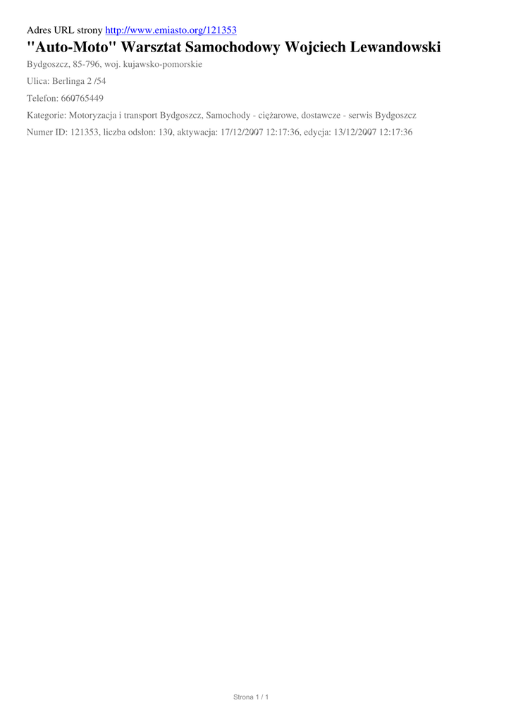 Adres URL strony http://www.emiasto.org/121353 "Auto-Moto" Warsztat Samochodowy Wojciech Lewandowski Bydgoszcz, 85-796, woj. kujawsko-pomorskie Ulica: Berlinga 2 /54 Telefon: 660765449 Kategorie: Motoryzacja i transport Bydgoszcz, Samochody - ciężarowe, dostawcze - serwis Bydgoszcz Numer ID: 121353, liczba odsłon: 130, aktywacja: 17/12/2007 12:17:36, edycja: 13/12/2007 12:17:36 Strona 1 / 1