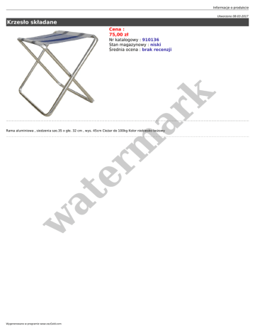 Informacje o produkcie Utworzono 08-03-2017 Krzesło składane Cena : 75,00 zł er m ar k Nr katalogowy : 910136 Stan magazynowy : niski Średnia ocena : brak recenzji w at Rama aluminiowa , siedzenia sze.35 x głe. 32 cm , wys. 45cm Cieżar do 100kg Kolor niebiesko beżowy Wygenerowano w programie www.oscGold.com