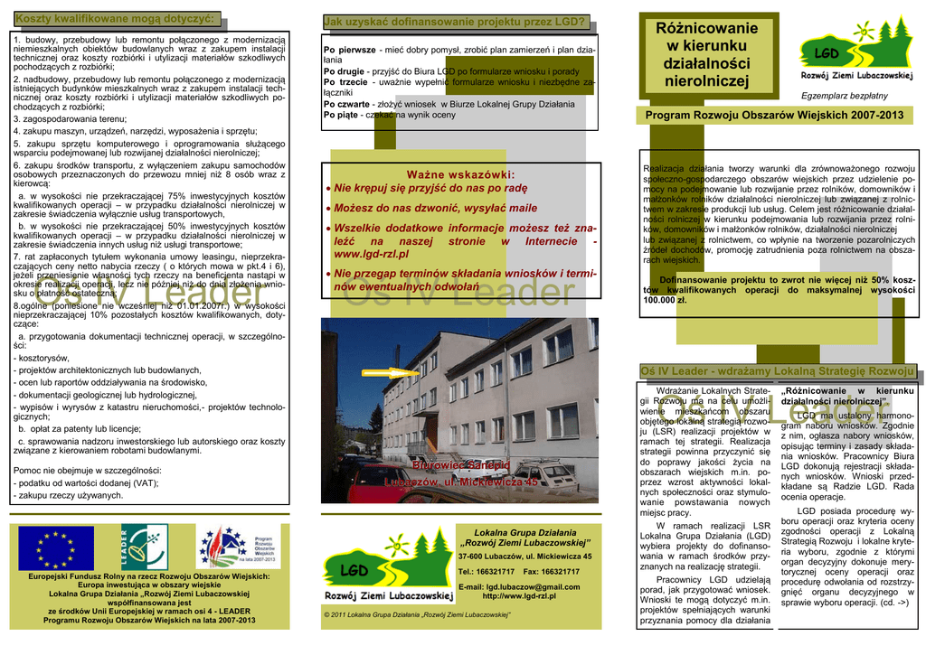 Koszty kwalifikowane mogą dotyczyć: 1. budowy, przebudowy lub remontu połączonego z modernizacją niemieszkalnych obiektów budowlanych wraz z zakupem instalacji technicznej oraz koszty rozbiórki i utylizacji materiałów szkodliwych pochodzących z rozbiórki; 2. nadbudowy, przebudowy lub remontu połączonego z modernizacją istniejących budynków mieszkalnych wraz z zakupem instalacji technicznej oraz koszty rozbiórki i utylizacji materiałów szkodliwych pochodzących z rozbiórki; 3. zagospodarowania terenu; 4. zakupu maszyn, urządzeń, narzędzi, wyposażenia i sprzętu; 5. zakupu sprzętu komputerowego i oprogramowania służącego wsparciu podejmowanej lub rozwijanej działalności nierolniczej; 6. zakupu środków transportu, z wyłączeniem zakupu samochodów osobowych przeznaczonych do przewozu mniej niż 8 osób wraz z kierowcą: a. w wysokości nie przekraczającej 75% inwestycyjnych kosztów kwalifikowanych operacji – w przypadku działalności nierolniczej w zakresie świadczenia wyłącznie usług transportowych, b. w wysokości nie przekraczającej 50% inwestycyjnych kosztów kwalifikowanych operacji – w przypadku działalności nierolniczej w zakresie świadczenia innych usług niż usługi transportowe; 7. rat zapłaconych tytułem wykonania umowy leasingu, nieprzekraczających ceny netto nabycia rzeczy ( o których mowa w pkt.4 i 6), jeżeli przeniesienie własności tych rzeczy na beneficjenta nastąpi w okresie realizacji operacji, lecz nie później niż do dnia złożenia wniosku o płatność ostateczną; 8.ogólne (poniesione nie wcześniej niż 01.01.2007r.) w wysokości nieprzekraczającej 10% pozostałych kosztów kwalifikowanych, dotyczące: a. przygotowania dokumentacji technicznej operacji, w szczególności: - kosztorysów, - projektów architektonicznych lub budowlanych, - ocen lub raportów oddziaływania na środowisko, - dokumentacji geologicznej lub hydrologicznej, - wypisów i wyrysów z katastru nieruchomości,- projektów technologicznych; b. opłat za patenty lub licencje; c. sprawowania nadzoru inwestorskiego lub autorskiego oraz koszty związane z kierowaniem robotami budowlanymi. Oś IV Leader Pomoc nie obejmuje w szczególności: - podatku od wartości dodanej (VAT); - zakupu rzeczy używanych. Jak uzyskać dofinansowanie projektu przez LGD? Po pierwsze - mieć dobry pomysł, zrobić plan zamierzeń i plan działania Po drugie - przyjść do Biura LGD po formularze wniosku i porady Po trzecie - uważnie wypełnić formularze wniosku i niezbędne załączniki Po czwarte - złożyć wniosek w Biurze Lokalnej Grupy Działania Po piąte - czekać na wynik oceny Ważne wskazówki: Nie krępuj się przyjść do nas po radę Możesz do nas dzwonić, wysyłać maile Wszelkie dodatkowe informacje możesz też znaleźć na naszej stronie w Internecie www.lgd-rzl.pl Nie przegap terminów składania wniosków i terminów ewentualnych odwołań Oś IV Leader Egzemplarz bezpłatny Program Rozwoju Obszarów Wiejskich 2007-2013 Realizacja działania tworzy warunki dla zrównoważonego rozwoju społeczno-gospodarczego obszarów wiejskich przez udzielenie pomocy na podejmowanie lub rozwijanie przez rolników, domowników i małżonków rolników działalności nierolniczej lub związanej z rolnictwem w zakresie produkcji lub usług. Celem jest różnicowanie działalności rolniczej w kierunku podejmowania lub rozwijania przez rolników, domowników i małżonków rolników, działalności nierolniczej lub związanej z rolnictwem, co wpłynie na tworzenie pozarolniczych źródeł dochodów, promocję zatrudnienia poza rolnictwem na obszarach wiejskich. Dofinansowanie projektu to zwrot nie więcej niż 50% kosztów kwalifikowanych operacji do maksymalnej wysokości 100.000 zł. Oś IV Leader - wdrażamy Lokalną Strategię Rozwoju Wdrażanie Lokalnych Strategii Rozwoju ma na celu umożliwienie mieszkańcom obszaru objętego lokalną strategią rozwoju (LSR) realizacji projektów w ramach tej strategii. Realizacja strategii powinna przyczynić się do poprawy jakości życia na obszarach wiejskich m.in. poprzez wzrost aktywności lokalnych społeczności oraz stymulowanie powstawania nowych miejsc pracy. „Różnicowanie w kierunku działalności nierolniczej”. Oś IV Leader Biurowiec Sanepid Lubaczów, ul. Mickiewicza 45 Lokalna Grupa Działania „Rozwój Ziemi Lubaczowskiej” 37-600 Lubaczów, ul. Mickiewicza 45 Europejski Fundusz Rolny na rzecz Rozwoju Obszarów Wiejskich: Europa inwestująca w obszary wiejskie Lokalna Grupa Działania „Rozwój Ziemi Lubaczowskiej współfinansowana jest ze środków Unii Europejskiej w ramach osi 4 - LEADER Programu Rozwoju Obszarów Wiejskich na lata 2007-2013 Różnicowanie w kierunku działalności nierolniczej Tel.: 166321717 Fax: 166321717 E-mail: [email protected] http://www.lgd-rzl.pl © 2011 Lokalna Grupa Działania „Rozwój Ziemi Lubaczowskiej” W ramach realizacji LSR Lokalna Grupa Działania (LGD) wybiera projekty do dofinansowania w ramach środków przyznanych na realizację strategii. Pracownicy LGD udzielają porad, jak przygotować wniosek. Wnioski te mogą dotyczyć m.in. projektów spełniających warunki przyznania pomocy dla działania LGD ma ustalony harmonogram naboru wniosków. Zgodnie z nim, ogłasza nabory wniosków, opisując terminy i zasady składania wniosków. Pracownicy Biura LGD dokonują rejestracji składanych wniosków. Wnioski przedkładane są Radzie LGD. Rada ocenia operacje. LGD posiada procedurę wyboru operacji oraz kryteria oceny zgodności operacji z Lokalną Strategią Rozwoju i lokalne kryteria wyboru, zgodnie z którymi organ decyzyjny dokonuje merytorycznej oceny operacji oraz procedurę odwołania od rozstrzygnięć organu decyzyjnego w sprawie wyboru operacji. (cd. ->) (c.d.) Zgodność projektu z Lokalną Strategią Rozwoju uwarunkowana jest realizacją celów ogólnych i szczegółowych w niej zawartych. W opisie celów wymienione są operacje rekomendo