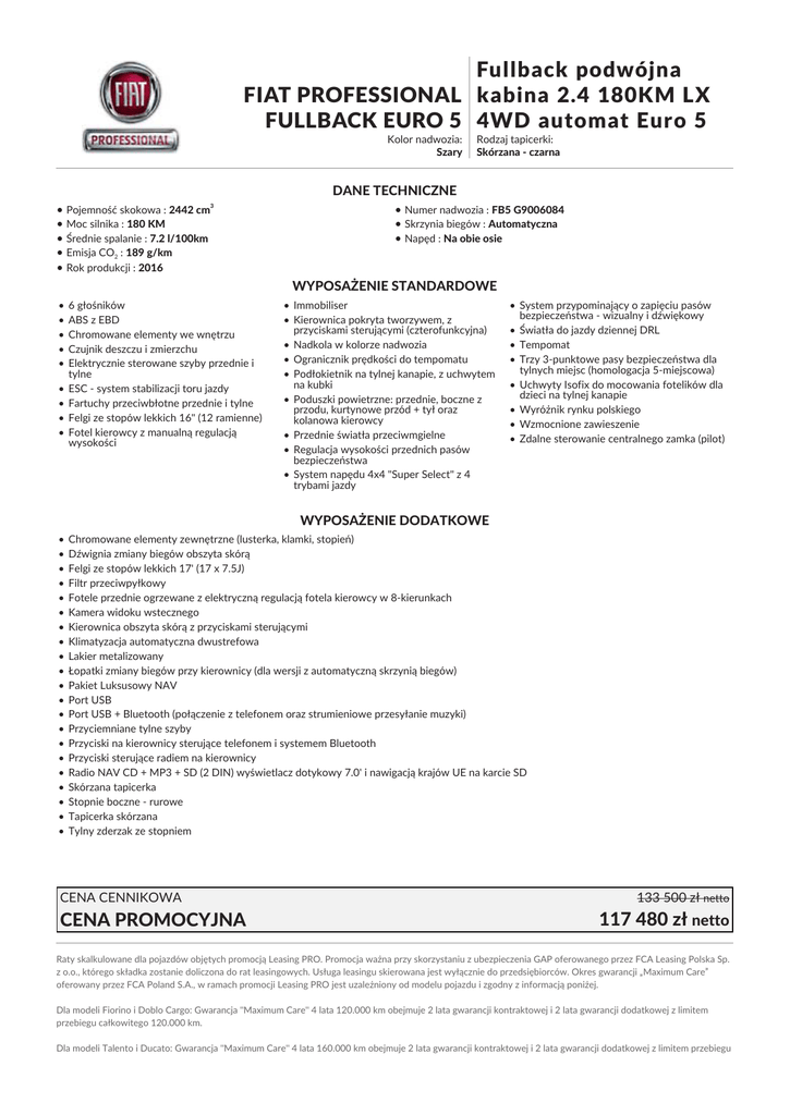 Fullback podwójna FIAT PROFESSIONAL kabina 2.4 180KM LX FULLBACK EURO 5 4WD automat Euro 5 Kolor nadwozia: Szary Rodzaj tapicerki: Skórzana - czarna DANE TECHNICZNE • Pojemność skokowa : 2442 cm • Moc silnika : 180 KM • Średnie spalanie : 7.2 l/100km • Emisja CO2 : 189 g/km • Rok produkcji : 2016 3 • Numer nadwozia : FB5 G9006084 • Skrzynia biegów : Automatyczna • Napęd : Na obie osie WYPOSAŻENIE STANDARDOWE • • • • • • • • • 6 głośników ABS z EBD Chromowane elementy we wnętrzu Czujnik deszczu i zmierzchu Elektrycznie sterowane szyby przednie i tylne ESC - system stabilizacji toru jazdy Fartuchy przeciwbłotne przednie i tylne Felgi ze stopów lekkich 16" (12 ramienne) Fotel kierowcy z manualną regulacją wysokości • Immobiliser • Kierownica pokryta tworzywem, z przyciskami sterującymi (czterofunkcyjna) • Nadkola w kolorze nadwozia • Ogranicznik prędkości do tempomatu • Podłokietnik na tylnej kanapie, z uchwytem na kubki • Poduszki powietrzne: przednie, boczne z przodu, kurtynowe przód + tył oraz kolanowa kierowcy • Przednie światła przeciwmgielne • Regulacja wysokości przednich pasów bezpieczeństwa • System napędu 4x4 "Super Select" z 4 trybami jazdy • System przypominający o zapięciu pasów bezpieczeństwa - wizualny i dźwiękowy • Światła do jazdy dziennej DRL • Tempomat • Trzy 3-punktowe pasy bezpieczeństwa dla tylnych miejsc (homologacja 5-miejscowa) • Uchwyty Isofix do mocowania fotelików dla dzieci na tylnej kanapie • Wyróżnik rynku polskiego • Wzmocnione zawieszenie • Zdalne sterowanie centralnego zamka (pilot) WYPOSAŻENIE DODATKOWE • • • • • • • • • • • • • • • • • • • • • Chromowane elementy zewnętrzne (lusterka, klamki, stopień) Dźwignia zmiany biegów obszyta skórą Felgi ze stopów lekkich 17' (17 x 7.5J) Filtr przeciwpyłkowy Fotele przednie ogrzewane z elektryczną regulacją fotela kierowcy w 8-kierunkach Kamera widoku wstecznego Kierownica obszyta skórą z przyciskami sterującymi Klimatyzacja automatyczna dwustrefowa Lakier metalizowany Łopatki zmiany biegów przy kierownicy (dla wersji z automatyczną skrzynią biegów) Pakiet Luksusowy NAV Port USB Port USB + Bluetooth (połączenie z telefonem oraz strumieniowe przesyłanie muzyki) Przyciemniane tylne szyby Przyciski na kierownicy sterujące telefonem i systemem Bluetooth Przyciski sterujące radiem na kierownicy Radio NAV CD + MP3 + SD (2 DIN) wyświetlacz dotykowy 7.0' i nawigacją krajów UE na karcie SD Skórzana tapicerka Stopnie boczne - rurowe Tapicerka skórzana Tylny zderzak ze stopniem CENA CENNIKOWA CENA PROMOCYJNA 133 500 zł netto 117 480 zł netto Raty skalkulowane dla pojazdów objętych promocją Leasing PRO. Promocja ważna przy skorzystaniu z ubezpieczenia GAP oferowanego przez FCA Leasing Polska Sp. z o.o., którego składka zostanie doliczona do rat leasingowych. Usługa leasingu skierowana jest wyłącznie do przedsiębiorców. Okres gwarancji „Maximum Care” oferowany przez FCA Poland S.A., w ramach promocji Leasing PRO jest uzależniony od modelu pojazdu i zgodny z informacją poniżej. Dla modeli Fiorino i Doblo Cargo: Gwarancja "Maximum Care" 4 lata 120.000 km obejmuje 2 lata gwarancji kontraktowej i 2 lata gwarancji dodatkowej z limitem przebiegu całkowitego 120.000 km. Dla modeli Talento i Ducato: Gwarancja "Maximum Care" 4 lata 160.000 km obejmuje 2 lata gwarancji kontraktowej i 2 lata gwarancji dodatkowej z limitem przebiegu całkowitego 160.000 km. Dla modelu Fullback: Gwarancja "Maximum Care" 5 lat 150.000 km obejmuje 3 lata gwarancji kontraktowej i 2 lata gwarancji dodatkowej z limitem przebiegu całkowitego 150.000 km. Oferta dotyczy samochodów z rocznika produkcji 2016. Ilość samochodów ograniczona. Niniejsze ogłoszenie jest wyłącznie informacją handlową i nie stanowi oferty w myśl art. 66, § 1. Kodeksu Cywilnego. Sprzedający nie odpowiada za ewentualne błędy lub nieaktualność ogłoszenia.