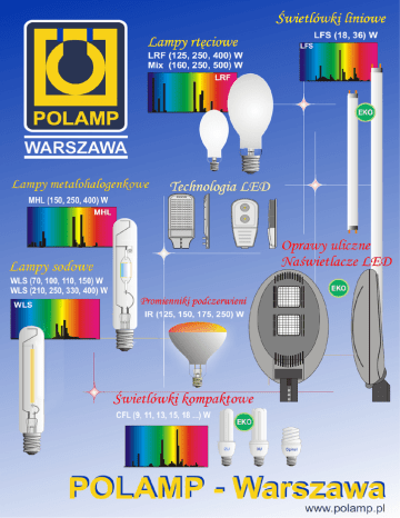 BIURO HANDLU TRADE OFFICE P.P.H. „POLAMP-Warszawa” Sp. z o.o. 05-850 Ożarów Mazowiecki, ul. Poznańska 165 tel. +48 22 722 41 35, tel./fax +48 22 722 16 92 www.polamp.pl e-mail: [email protected] DZIAŁ EKSPORTU EXPORT DIVISION P.P.H. „POLAMP-Warszawa” Sp. z o.o. 05-850 Ożarów Mazowiecki, ul. Poznańska 165 tel./fax +48 22 722 41 34 www.polamp.pl e-mail: [email protected] INFORMACJE TECHNICZNE TECHNICAL INFORMATION P.P.H. „POLAMP-Warszawa” Sp. z o.o. 05-850 Ożarów Mazowiecki, ul. Poznańska 165 Tel. +48 22 722 17 42 w. 29 www.polamp.pl e-mail: [email protected] Spis treści Table of contents RYS HISTORYCZNY SHORT HISTORY OF PLANT 1 WYSOKOPRĘŻNE LAMPY WYŁADOWCZE HIGH INTENSITY DISCHARGE LAMPS 2 High pressure sodium vapour lamps PLUS High pressure sodium vapour lamps High pressure sodium vapour lamps High pressure sodium vapour lamps long life - double burners High pressure sodium vapour lamps - direct replacement for mercury lamps Metal halide lamps quartz Metal halide lamps ceramic Metal halide lamps High pressure mercury vapour lamps Blended light lamps 3 5 11 INCANDESCENT LAMPS 23 Infrared heat lamps 23 FLUORESCENT LAMPS 24 Fluorescent tubes T8 Direct replacement for fluorescent lamps T8 24 26 ENERGY SAVING LAMPS 27 Compact fluorescent lamps 27 BALLASTS 29 Ballasts NaHJ (70; 100; 150; 250; 400) W 29 CAPACITORS 30 Capacitors CBB80 - MKP 30 IGNITORS 30 400 M 4,5 kV; 70 M 2,5 kV; 400 M 5 kV 30 ROAD ILLUMINATION FITTINGS LED 31 Road illumination fittings LED type M –module Road illumination fittings LED type L –lens Road illumination fittings LED type P –path Led floodlights Led floodlights 31 32 33 34 35 FITTINGS FOR SODIUM AND METAL HALIDE LAMPS 36 OSM (70; 100; 150) M OSM (150; 250; 400) D LUM (11.70; 11.100; 11.150) glass AGS-65 (70; 100; 150) W AGS-66 (150; 250; 400) W 36 37 38 39 40 Wysokoprężne lampy sodowe PLUS Wysokoprężne lampy sodowe Wysokoprężne lampy sodowe Wysokoprężne lampy sodowe o przedłużonej trwałości – dwujarznikowe Wysokoprężne lampy sodowe - zamienniki lamp rtęciowych Wysokoprężne lampy metalohalogenkowe Wysokoprężne lampy metalohalogenkowe Wysokoprężne lampy metalohalogenkowe Wysokoprężne lampy rtęciowe Wysokoprężne lampy rtęciowo- żarowe WLS PLUS WLS WLS 1000 W WLS-D WLS MHL kwarc MHL CDM MHL DE, G LRF MIX F LAMPY ŻAROWE Promienniki podczerwieni IR-1 LAMPY FLUORESCENCYJNE Świetlówki liniowe T8 Zamienniki świetlówek liniowych T8 LFS LED-T8 LAMPY ENERGOOSZCZĘDNE Świetlówki kompaktowe CFL STATECZNIKI Stateczniki NaHJ (70;100; 150; 250; 400) W DSMS KONDENSATORY Kondensatory CBB80 - MKP K ELEKTRONICZNE UKŁADY ZAPŁONOWE 400 M 4,5 kV; 70 M 2,5 kV; 400 M 5 kV ZHS OPRAWY ULICZNE Oprawy uliczne LED typ M –moduł Oprawy uliczne LED typ L –soczewki Oprawy uliczne LED typ P –ścieżka Naświetlacze LED Naświetlacze LED OU LED M OU LED L OU LED P ON 1 LED ON 2 LED OPRAWY DO LAMP SODOWYCH I METALO HALOGENKOWYCH OSM (70; 100; 150) M OSM (150; 250; 400) D LUM (11.70; 11.100; 11.150) glass AGS-65 (70; 100; 150) W AGS-66 (150; 250; 400) W OPRAWY PRZECIWWYBUCHOWE DO ŚWIETLÓWEK FLUORESCENT LAMP EXSPLOSIONLINIOWYCH T8 PROOF FITTINGS T8 FLUO Ex 2 x (18; 36; 58) W FLUO Ex Charakterystyki wysokoprężnych lamp wyładowczych Zalecane układy połączeń wysokoprężnych lamp wyładowczych Wskazówki eksploatacyjne dla lamp Oznaczenie cech produktu Ogólne informacje na temat fizycznych własności światła System Bezpieczeństwa HSE w „POLAMP-Warszawa” Sp. z o.o. Certyfikacja wyrobów POLAMP 7 9 13 15 17 19 21 41 FLUO Ex 2 x (18; 36; 58) W 41 Characteristics of discharge lamps Recommended circuit diagrams for discharge lamps Instructions for lamp operation Marking exploitation General information about physical properties of light HSE Safety System in „POLAMP-Warszawa” Sp. z o.o. Product Certification 42 44 44 45 45 46 48 PRZEDSIĘBIORSTWO PRODUKCYJNO - HANDLOWE POLAMP - Warszawa Spółka z o. o. www.polamp.pl RYS HISTORYCZNY 1 SHORT HISTORY OF PLANT 1922 Powstaje Polsko-Holenderska Fabryka Lamp Elektrycznych należąca do koncernu N.V. Philips. Fabryka posiadała w swojej ofercie bogaty asortyment wysokiej jakości wyrobów. Należały do niego m. in. żarówki głównego szeregu, żarówki miniaturowe, jak również elektronowe lampy odbiorcze. 1922 Polish-Dutch Electric Lamp Factory was founded by N.V.Philips. Factory had wide variety of high –quality products, i.e. GLS lamps, miniature lamps as well as Radio lamps. 1938 Produkcja żarówek w Polskiej Fabryce Philips S.A. wynosiła 4 mln sztuk. W tym okresie fabryka zatrudniała 1300 osób, z czego 350 pracowników umysłowych. 1938 Production in Polish Factory PHILIPS reached 4 million pcs. with employment 1 300 including 350 white collars. 1945-50 Powstają „Zakłady im. Róży Luksemburg” Wytwórcze Lamp Elektrycznych Lata 50 - 70-te ZWLE w skutek prac badawczo- rozwojowych • • • • • • • • rozpoczęła produkcję wielu nowoczesnych źródeł światła, m. in. : Lampy elektronowe Lampy rtęciowe i rtęciowo-żarowe typu MIX Świetlówki głównego szeregu o mocy od 20W do 65W oraz miniatury (7,11,13, 18 i 24W) Żarówki halogenowe – samochodowe i specjalnego przeznaczenia Żarówki halogenowe liniowe Lampy sodowe uliczne i sodowe zamienniki lamp rtęciowych Lampy metalohalogenkowe o dużej mocy Diody Lata 80-te Fabryka przeżywała chwilowe trudności związane ze spadkiem krajowej i zagranicznej (ZSRR) sprzedaży oraz z brakiem środków dewizowych związanych z niewymienialnością polskiej waluty. VII 1991 Przekształcenie ZWLE w nową formę organizacyjną o nazwie Przedsiębiorstwo Produkcyjno- Handlowe „POLAMP-Warszawa” Spółka z o.o. Rynek spowodował stopniowe wyeliminowanie wyrobów mało rentownych. Firma skupiła się na produkcji: - lamp metalohalogenkowych - lamp rtęciowych - lamp rtęciowo- żarowych typu MIX - wysokoprężnych lamp sodowych WLS - zamienników lamp rtęciowych - żarówek wysokowatowych - prom