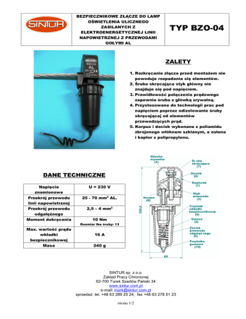 BEZPIECZNIKOWE ZŁĄCZE DO LAMP OŚWIETLENIA ULICZNEGO ZASILANYCH Z ELEKTROENERGETYCZNEJ LINII NAPOWIETRZNEJ Z PRZEWODAMI GOŁYMI AL TYP BZO-04 ZALETY 1. Rozkręcanie złącza przed montażem nie powoduje rozpadania się elementów. 2. Śruba skręcająca styk główny nie znajduje się pod napięciem. 3. Prawidłowość połączenia prądowego zapewnia śruba z główką zrywalną. 4. Przystosowane do technologii prac pod napięciem poprzez odizolowanie śruby skręcającej od elementów przewodzących prąd. 5. Korpus i docisk wykonane z poliamidu zbrojonego włóknem szklanym, a osłona i kaptur z polipropylenu. DANE TECHNICZNE Napięcie znamionowe Przekrój przewodu linii napowietrznej Przekrój przewodu odgałęźnego Moment dokręcenia U = 230 V 25 - 70 mm2 AL. 2,5 – 4 mm2 10 Nm Rozmiar łba śruby: 13 Max. wartość prądu wkładki bezpiecznikowej Masa 16 A 240 g SINTUR sp. z o.o. Zakład Pracy Chronionej 62-700 Turek Szadów Pański 34 www.sintur.com.pl e-mail: [email protected] sprzedaż: tel. +48 63 289 20 24, fax +48 63 278 51 23 strona 1/2 BEZPIECZNIKOWE ZŁĄCZE DO LAMP OŚWIETLENIA ULICZNEGO ZASILANYCH Z ELEKTROENERGETYCZNEJ LINII NAPOWIETRZNEJ Z PRZEWODAMI GOŁYMI AL TYP BZO-04 MONTAŻ ZŁĄCZA BEZPIECZNIKOWEGO BZO-04 MONTAŻ NALEŻY PROWADZIĆ ZGODNIE Z PRZEPISAMI BEZPIECZEŃSTWA WYMAGANYMI PRZY PRACY NA ELEKTROENERGETYCZNYCH LINIACH NAPOWIETRZNYCH KOLEJNOŚĆ MONTAŻU ZŁĄCZA 1. Odkręcić osłonę „4” 2. Wsunąć przewód odgałęźny poprzez przelotkę „10” i podłączyć do zacisku „5” 3. Nakręcić osłonę „4” 4. Zdjąć kaptur „1” 5. Wykręcić śrubę skręcająca „7” aby umożliwić objęcie przewodu stykiem „3” 6. Trzymając za osłonę „4” nałożyć złącze na przewód i wkręcić śrubę skręcającą „7” do zerwania główki „2” 7. Nałożyć kaptur „1” 8. Odkręcić osłonę „4” 9. Włożyć wkładkę bezpiecznikową do trzymaka „6” i z powrotem nakręcić obudowę „4” SINTUR sp. z o.o. Zakład Pracy Chronionej 62-700 Turek Szadów Pański 34 www.sintur.com.pl e-mail: [email protected] sprzedaż: tel. +48 63 289 20 24, fax +48 63 278 51 23 strona 2/2
