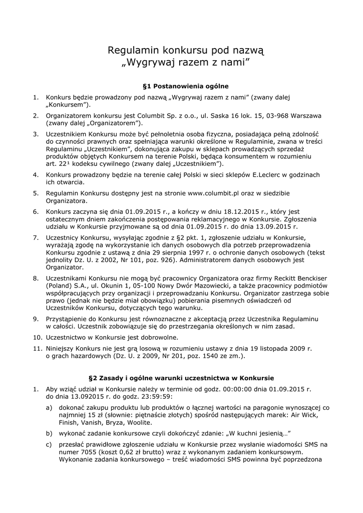 Regulamin konkursu pod nazwą „Wygrywaj razem z nami” §1 Postanowienia ogólne 1. Konkurs będzie prowadzony pod nazwą „Wygrywaj razem z nami” (zwany dalej „Konkursem”). 2. Organizatorem konkursu jest Columbit Sp. z o.o., ul. Saska 16 lok. 15, 03-968 Warszawa (zwany dalej „Organizatorem”). 3. Uczestnikiem Konkursu może być pełnoletnia osoba fizyczna, posiadająca pełną zdolność do czynności prawnych oraz spełniająca warunki określone w Regulaminie, zwana w treści Regulaminu „Uczestnikiem”, dokonująca zakupu w sklepach prowadzących sprzedaż produktów objętych Konkursem na terenie Polski, będąca konsumentem w rozumieniu art. 22¹ kodeksu cywilnego (zwany dalej „Uczestnikiem”). 4. Konkurs prowadzony będzie na terenie całej Polski w sieci sklepów E.Leclerc w godzinach ich otwarcia. 5. Regulamin Konkursu dostępny jest na stronie www.columbit.pl oraz w siedzibie Organizatora. 6. Konkurs zaczyna się dnia 01.09.2015 r., a kończy w dniu 18.12.2015 r., który jest ostatecznym dniem zakończenia postępowania reklamacyjnego w Konkursie. Zgłoszenia udziału w Konkursie przyjmowane są od dnia 01.09.2015 r. do dnia 13.09.2015 r. 7. Uczestnicy Konkursu, wysyłając zgodnie z §2 pkt. 1, zgłoszenie udziału w Konkursie, wyrażają zgodę na wykorzystanie ich danych osobowych dla potrzeb przeprowadzenia Konkursu zgodnie z ustawą z dnia 29 sierpnia 1997 r. o ochronie danych osobowych (tekst jednolity Dz. U. z 2002, Nr 101, poz. 926). Administratorem danych osobowych jest Organizator. 8. Uczestnikami Konkursu nie mogą być pracownicy Organizatora oraz firmy Reckitt Benckiser (Poland) S.A., ul. Okunin 1, 05-100 Nowy Dwór Mazowiecki, a także pracownicy podmiotów współpracujących przy organizacji i przeprowadzaniu Konkursu. Organizator zastrzega sobie prawo (jednak nie będzie miał obowiązku) pobierania pisemnych oświadczeń od Uczestników Konkursu, dotyczących tego warunku. 9. Przystąpienie do Konkursu jest równoznaczne z akceptacją przez Uczestnika Regulaminu w całości. Uczestnik zobowiązuje się do przestrzegania określonych w nim zasad. 10. Uczestnictwo w Konkursie jest dobrowolne. 11. Niniejszy Konkurs nie jest grą losową w rozumieniu ustawy z dnia 19 listopada 2009 r. o grach hazardowych (Dz. U. z 2009, Nr 201, poz. 1540 ze zm.). §2 Zasady i ogólne warunki uczestnictwa w Konkursie 1. Aby wziąć udział w Konkursie należy w terminie od godz. 00:00:00 dnia 01.09.2015 r. do dnia 13.092015 r. do godz. 23:59:59: a) dokonać zakupu produktu lub produktów o łącznej wartości na paragonie wynoszącej co najmniej 15 zł (słownie: piętnaście złotych) spośród następujących marek: Air Wick, Finish, Vanish, Bryza, Woolite. b) wykonać zadanie konkursowe czyli dokończyć zdanie: „W kuchni jesienią…” c) przesłać prawidłowe zgłoszenie udziału w Konkursie przez wysłanie wiadomości SMS na numer 7055 (koszt 0,62 zł brutto) wraz z wykonanym zadaniem konkursowym. Wykonanie zadania konkursowego – treść wiadomości SMS powinna być poprzedzona słowem „LECLERC” oraz numerem paragonu lub numerem systemowym. Przykład formatu treści wiadomości SMS: LECLERC.NUMER PARAGONU.TWOJA ODPOWIEDŹ. d) zachować oryginał dowodu zakupu produktów objętych Konkursem (paragon fiskalny lub faktura VAT) w celu potwierdzenia uprawnień do ewentualnej nagrody. 2. Przedmiotem konkursu jest wyłonienie najlepszych haseł nadesłanych przez Uczestników Konkursu. W ramach konkursu Organizator przewidział pięć nagród pierwszego stopnia oraz trzydzieści pięć nagród drugiego stopnia, które zostaną przyznane osobom, których wykonanie zadania konkursowego Komisja Konkursowa uzna za najlepsze spośród nadesłanych zgłoszeń. Kryterium przyznania nagrody będzie swobodną oceną Komisji Konkursowej przysłanych zgłoszeń konkursowych, pozwalającym uznać je za pomysłowe, oryginalne i nietuzinkowe. 3. Zgłoszenie udziału w Konkursie: a) Ilość znaków w zgłoszeniu przez formularz www oraz w wiadomości SMS nie może przekraczać 160. SMS należy przesłać na numer 7055. Koszt przesłania SMS wynosi 0,50 zł netto (0,62 zł z VAT) niezależnie od operatora. Opłata w wysokości 0,62 zł brutto zostanie pobrana niezależnie od tego, czy zgłoszenie udziału w Konkursie będzie prawidłowe. b) W Konkursie ważne są zgłoszenia wysyłane w wiadomości SMS z telefonu komórkowego działającego w sieci jednego z obecnych na polskim rynku operatorów telefonii komórkowej (T-Mobile, Orange, PLUS, PLAY). W szczególności nie będą uwzględniane SMS-y wysyłane za pomocą Internetu, stacjonarnych aparatów telefonicznych, w tym aparatów telefonicznych przeznaczonych do użytku publicznego. Prawidłowość zgłoszenia zostanie potwierdzona wiadomością zwrotną o treści: „Konkurs Wygrywaj razem z nami. Zgloszenie prawidlowe. Autorzy najlepszych hasel otrzymaja SMS. Zachowaj paragon. Regulamin: www.columbit.pl”. 4. Jednokrotne nabycie produktów objętych Konkursem upoważnia do dokonania tylko jednego zgłoszenia. Wielokrotny zakup produktów o wartości co najmniej 15 zł biorących udział w konkursie potwierdzony na jednym dowodzie zakupu nie uprawnia do kolejnych zgłoszeń. Jeden dowód zakupu to jedno zgłoszenie. Numer paragonu można zgłosić tylko raz, kolejne zgłoszenia z tym samym numerem nie będą brane pod uwagę. Zgłoszenie musi zostać dokonane po zakupie produktu. 5. Każdy Uczestnik może wziąć udział w Konkursie dowolną ilość razy, każdorazowo spełniając warunki określone w §2 pkt. 1 (dokonując kolejnego zakupu produktów objętych Konkursem). Organizator ma prawo wezwać Uczestnika, który przesłał więcej niż jedno zgłoszenie do Konkursu, do przesłania wszystkich zgłoszonych dowodów zakupu. Uczestnik, który nie będzie posiadał wszystkich zgłoszonych dowodów zakupu, zostanie wykluczony z Konkursu oraz utraci prawo do nagrody. 6. Jedno gospodarstwo domowe rozumiane jako jed