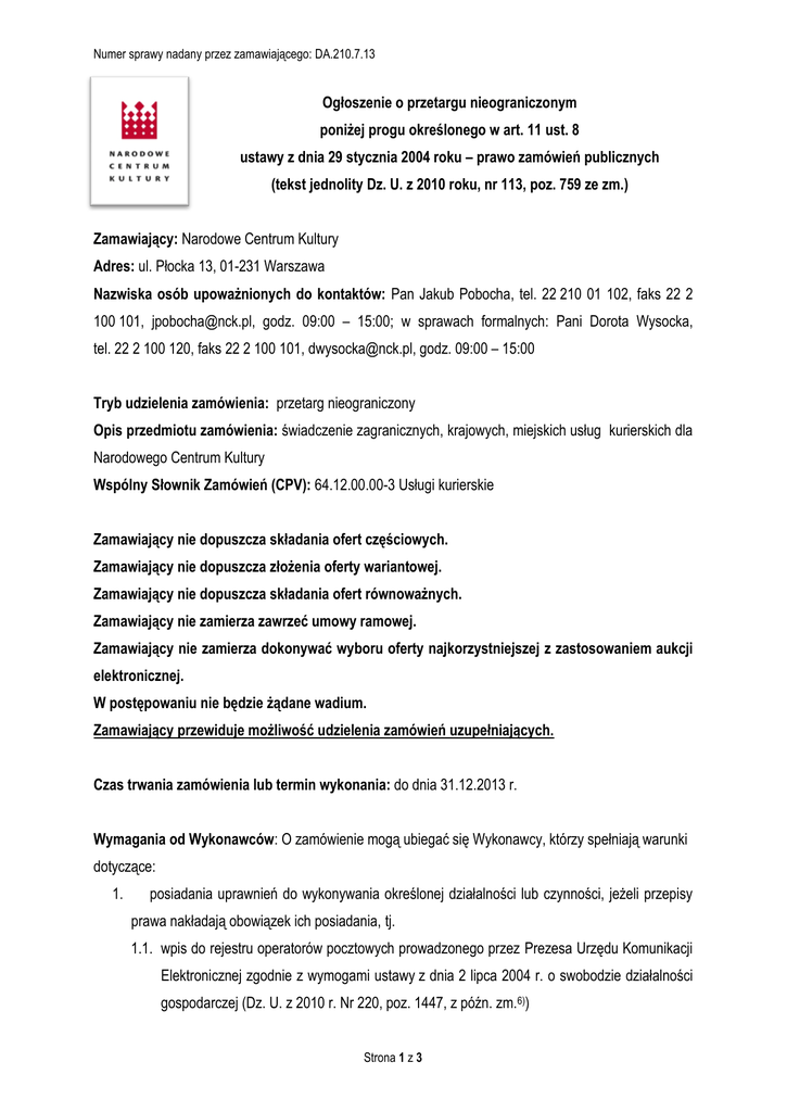 Numer sprawy nadany przez zamawiającego: DA.210.7.13 Ogłoszenie o przetargu nieograniczonym poniżej progu określonego w art. 11 ust. 8 ustawy z dnia 29 stycznia 2004 roku – prawo zamówień publicznych (tekst jednolity Dz. U. z 2010 roku, nr 113, poz. 759 ze zm.) Zamawiający: Narodowe Centrum Kultury Adres: ul. Płocka 13, 01-231 Warszawa Nazwiska osób upoważnionych do kontaktów: Pan Jakub Pobocha, tel. 22 210 01 102, faks 22 2 100 101, [email protected], godz. 09:00 – 15:00; w sprawach formalnych: Pani Dorota Wysocka, tel. 22 2 100 120, faks 22 2 100 101, [email protected], godz. 09:00 – 15:00 Tryb udzielenia zamówienia: przetarg nieograniczony Opis przedmiotu zamówienia: świadczenie zagranicznych, krajowych, miejskich usług kurierskich dla Narodowego Centrum Kultury Wspólny Słownik Zamówień (CPV): 64.12.00.00-3 Usługi kurierskie Zamawiający nie dopuszcza składania ofert częściowych. Zamawiający nie dopuszcza złożenia oferty wariantowej. Zamawiający nie dopuszcza składania ofert równoważnych. Zamawiający nie zamierza zawrzeć umowy ramowej. Zamawiający nie zamierza dokonywać wyboru oferty najkorzystniejszej z zastosowaniem aukcji elektronicznej. W postępowaniu nie będzie żądane wadium. Zamawiający przewiduje możliwość udzielenia zamówień uzupełniających. Czas trwania zamówienia lub termin wykonania: do dnia 31.12.2013 r. Wymagania od Wykonawców: O zamówienie mogą ubiegać się Wykonawcy, którzy spełniają warunki dotyczące: 1. posiadania uprawnień do wykonywania określonej działalności lub czynności, jeżeli przepisy prawa nakładają obowiązek ich posiadania, tj. 1.1. wpis do rejestru operatorów pocztowych prowadzonego przez Prezesa Urzędu Komunikacji Elektronicznej zgodnie z wymogami ustawy z dnia 2 lipca 2004 r. o swobodzie działalności gospodarczej (Dz. U. z 2010 r. Nr 220, poz. 1447, z późn. zm.6)) Strona 1 z 3 Numer sprawy nadany przez zamawiającego: DA.210.7.13 2. posiadania wiedzy i doświadczenia niezbędnych do realizacji przedmiotu zamówienia, tj. 2.1. wykonanie lub wykonywanie co najmniej 3 usług polegających na świadczeniu zagranicznych, krajowych i miejskich usług kurierskich, odpowiadających swoim zakresem przedmiotowi zamówienia na kwotę co najmniej 60.000,00 zł netto każda w okresie 12 miesięcy i trwające co najmniej 12 miesięcy każda, w okresie ostatnich 3 lat przed upływem terminu składania ofert, a jeżeli okres prowadzenia działalności jest krótszy - w tym okresie. z podaniem ich wartości, dat wykonania oraz odbiorców z załączeniem dokumentów potwierdzających, że prace te zostały wykonane należycie 3. dysponowania odpowiednim potencjałem technicznym oraz osobami zdolnymi do wykonania zamówienia, 4. sytuacji ekonomicznej i finansowej umożliwiającej wykonanie przedmiotu zamówienia, 5. nie podlegania wykluczeniu z postępowania na podstawie art. 24 ust. 1 upzp. Opis sposobu dokonania oceny spełniania warunków udziału w postępowaniu Ocena spełniania warunków udziału w postępowaniu zostanie dokonana na podstawie dokumentów złożonych przez Wykonawcę oraz Oświadczenia stanowiącego załącznik nr 2 do Specyfikacji Istotnych Warunków Zamówienia. Ocena spełniania warunków udziału w postępowaniu zostanie dokonana metodą: spełnia – nie spełnia. Kryteria oceny ofert: Kryterium Znaczenie w % Cena brutto za przesyłkę krajową do 0,50 kg 60 Cena brutto za przesyłkę krajową od 3,00 do 5,00 kg 20 Cena brutto za przesyłkę miejską do 0,50 kg 10 Cena brutto za przesyłkę zagraniczną od 10,00 do 20,00 kg 10 RAZEM 100 Termin i miejsce składania ofert: do dnia 31.01.2013 r. do godziny 11:00, Narodowe Centrum Kultury, ul. Płocka 13, 01–231 Warszawa, recepcja. Termin związania z ofertą: 30 dni licząc od upływu terminu składania ofert. Strona 2 z 3 Numer sprawy nadany przez zamawiającego: DA.210.7.13 Określenie sposobu uzyskania specyfikacji istotnych warunków zamówienia oraz adres strony internetowej, na której została zamieszczona Specyfikacja Istotnych Warunków Zamówienia: Specyfikacja istotnych warunków zamówienia jest dostępna w siedzibie Zamawiającego w Narodowym Centrum Kultury Specyfikacja Istotnych Warunków Zamówienia została zamieszczona na stronie internetowej Zamawiającego www.nck.pl Data wywieszenia: 23.01.2013 r. Edward Chudzik Zastępca Dyrektora Narodowego Centrum Kultury Strona 3 z 3