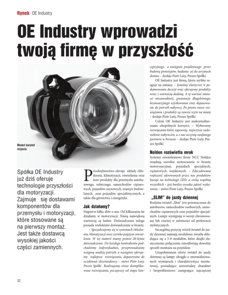 Rynek OE Industry OE Industry wprowadzi twoją firmę w przyszłość cepcyjnego, a następnie projektowego przez budowę prototypów, badania aż do seryjnych dostaw – dodaje Piotr Luty, Prezes Spółki. OE Industry jest firmą, która szybko reaguje na zmiany. – Jesteśmy elastyczni w podejmowaniu decyzji oraz oferujemy produkty wraz z wartością dodaną. A tę wartość stanowi niezawodność, gwarancja długoletniego, bezawaryjnego użytkowania oraz dopasowanie do potrzeb nabywcy. Po prostu nasze rozwiązania i produkty są zawsze szyte na miarę – dodaje Piotr Luty, Prezes Spółki Celem OE Industry jest maksymalizowanie obopólnych korzyści. – Wybieramy rozwiązania które zapewnią najwyższe zadowolenie nabywców, a z nas uczynią zaufanego partnera w biznesie – dodaje Piotr Luty, Prezes Spółki Moduł świateł mijania Spółka OE Industry już dziś oferuje technologie przyszłości dla motoryzacji. Zajmuje się dostawami komponentów dla przemysłu i motoryzacji, które stosowane są na pierwszy montaż. Jest także dostawcą wysokiej jakości części zamiennych. 32 Nolden rozświetla mrok P rzedsiębiorstwo oferuje układy chłodzenia, klimatyzacji, oświetlenia oraz inne produkty dla przemysłu autobusowego, rolniczego, samochodów ciężarowych, pojazdów szynowych, maszyn budowlanych oraz pojazdów specjalistycznych, a także dla górnictwa i energetyki. Jak działamy? Najpierw kilka słów o nas. Od kilkunastu lat działamy w motoryzacji. Naszą największą wartością są ludzie. Doświadczona załoga posiada wieloletnie doświadczenie w branży. – Specjalizujemy się w systemach chłodzenia, klimatyzacji oraz szeroko pojętym oświetleniu. W tej materii mamy prawie 20-letnie doświadczenie. Do każdego kontrahenta podchodzimy indywidualnie, przeprowadzamy wstępną analizę potrzeb, a następnie oferujemy najlepsze rozwiązanie, dopasowane do oczekiwań zleceniodawcy – mówi Piotr Luty, Prezes Spółki Realizujemy różne skomplikowane rozwiązania, począwszy od etapu kon- Systemy oświetleniowe firmy NCC Nolden znajdują szerokie zastosowanie w branży motoryzacyjnej, pojazdach specjalnych, ciężarowych, wojskowych. – Zdecydowana większość oferowanych przez nas produktów bazuje na technologii LED, a cechą wspólną wszystkich – jest bardzo wysoka jakość wykonania – mówi Piotr Luty, Prezes Spółki „SLIM” do jazdy dziennej Rodzina świateł „Slim” jest przeznaczona do autobusów, samochodów osobowych, samochodów ciężarowych oraz pojazdów specjalnych. Lampy występują w wersji chromowanej lub czarnej w zależności od preferencji stylistycznych. Szczególną pozycję wśród świateł do jazdy dziennej zajmują modułowe światła składające się z 5-8 modułów, które dzięki elastycznemu połączeniu umożliwiają dowolny sposób montażu na pojeździe. Uzupełnieniem oferty świateł do jazdy dziennej są lampy okrągłe o znormalizowanych wymiarach i charakterystyce montażowej, posiadające uniwersalny charakter i bezproblemowo zastępujące najczęściej stosowane rozwiązania żarówkowe. Występują one w rozmiarach 70 mm oraz 90 mm, również w wersji dwufunkcyjnej – światła do jazdy dziennej plus światło pozycyjne. Grupą flagowych produktów jest rodzina modułów przednich ledowych i Bi-ledowych, wykonanych w technologii LED. Wśród prezentowanych modułów dwa zasługują na szczególną uwagę. Są to 90 mm Bi-ledowe moduły zawierające światła mijania oraz światła drogowe oraz 7-calowy, również Biledowy, moduł przedni z światłem pozycyjnym. Prezentowane moduły posiadają również swoje odpowiedniki w technologii halogenowej. Kolejną grupą produktów są lampy przeciwmgielne. Dostępne są w rozmiarach 70 mm oraz 90 mm, w wersji frontowej oraz rogowej, chromowanej oraz czarnej, w technologii LED oraz halogenowej. Uzupełnieniem oferty są kierunkowskazy dostępne w wersjach typu „SLIM” zarówno modułowej, jak i pojedynczej oraz w postaci okrągłej lampy w rozmiarze 70 mm o uniwersalnym charakterze. Produktem dedykowanym do zastosowań wojskowych jest silny emiter podczerwieni wykonany w oparciu o mocne diody LED. Emiter umożliwia oświetlenie terenu nocą światłem podczerwonym, niewidzialnym dla oka ludzkiego, ale doskonale widzialnym na obrazie z kamer, umożliwiając tym samym obserwację terenu w całkowitych ciemnościach bez zdradzania pozycji obserwującego pojazdu. – Integracja dodatkowych reflektorów i świateł w pojeździe musi być zrealizowana w sposób harmonijny i technicznie profesjonalny. Podstawowym priorytetem jest zgodność z wymogami prawnymi, które są wyraźnie określone w ECE. Obejmuje to poprawną instalację świateł dziennych i ich pokrywy, obwodu elektrycznego, kontroli wskaźnika awarii i diagnostyki oraz monitoring reflektorów i lamp, jak również spełnienie wymagań w zakresie ochrony przechodniów, które opracowujemy we współpracy z niemieckim TUV – dodaje Piotr Luty, Prezes Spółki energii elektrycznej. Obserwowany w ostatnich latach postęp w dziedzinie konstrukcji akumulatorów elektrochemicznych spowodował, że hybrydowe systemy napędowe stały się coraz bardziej powszechne i dostępne dla pojazdów reprezentujących segment rynku motoryzacyjnego, który do niedawna nie posiadał alternatywy dla napędów czysto spalinowych. Mimo niewątpliwego postępu technologicznego nie wyeliminowano – jak dotąd – podstawowej wady akumulatorów elektrochemicznych jaką jest ich ograniczona trwałość. Żywotność obecnie stosowanych akumulatorów jest zdecydowanie poniżej okresu eksploatacji pojazdu. Skutecznym rozwiązaniem wydłużającym trwałość akumulatorów jest zapewnienie im odpowiedniej temperatury pracy. Mieści się ona w przedziale 15 – 35 st. C. Poniżej tego zakresu pojemność akumulatorów gwałtownie maleje, a powyżej znaczącemu skróceniu ulega ich żywotność. Tymczasem temperatura otoczenia, niezależ