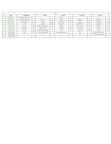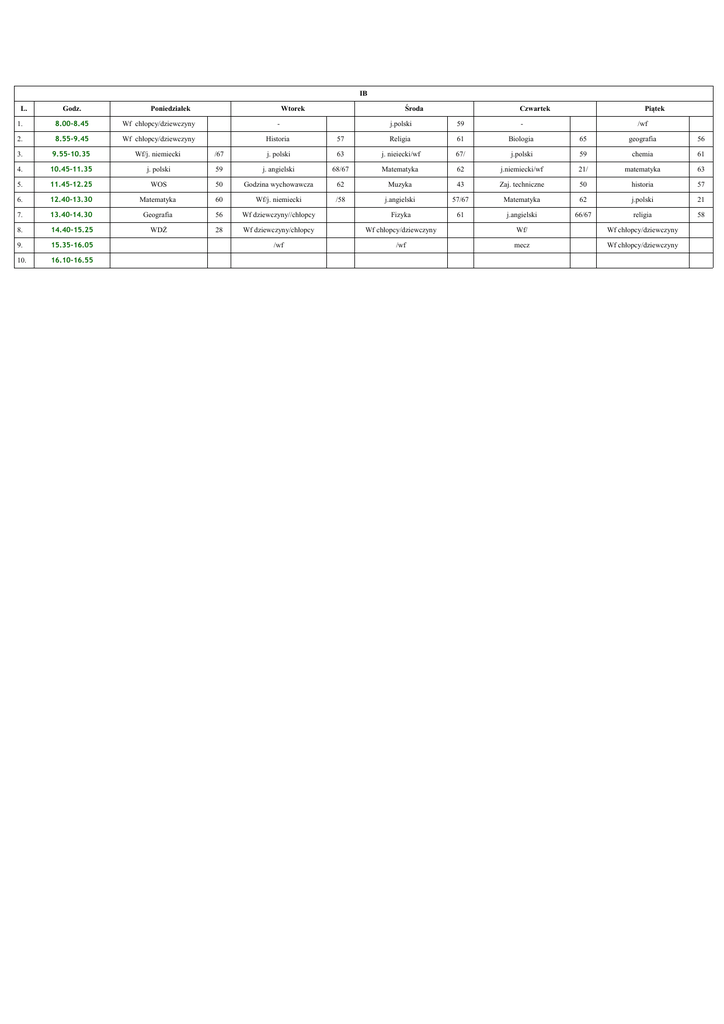 IB L. Godz. Poniedziałek Wtorek Środa 8.00-8.45 Wf chłopcy/dziewczyny 2. 8.55-9.45 Wf chłopcy/dziewczyny Historia 57 3. 9.55-10.35 Wf/j. niemiecki /67 j. polski 63 4. 10.45-11.35 j. polski 59 j. angielski 68/67 5. 11.45-12.25 WOS 50 Godzina wychowawcza 6. 12.40-13.30 Matematyka 60 Wf/j. niemiecki 7. 13.40-14.30 Geografia 56 8. 14.40-15.25 WDŻ 28 9. 15.35-16.05 10. 16.10-16.55 1. - j.polski Czwartek Piątek 59 - /wf Religia 61 Biologia 65 geografia 56 j. nieiecki/wf 67/ j.polski 59 chemia 61 Matematyka 62 j.niemiecki/wf 21/ matematyka 63 62 Muzyka 43 Zaj. techniczne 50 historia 57 /58 j.angielski 57/67 Matematyka 62 j.polski 21 Wf dziewczyny//chłopcy Fizyka 61 j.angielski 66/67 religia 58 Wf dziewczyny/chłopcy Wf chłopcy/dziewczyny Wf/ Wf chłopcy/dziewczyny /wf /wf mecz Wf chłopcy/dziewczyny