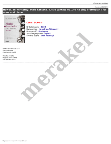 Informacje o produkcie Utworzono 08-03-2017 Hawel Jan Wincenty: Mała kantata / Little cantate op.146 na obój i fortepian / for oboe and piano Cena : 34,00 zł el Nr katalogowy : 1223 Kompozytor : Hawel Jan Wincenty Dostępność : Dostępny Stan magazynowy : wysoki Średnia ocena : brak recenzji m Okładka: miękka Objętość stron: 16+8 Rok wydania: 2012 er ak ISMN 979-0-801531-22-3 Partytura i głos Czas trwania: ca 10 Wygenerowano w programie www.oscGold.com