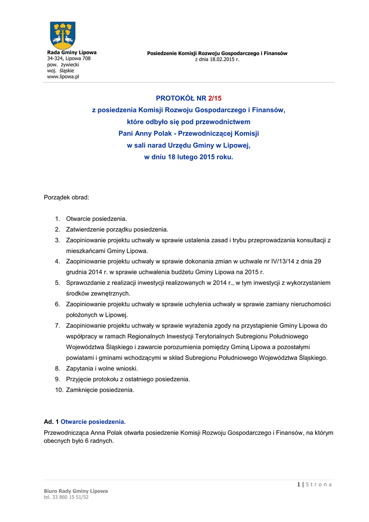 Rada Gminy Lipowa 34-324, Lipowa 708 pow. żywiecki woj. śląskie www.lipowa.pl Posiedzenie Komisji Rozwoju Gospodarczego i Finansów z dnia 18.02.2015 r. PROTOKÓŁ NR 2/15 z posiedzenia Komisji Rozwoju Gospodarczego i Finansów, które odbyło się pod przewodnictwem Pani Anny Polak - Przewodniczącej Komisji w sali narad Urzędu Gminy w Lipowej, w dniu 18 lutego 2015 roku. Porządek obrad: 1. Otwarcie posiedzenia. 2. Zatwierdzenie porządku posiedzenia. 3. Zaopiniowanie projektu uchwały w sprawie ustalenia zasad i trybu przeprowadzania konsultacji z mieszkańcami Gminy Lipowa. 4. Zaopiniowanie projektu uchwały w sprawie dokonania zmian w uchwale nr IV/13/14 z dnia 29 grudnia 2014 r. w sprawie uchwalenia budżetu Gminy Lipowa na 2015 r. 5. Sprawozdanie z realizacji inwestycji realizowanych w 2014 r., w tym inwestycji z wykorzystaniem środków zewnętrznych. 6. Zaopiniowanie projektu uchwały w sprawie uchylenia uchwały w sprawie zamiany nieruchomości położonych w Lipowej. 7. Zaopiniowanie projektu uchwały w sprawie wyrażenia zgody na przystąpienie Gminy Lipowa do współpracy w ramach Regionalnych Inwestycji Terytorialnych Subregionu Południowego Województwa Śląskiego i zawarcie porozumienia pomiędzy Gminą Lipowa a pozostałymi powiatami i gminami wchodzącymi w skład Subregionu Południowego Województwa Śląskiego. 8. Zapytania i wolne wnioski. 9. Przyjęcie protokołu z ostatniego posiedzenia. 10. Zamknięcie posiedzenia. Ad. 1 Otwarcie posiedzenia. Przewodnicząca Anna Polak otwarła posiedzenie Komisji Rozwoju Gospodarczego i Finansów, na którym obecnych było 6 radnych. 1|S t r o n a Biuro Rady Gminy Lipowa tel. 33 860 15 51/52 Rada Gminy Lipowa 34-324, Lipowa 708 pow. żywiecki woj. śląskie www.lipowa.pl Posiedzenie Komisji Rozwoju Gospodarczego i Finansów z dnia 18.02.2015 r. Ad. 2 Zatwierdzenie porządku posiedzenia. Przewodnicząca Anna Polak odczytała porządek posiedzenia, a następnie poddała go do głosowanie w wyniku którego przyjęto go jednogłośnie. Ad. 3 Zaopiniowanie projektu uchwały w sprawie ustalenia zasad i trybu przeprowadzania konsultacji z mieszkańcami Gminy Lipowa. Adrian Jagosz Kierownik Referatu Organizacyjnego wyjaśnił, że projekt uchwały został przygotowany w związku z planowanym wprowadzeniem nazewnictwa ulic i koniecznością jego konsultacji z mieszkańcami. Kwestia konsultacji może również zostać zawarta w statucie gminy, ale ten wejdzie w życie prawdopodobnie za ok. 2 miesiące. Wójt zarządza konsultacje w oparciu o wytyczne zawarte w uchwale. Radny Mirosław Piotrowski wnioskował o zmianę ilości radnych, uprawionych do złożenia wniosku o przeprowadzenie konsultacji z co najmniej 5 do co najmniej 3 osób. Wniosek radnego został poddany pod głosowanie, w wyniku którego odrzucono go stosunkiem głosów: 2 za, 4 przeciw. Radny Mirosław Piotrowski zapytał czy rada może mieć wpływ na to czy konsultacje się odbędą? Pan Adrian Jagosz wyjaśnił, że kompetencje rady dotyczą tylko zasad i trybu przeprowadzania konsultacji, decyzję o przeprowadzeniu konsultacji podejmuje wójt. Radny Mirosław Piotrowski powiedział, że w takim razie trzeba zastanowić się nad tą uchwałą, skoro rada nie ma wpływu na przeprowadzenie konsultacji. Pan Adrian Jagosz wyjaśnił, że radni mogą złożyć wiosek o przeprowadzenie konsultacji, ale ostateczna decyzje o ich przeprowadzeniu podejmuje wójt. Przewodnicząca Anna Polak zapytała czy wnioski o przeprowadzenie konsultacji mogę być weryfikowane przez radę? Pan Adrian Jagosz odpowiedział, że rada nie ma do tego kompetencji. Projekt uchwały został poddany pod głosowanie, w wyniku którego zaopiniowano go pozytywnie stosunkiem głosów, 5 za, 1 radny wstrzymał się od głosu. Ad. 4 Zaopiniowanie projektu uchwały w sprawie dokonania zmian w uchwale nr IV/13/14 z dnia 29 grudnia 2014 r. w sprawie uchwalenia budżetu Gminy Lipowa na 2015 r. Skarbnik Krystyna Piecuch wyjaśniła, że zmiany dotyczą wydatków bieżących w dziale 851 Ochrona zdrowia i zwiększenia środków o 4 tys. zł Radna Grażyna Urbaś zapytała czy będzie to miało wpływ na ujemne konto GOPS. Skarbnik odpowiedziała, że wspieranie rodziny to nowe zadanie gminy. Projekt uchwały został poddany pod głosowanie, w wyniku którego komisja jednogłośnie zaakceptowała go pozytywnie. Ad. 5 Sprawozdanie z realizacji inwestycji realizowanych w 2014 r., w tym inwestycji z wykorzystaniem środków zewnętrznych. Katarzyna Biegun Kierownik Referatu Infrastruktury przedstawiła inwestycje realizowane w 2014 r. Przewodniczący Rady Andrzej Binda zapytał czy zapłacono już całą kwotę za remont drogi zimnej w Siennej? Pani Katarzyna Biegun odpowiedziała, że nie zapłacono jeszcze całej kwoty, ponieważ w 2|S t r o n a Biuro Rady Gminy Lipowa tel. 33 860 15 51/52 Rada Gminy Lipowa 34-324, Lipowa 708 pow. żywiecki woj. śląskie www.lipowa.pl Posiedzenie Komisji Rozwoju Gospodarczego i Finansów z dnia 18.02.2015 r. kwietniu będą miały miejsce odbiory końcowe tej inwestycji i dopiero w tym czasie, po przeglądzie zimowym pozostała kwota (ok. 72 tys. zł) zostanie zapłacona wykonawcy. Przewodniczący zapytał również o remont drogi do Jury w Leśnej, która nie została wykonana w całości. Pani Katarzyna Biegun wyjaśniła, że remont został sfinansowany ze środków funduszu sołeckiego w wysokości 25 000,00 zł z budżetu gminy 15 000,00 zł Przewodniczący zauważył, że skoro przy drodze mieszka określona liczba osób, to do wszystkich powinna być zrobiona droga. Poza tym nawet jeżeli nie ma pieniędzy w danym roku, to inwestycję powinno podzielić się na dwa etapy i dokończyć ją w roku następnym. Radna Grażyna Urbaś powiedziała, że dalsze prace remontowe na tej drodze mogą zależeć od tego jak zostanie uchwalony fundusz sołecki. Przewodniczący odpowiedział, że fundusz był podzielony przed realizacją inwestycji i był przeznaczony na inny cel. Pan
