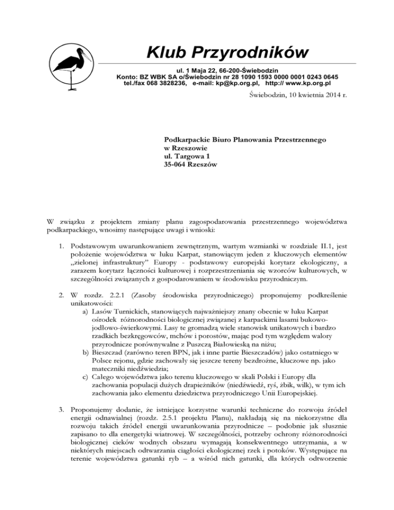 Klub Przyrodników ul. 1 Maja 22, 66-200-Świebodzin Konto: BZ WBK SA o/Świebodzin nr 28 1090 1593 0000 0001 0243 0645 tel./fax 068 3828236, e-mail: [email protected], http:// www.kp.org.pl Świebodzin, 10 kwietnia 2014 r. Podkarpackie Biuro Planowania Przestrzennego w Rzeszowie ul. Targowa 1 35-064 Rzeszów W związku z projektem zmiany planu zagospodarowania przestrzennego województwa podkarpackiego, wnosimy następujące uwagi i wnioski: 1. Podstawowym uwarunkowaniem zewnętrznym, wartym wzmianki w rozdziale II.1, jest położenie województwa w łuku Karpat, stanowiącym jeden z kluczowych elementów „zielonej infrastruktury” Europy - podstawowy europejski korytarz ekologiczny, a zarazem korytarz łączności kulturowej i rozprzestrzeniania się wzorców kulturowych, w szczególności związanych z gospodarowaniem w środowisku przyrodniczym. 2. W rozdz. 2.2.1 (Zasoby środowiska przyrodniczego) proponujemy podkreślenie unikatowości: a) Lasów Turnickich, stanowiących najważniejszy znany obecnie w łuku Karpat ośrodek różnorodności biologicznej związanej z karpackimi lasami bukowojodłowo-świerkowymi. Lasy te gromadzą wiele stanowisk unikatowych i bardzo rzadkich bezkręgowców, mchów i porostów, mając pod tym względem walory przyrodnicze porównywalne z Puszczą Białowieską na niżu; b) Bieszczad (zarówno teren BPN, jak i inne partie Bieszczadów) jako ostatniego w Polsce rejonu, gdzie zachowały się jeszcze tereny bezdrożne, kluczowe np. jako mateczniki niedźwiedzia; c) Całego województwa jako terenu kluczowego w skali Polski i Europy dla zachowania populacji dużych drapieżników (niedźwiedź, ryś, żbik, wilk), w tym ich zachowania jako elementu dziedzictwa przyrodniczego Unii Europejskiej. 3. Proponujemy dodanie, że istniejące korzystne warunki techniczne do rozwoju źródeł energii odnawialnej (rozdz. 2.5.1 projektu Planu), nakładają się na niekorzystne dla rozwoju takich źródeł energii uwarunkowania przyrodnicze – podobnie jak słusznie zapisano to dla energetyki wiatrowej. W szczególności, potrzeby ochrony różnorodności biologicznej cieków wodnych obszaru wymagają konsekwentnego utrzymania, a w niektórych miejscach odtwarzania ciągłości ekologicznej rzek i potoków. Występujące na terenie województwa gatunki ryb – a wśród nich gatunki, dla których odtworzenie właściwego stanu ochrony jest europejskim celem ochrony środowiska, wynikającym z dyrektywy siedliskowej UE – odbywają, w ramach swojego cyklu życiowego, niezbędne krótkodystansowe migracje w ciekach, dlatego ciągłość ekologiczna cieków jest konieczna dla zachowania tych gatunków. Stwarza to istotne ograniczenie dla rozwoju małej energetyki wodnej, związanej z przegradzaniem cieków. Pomimo dobrych warunków solarnych, rozwój energetyki solarnej w województwie podkarpackim ogranicza mała podaż terenów małocennych przyrodniczo, które bez szkody dla środowiska i przyrody mogłyby być zajęte przez wielkopowierzchniowe instalacje fotowoltaiczne. Ograniczenie to nie dotyczy oczywiście indywidualnej rozproszonej energetyki solarnej. Proponujemy, ze względów opisanych powyżej, wykreślić zalecenie rozwoju energetyki odnawialnej (dotyczy elektrowni wodnych, elektrowni wiatrowych oraz wielkopowierzchniowych farm fotowoltaicznych) na obszarach objętych różnego rodzaju formami ochrony przyrody. 4. Proponujemy przeredagowanie akapitu dotyczącego ryzyka powodziowego w rozdz. 2.5.2. W naszej ocenie, głównym powodem wysokiego ryzyka powodziowego jest nieprzemyślane zagospodarowanie przestrzenne, a nie tylko zlokalizowanie zabudowy mieszkaniowej i elementów infrastrukturalnych w obrębie obszarów potencjalnie zalewanych przez rzeki. Rola zbiorników retencyjnych i wałów w poprawie bezpieczeństwa powodziowego jest przeceniana. Odnośnie "trzech dużych zbiorników retencyjnych" wskazanych na terenie województwa przez "program ochrony przed powodzią w dorzeczu Górnej Wisły", proponujemy dodać informację, że wszystkie one są wysoce konfliktowe środowiskowo, w szczególności znajdują się w konflikcie z ochroną obszarów Natura 2000. Informacja ta jest ważnym uwarunkowaniem, ponieważ jest istotna dla oceny szans realizacji tych zbiorników. 5. Proponujemy przeredagowanie elementów wizji województwa (Rozdz. III): „Na całym obszarze województwa zostanie zapewniona prawidłowa gospodarka wodno-ściekowa. Ograniczone zostanie ryzyko powodziowe, dzięki nowoczesnemu zarządzaniu nim, obejmującego właściwe zagospodarowanie przestrzenne dolin rzecznych, ograniczanie skutków powodzi, a w razie potrzeby budowę urządzeń przeciwpowodziowych”. „Zachowane zostaną walory środowiska przyrodniczego i krajobrazu, ze szczególnym uwzględnieniem elementów i cech specyficznych dla województwa”. 6. W miejsce sformułowania „ograniczanie zagrożenia powodziowego” proponujemy używać sformułowania „zarządzanie ryzykiem powodziowym”, zgodnie ze współczesnym stanem prawnym, zarówno w zakresie dyrektywy powodziowej UE, jak i z prawem polskim. Ograniczanie zagrożenia powodziowego jest tylko jednym z możliwych - i nie w każdym miejscu właściwym - sposobów ograniczania ryzyka powodziowego. 7. Na str. 78: zasady gospodarowania zasobami wodnymi powinny ułatwiać migrację ryb, nie tylko dwuśrodowiskowych. Także ryby rzeczne muszą, dla zrealizowania swojego cyklu życiowego, odbywać zwykle wędrówki między różnymi siedliskami w rzekach, a ponadto możliwości ich migracji są ważne dla ochrony zasobów genowych ich populacji. 8. W systemie ochrony przyrody należy ująć konieczność utworzenia specjalnego obszaru ochrony siedlisk Natura 2000 Enklawy Puszczy Sandomierskiej (decyzja o jego zgłoszeniu do Komisji Europejskiej została już podjęta przez Radę Ministrów 28 stycznia 2014 r.). Należy także wskazać potrzebę i możliwość wyznaczenia dodatkowych obszarów specjalnej ochrony ptaków 