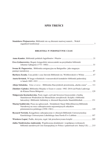 SPIS TREŚCI Stanisława Wojnarowicz, Biblioteki nie są zbiorami martwej materii... Wokół zagadnień konferencji ..................................................................................................... 7 BIBLIOTEKA W PERSPEKTYWIE CZASU Anna Kamler, Biblioteki polskich Jagiellonów i Wazów .......................................................... 21 Ewa Lichnerowicz, Bogaty księgozbiór mieszczański na przykładzie biblioteki Johanna Uphagena (1731–1802) .................................................................................. 33 Iwona H. Pugacewicz, Biblioteka emigracyjna na Batignolles jako magazyn pamięci narodowej ...................................................................................................................... 47 Barbara Zezula, Czas polski i czas litewski Biblioteki im. Wróblewskich w Wilnie ............... 67 Aneta Kwiatek, W kręgu wileńskich i warszawskich kontaktów biblioteki puławskiej w latach 1805–1831 ...................................................................................................... 93 Alicja Sobańska, Vetus et nova – Biblioteka Raczyńskich przestrzenią „ducha czasu” ........ 111 Zdzisław Gębołyś, Biblioteka Miejska w Essen w czasie: 1902–2014 (od Paula Ladewiga do Klausa Petera Böttgera) ......................................................................................... 129 Małgorzata Kostuchowska, Pusty regał, czyli jak Seweryn Goszczyński z hrabią Stanisławem Wodzickim do Monachium zawędrowali. Książki z biblioteki łańcuckiej i Biblioteki Julińskiej w zbiorach Bayerische Staatsbibliothek ................ 151 Maciej Szablewski, Praca na zgliszczach. Działalność Stacji Mikrofilmowej Biblioteki Narodowej na rzecz zabezpieczenia najcenniejszych zabytków piśmiennictwa polskiego (1950–1961) ....................................................................... 169 Ryszard Nowicki, Księgobiory zabezpieczone w zbiorach Biblioteki Uniwersyteckiej Katolickiego Uniwersytetu Lubelskiego Jana Pawła II w Lublinie ........................... 187 Wiesława Łapuć, Pudło, skrzynia, regał. Jak przechowywano książki ................................... 205 Julita Niedźwiecka-Ambroziak, Współczesna działalność i współpraca wybranych bibliotek narodowych Unii Europejskiej (w Polsce i państwach tzw. Starej UE) ...... 215 6 SPIS TREŚCI Katarzyna Bikowska, Pora na inspiracje? Forum Młodych Bibliotekarzy jako bodziec do działań (opinie po 8. FMB w Olsztynie) ............................................................... 225 BIBLIOTEKA OBSZAREM PAMIĘCI Tomasz Stolarczyk, Czas w staropolskich bibliotekach klasztorów dominikańskich............... 239 Monika Sulejewicz-Nowicka, Czas zamknięty w bibliotece Ignacego Krasickiego (inwentarz z 1810 roku) .............................................................................................. 253 Piotr Lewkowicz, Użytkowanie książki jako uruchomienie wahadła jej pamięci – wybrane przykłady wypożyczeń starych druków Biblioteki Uniwersytetu Łódzkiego ............................................................................................ 271 Agata Rybińska, Biblioteka a „świat, którego już nie ma” ..................................................... 285 Gabriela Meinardi, Biblioteka na miarę człowieka – świat wizji i rzeczywistości – Borges, Eco, Dominguez, Debroux ............................................................................ 295