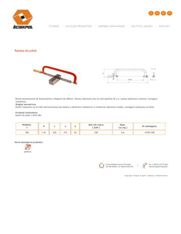 O FIRMIE KATALOG PRODUKTÓW OBRÓBKA SKRAWANIEM POLITYKA JAKOŚCI KONTAKT Ramka do piłek Ramki przeznaczone do brzeszczotów o długości do 300mm. Ramka wykonana jest ze stali płaskiej 20 x 6, rączka wykonana z drewna, naciągacz motylkowy. Wygląd zewnętrzny: Ramki malowane są na kolor pomarańczowy lub zielony z odcieniem niebieskim w strukturze uderzenia młotka, naciągacz cynkowany na biało. Przykład zamówienia: Ramki do piłek 11030-300 Wielkość S H L a A Max siła cięcia [ daN ] Masa Ca [ kg ] Nr katalogowy 300 110 520 312 30 100 0,6 11030-300 Karta katalogowa produktu: pobierz Firma Wielobranżowa Ściskpol 64-420 Kwilcz, ul. Miostowska 26 tel. (+48 61) 29-15-063 [email protected] Copyr ight: Ściskpol. Pr ojekt i r ealizacja: PodisPr omotion