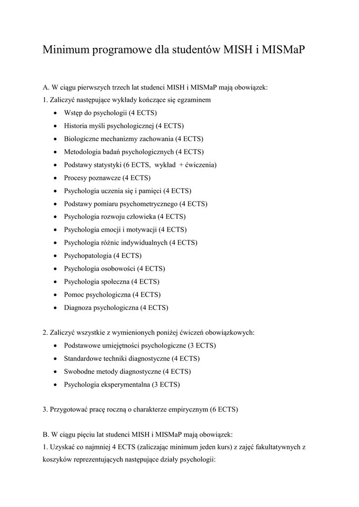 Minimum programowe dla studentów MISH i MISMaP A. W ciągu pierwszych trzech lat studenci MISH i MISMaP mają obowiązek: 1. Zaliczyć następujące wykłady kończące się egzaminem Wstęp do psychologii (4 ECTS) Historia myśli psychologicznej (4 ECTS) Biologiczne mechanizmy zachowania (4 ECTS) Metodologia badań psychologicznych (4 ECTS) Podstawy statystyki (6 ECTS, wykład + ćwiczenia) Procesy poznawcze (4 ECTS) Psychologia uczenia się i pamięci (4 ECTS) Podstawy pomiaru psychometrycznego (4 ECTS) Psychologia rozwoju człowieka (4 ECTS) Psychologia emocji i motywacji (4 ECTS) Psychologia różnic indywidualnych (4 ECTS) Psychopatologia (4 ECTS) Psychologia osobowości (4 ECTS) Psychologia społeczna (4 ECTS) Pomoc psychologiczna (4 ECTS) Diagnoza psychologiczna (4 ECTS) 2. Zaliczyć wszystkie z wymienionych poniżej ćwiczeń obowiązkowych: Podstawowe umiejętności psychologiczne (3 ECTS) Standardowe techniki diagnostyczne (4 ECTS) Swobodne metody diagnostyczne (4 ECTS) Psychologia eksperymentalna (3 ECTS) 3. Przygotować pracę roczną o charakterze empirycznym (6 ECTS) B. W ciągu pięciu lat studenci MISH i MISMaP mają obowiązek: 1. Uzyskać co najmniej 4 ECTS (zaliczając minimum jeden kurs) z zajęć fakultatywnych z koszyków reprezentujących następujące działy psychologii: • psychologia kliniczna • psychologia poznawcza • biologiczne podstawy zachowania • psychologia osobowości, emocji i motywacji oraz różnic indywidualnych • psychologia wychowawcza i rozwoju • psychologia społeczna • metodologia, statystyka i psychometria • zajęcia interdyscyplinarne C. Na IV i V roku studenci MISH i MISMaP mają obowiązek: 1. Zaliczyć egzamin z wykładu Etyka zawodu psychologa (4 ECTS) 2. Zrealizować seminarium magisterskie (20 ECTS). Promotorem pracy magisterskiej powinien być pracownik naukowy Wydziału Psychologii. 3. Zrealizować zajęcia z wybranej specjalizacji psychologicznej (48 ECTS): Neuropsychologia kliniczna Psychologia kliniczna dziecka Psychologia organizacji i pracy Psychologia sądowa Psychologia wychowawcza stosowana Psychologia zdrowia Psychometria stosowana Psychoterapia Wspieranie rozwoju osobowości Terapia rodzin i małżeństw Psychologia ekonomiczna Psychologia środowiskowa Psychologia rehabilitacyjna dzieci i młodzieży lub też zrealizować wybrane zajęcia z wymienionych wyżej modułów specjalizacyjnych oraz z innych kursów psychologii stosowanej w ramach tzw. specjalizacji ‘psychologia ogólna’ o łącznej wartości 48 ECTS. D. Studentom MISH i MISMaP rekomendowane jest zaliczenie dodatkowych zajęć z koszyków zajęć fakultatywnych czy kursów z psychologii stosowanej (łącznie: co najmniej 30 ECTS).