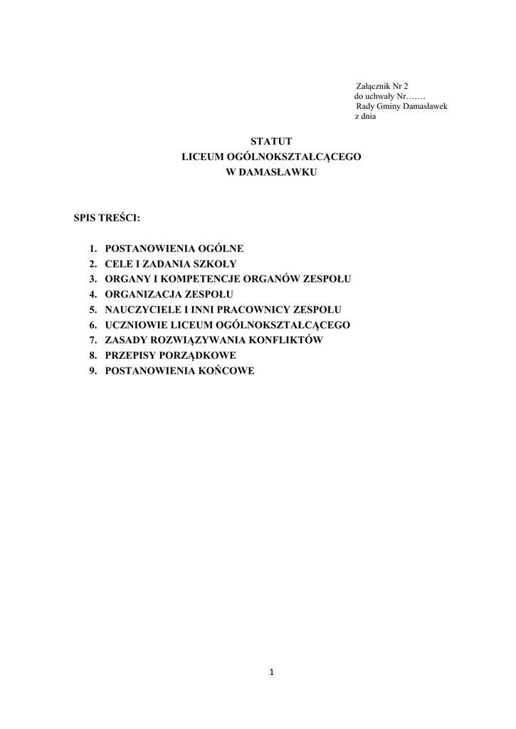 Załącznik Nr 2 do uchwały Nr……. Rady Gminy Damasławek z dnia STATUT LICEUM OGÓLNOKSZTAŁCĄCEGO W DAMASŁAWKU SPIS TREŚCI: 1. 2. 3. 4. 5. 6. 7. 8. 9. POSTANOWIENIA OGÓLNE CELE I ZADANIA SZKOŁY ORGANY I KOMPETENCJE ORGANÓW ZESPOŁU ORGANIZACJA ZESPOŁU NAUCZYCIELE I INNI PRACOWNICY ZESPOŁU UCZNIOWIE LICEUM OGÓLNOKSZTAŁCĄCEGO ZASADY ROZWIĄZYWANIA KONFLIKTÓW PRZEPISY PORZĄDKOWE POSTANOWIENIA KOŃCOWE 1 ROZDZIAŁ I POSTANOWIENIA OGÓLNE § l. 1. Szkoła nosi nazwę: Liceum Ogólnokształcące w Damasławku i wchodzi w skład Zespołu Szkół Powszechnych im. Pierwszych Piastów w Damasławku. 2. Organem prowadzącym Liceum Ogólnokształcące jest Gmina Damasławek. 3. Liceum Ogólnokształcące na podbudowie programowej gimnazjum. § 2. Siedziba Liceum Ogólnokształcącego znajduje się w Damasławku przy ul. Słoneczna 4. § 3. Liceum Ogólnokształcące działa w ramach obowiązującego prawa oświatowego. § 4. Liceum Ogólnokształcące rozpoczyna działalność od dnia l września 2014 r. § 5. Organem nadzoru pedagogicznego jest Wielkopolski Kurator Oświaty w Poznaniu. RODZIAŁ II CELE I ZADANIA SZKOŁY § 6.1. Do zadań w zakresie sprawowania funkcji wychowawczej szkoły należy w szczególności: 1) kształtowanie środowiska wychowawczego sprzyjającego realizowaniu celów i zasad określonych w ustawie i przepisach wykonawczych, stosownie do warunków Zespołu poprzez: a) systematyczne diagnozowanie i monitorowanie zachowań uczniów, b) realizowanie "Programu wychowawczego Zespołu", c) zapewnienie odpowiedniej bazy dla uczniów, 2) upowszechnianie zasad tolerancji, wolności sumienia i poczucia sprawiedliwości, 3) kształtowanie postawy patriotycznej (także w wymiarze lokalnym), 4) umożliwianie uczniom podtrzymania tożsamości narodowej, etnicznej, językowej i religijnej poprzez udział w konkursach przedmiotowych, sportowych, artystycznych, organizowanych uroczystościach szkolnych oraz samorządu uczniowskiego, 5) przejawianie szacunku do szanowania indywidualności uczniów i ich prawa do własnej oceny rzeczywistości, 6) rozbudzanie szacunku do pracy poprzez dobrze zorganizowaną pracę na rzecz Zespołu i społeczności lokalnej, 7) wdrażanie dyscypliny i punktualności. 2. Zespół wypracowuje i realizuje „Program wychowawczy" uchwalony przez Radę Pedagogiczną po zasięgnięciu opinii Rady Rodziców i Samorządu Uczniowskiego. 3.1. Do zadań w zakresie sprawowania funkcji dydaktycznej szkoły należy w szczególności: 1) umożliwianie zdobycia wiedzy i umiejętności (kompetencji) niezbędnych do uzyskania świadectwa ukończenia liceum, przygotowanie do pracy zawodowej i studiów wyższych, 2) pomoc przyszłym absolwentom w dokonaniu świadomego wyboru kierunku dalszego kształcenia poprzez: a) poradnictwo psychologiczno-pedagogiczne, b) organizowanie zajęć z pracownikami urzędu pracy i firm marketingowych, zakładami pracy w zakresie rekwalifikacji kadr, c) rozwijanie zainteresowań na zajęciach pozalekcyjnych, d) samokształcenie ogólne i techniczne, wyrobienie nawyków aktywności i przedsiębiorczości, e) realizacja zadań związanych z przyznawaniem tytułów kwalifikacyjnych zgodnych z odrębnymi przepisami, f) organizowanie spotkań z przedstawicielami wyższych uczelni, 3) podejmowanie działań w kierunku rozwijania zainteresowań uczniów poprzez organizowanie kół zainteresowań, imprez sportowych, olimpiad i konkursów przedmiotowych, 4) zapewnianie wszechstronnej pomocy uczniom mającym trudności z opanowaniem treści programowych, 5) atrakcyjny i nowatorski proces nauczania. 4.1. Do zadań w zakresie sprawowania funkcji opiekuńczej nad uczniami szkoły należy w szczególności: 1) organizowanie zajęć świetlicowych, 2) umożliwienie spożywania posiłków. 2. Wykonywanie zadań opiekuńczych polega w szczególności na: 1) ścisłym respektowaniu obowiązujących w szkole ogólnych przepisów bezpieczeństwa i higieny pracy. 3. Zadania opiekuńcze opierają się m.in. na następujących zasadach: 1) opiece nad uczniami przebywającymi w szkole podczas zajęć obowiązkowych, nadobowiązkowych i pozalekcyjnych oraz poza terenem szkoły w trakcie wycieczek organizowanych przez szkołę odpowiada nauczyciel prowadzący te zajęcia lub kierownik wycieczki. Za dowóz na miejsce zbiórki i odbiór dzieci po wycieczce odpowiadają rodzice, 2) zapewnieniu bezpieczeństwa uczniom przed rozpoczęciem lekcji oraz w czasie przerw międzylekcyjnych odpowiadają nauczyciele, zgodnie z opracowanym harmonogramem i regulaminem dyżurów. Dyżur rozpoczyna się 15 minut przed rozpoczęciem zajęć i kończ po przerwie ostatniej lekcji, nauczycielowi nie wolno pozostawić dzieci bez opieki, 3) uczniom, którym z powodu warunków rodzinnych lub losowych potrzebne są szczególne formy opieki, szkoła w miarę swoich możliwości zapewnia stałą bądź doraźną pomoc materialną. Współpracuje w tym zakresie z ośrodkami pomocy społecznej i centrum pomocy rodzinie, 4) zapewnieniu bezpieczeństwa uczniom przebywającym w bibliotece odpowiada bibliotekarz, a przebywających w świetlicy odpowiada pracownik prowadzący zajęcia świetlicowe, 5) zapewnieniu bezpieczeństwa uczniom po dzwonku kończącym przerwę odpowiada nauczyciel rozpoczynający kolejną lekcję, 6) zapewnieniu bezpieczeństwa uczniom podczas wycieczek odpowiadają: kierownik wycieczki i opiekunowie. Kierownik wycieczki zapewnia odpowiednią do wieku ucznia i liczebności grupy liczbę opiekunów, 7) w celu zapewnienia bezpieczeństwa i przeciwdziałania przemocy, uzależnieniom, demoralizacji oraz innymi przejawami patologii społecznej wśród dzieci i młodzieży w obiekcie szkolnym prowadzony jest monitoring oraz nadzór nauczyciela wychowawcy. § 7. Program wychowawczy Liceum Ogólnokształcącego wchodzącego w skład Zespołu stanowi załącznik nr 1 do Statutu Zespołu Szkół Powszechnych w Damasławku. § 8. Zadania zespołów nauczycielskich polegają w